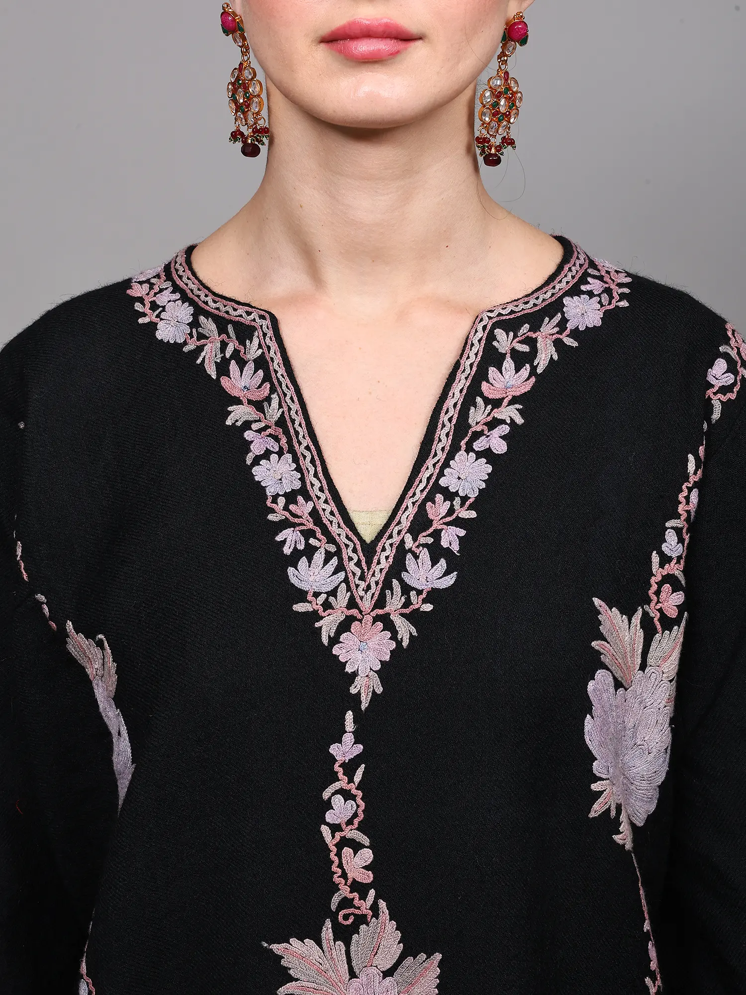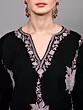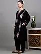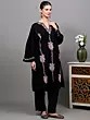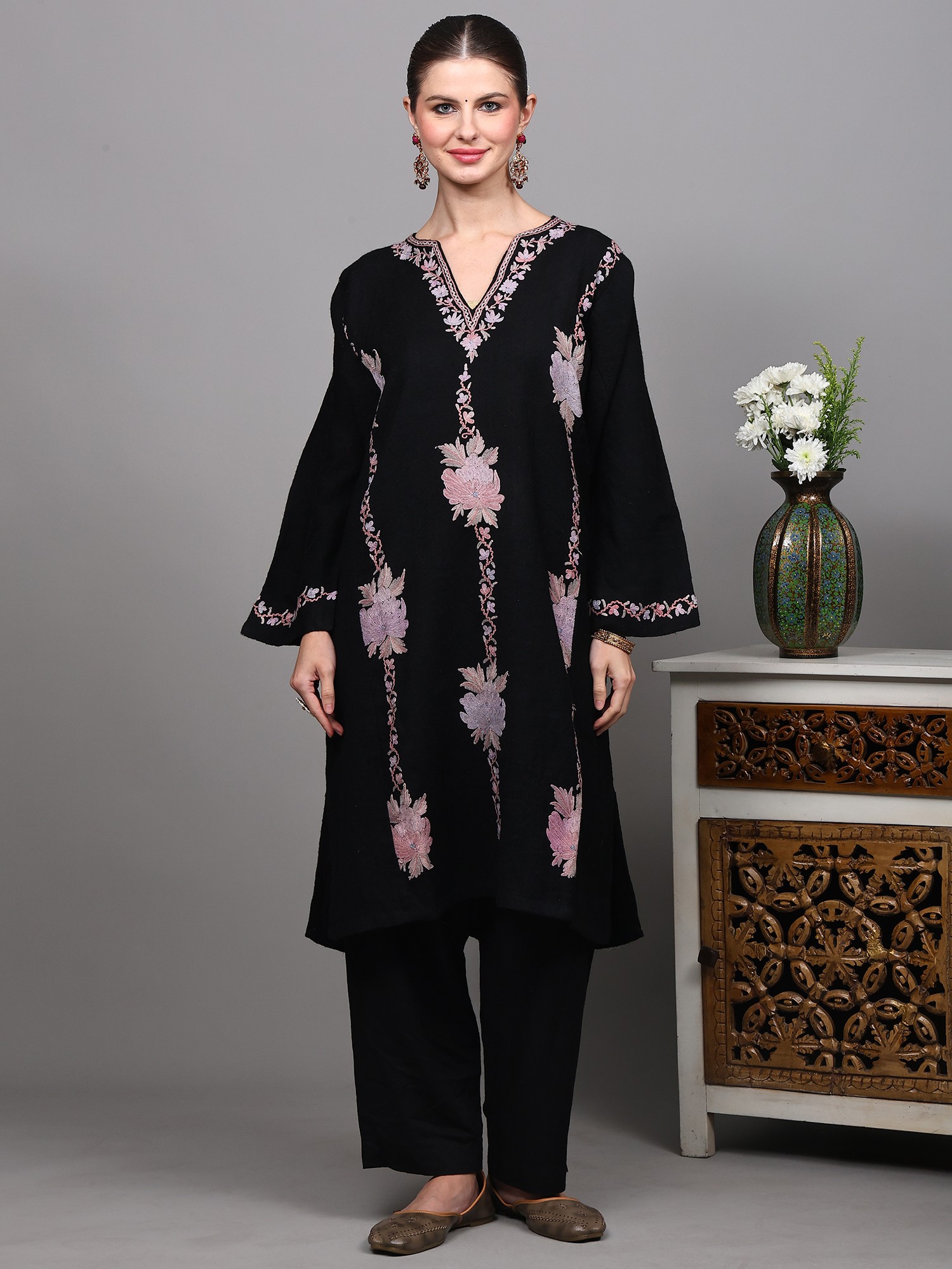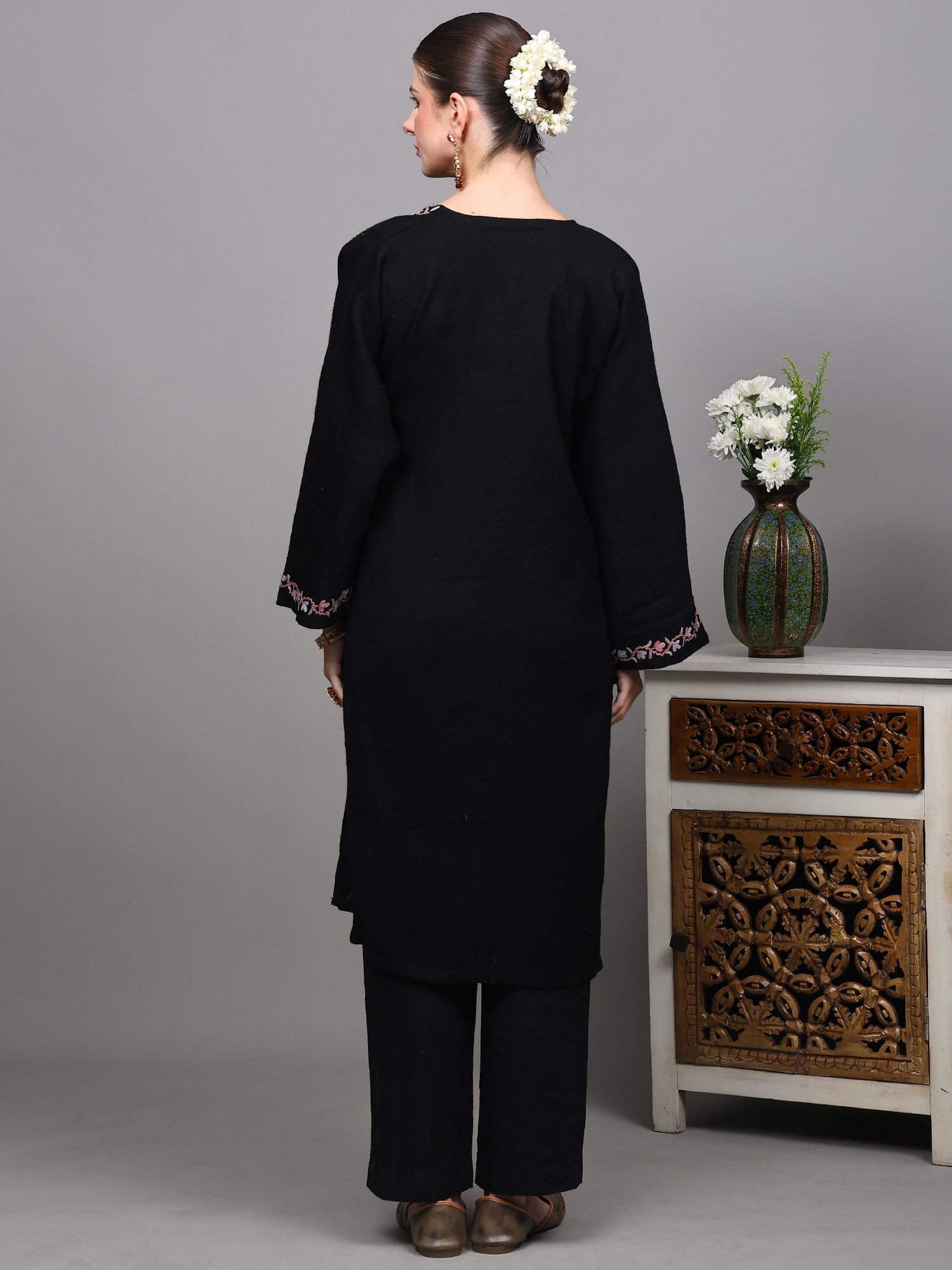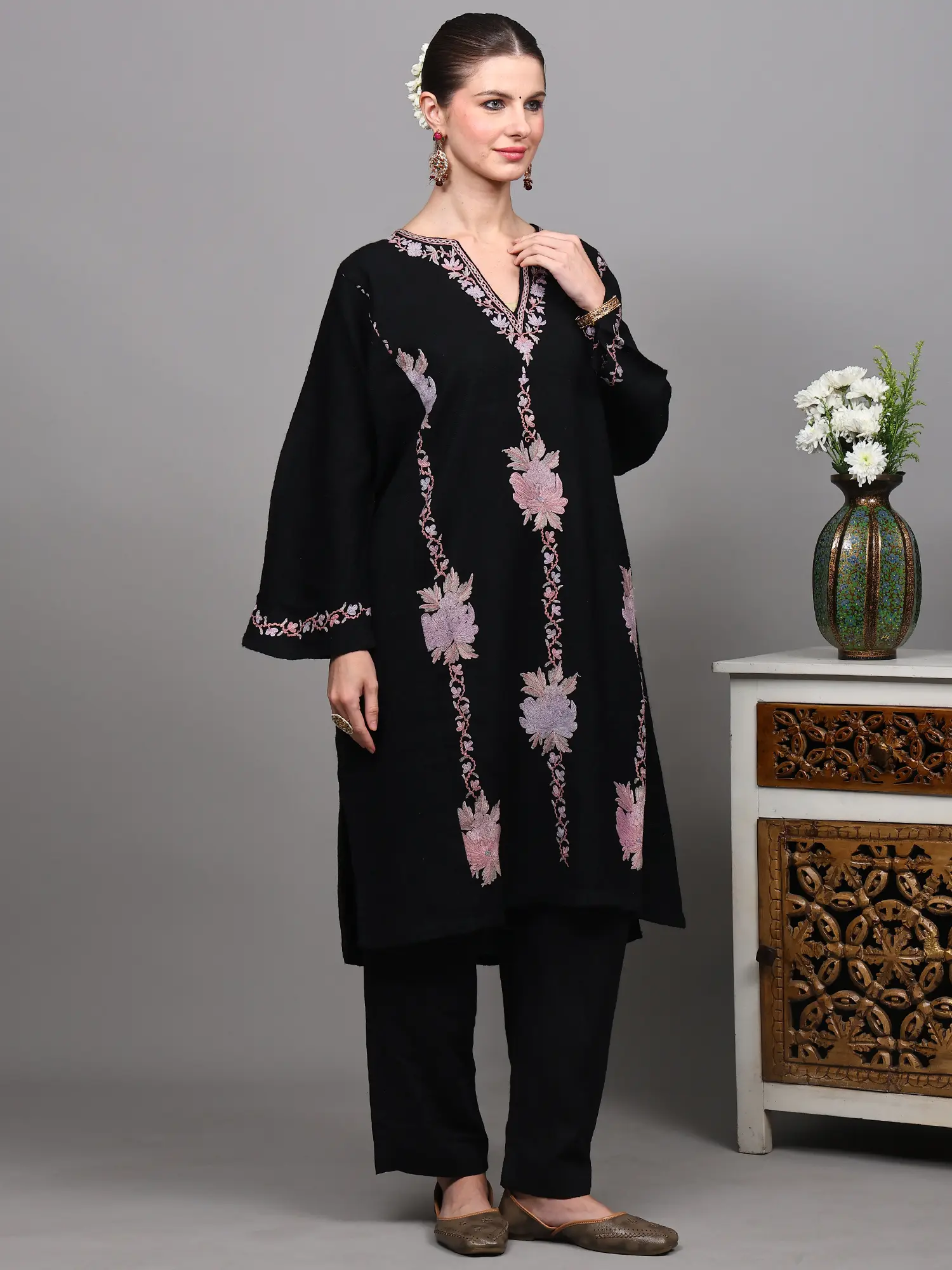 This black Kashmiri phiran is a truly versatile piece that can be styled in numerous ways. Pair it with matching black trousers for a classic and cohesive look, as shown, or experiment with contrasting leggings or even a skirt for a more contemporary vibe. Accessorize with traditional jewelry and elegant footwear to complete your ensemble. Whether you're attending a festive gathering, enjoying a quiet evening at home, or stepping out for a casual brunch, this phiran promises to keep you looking effortlessly chic and feeling wonderfully comfortable. It’s a timeless garment that celebrates cultural heritage and brings a touch of artisanal luxury to your everyday style.