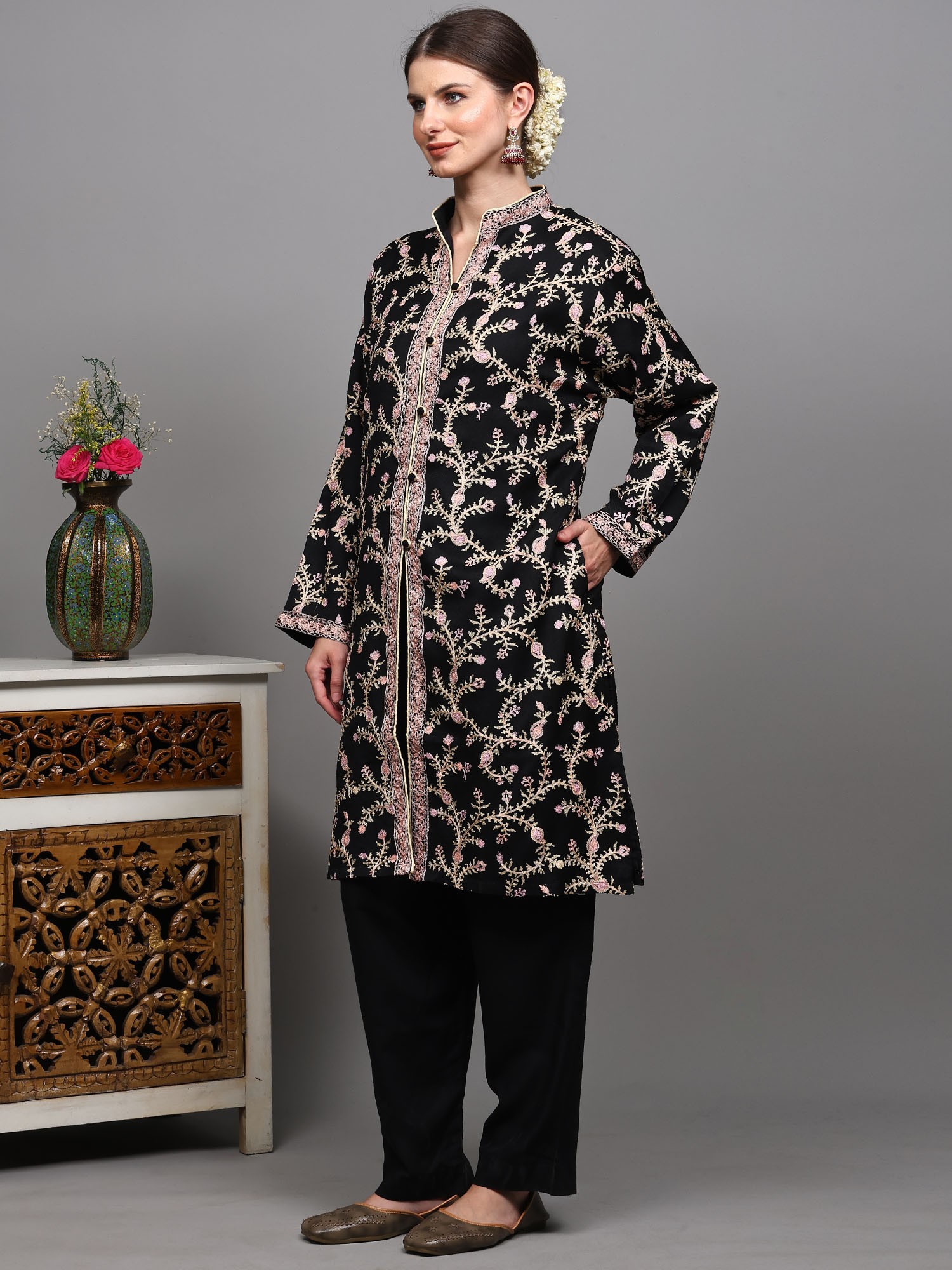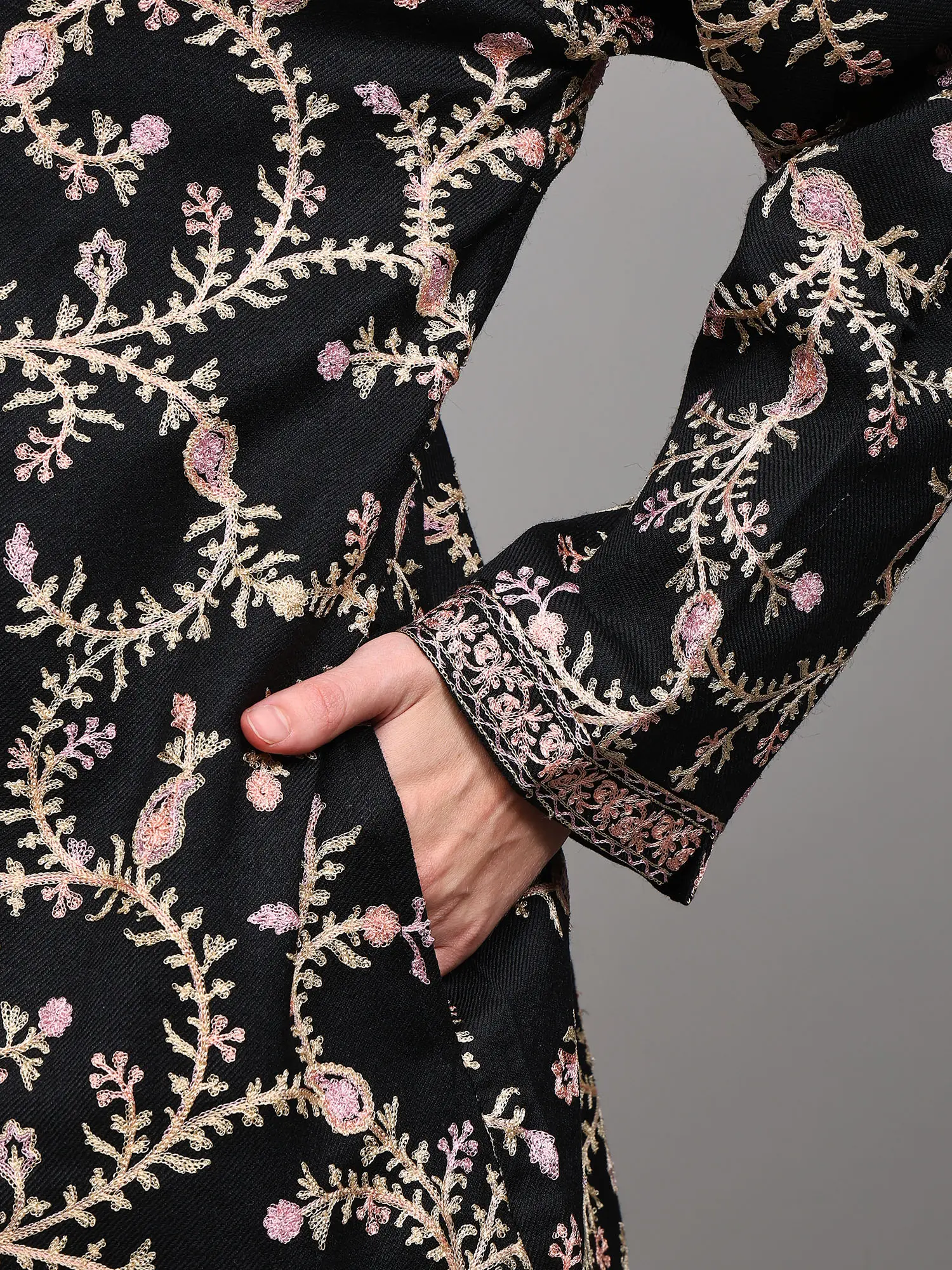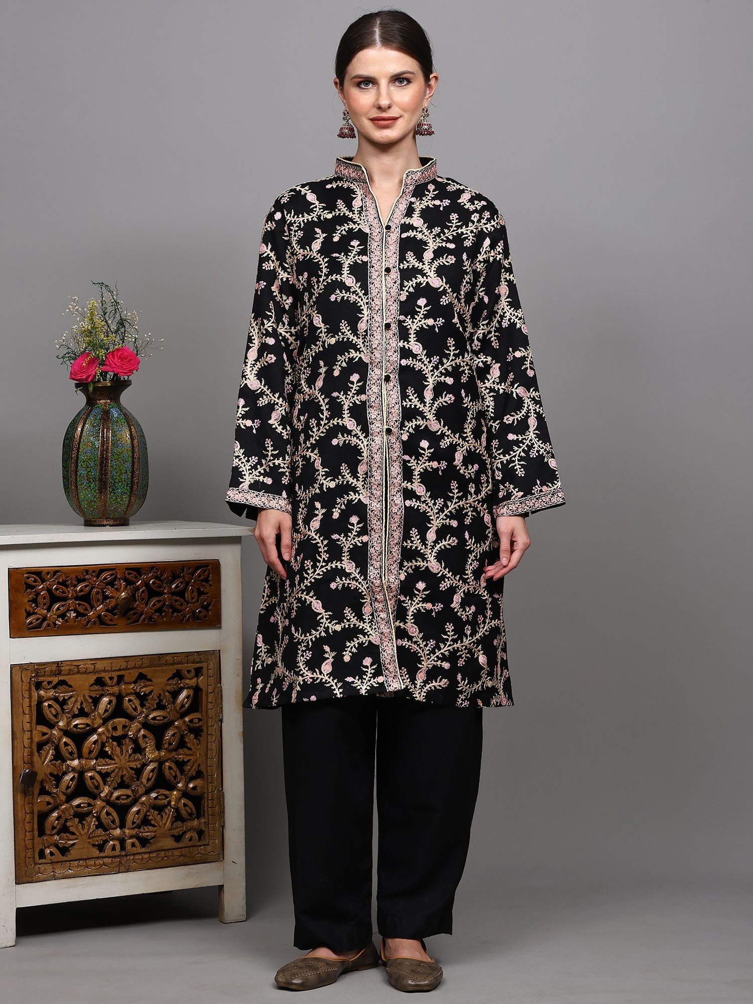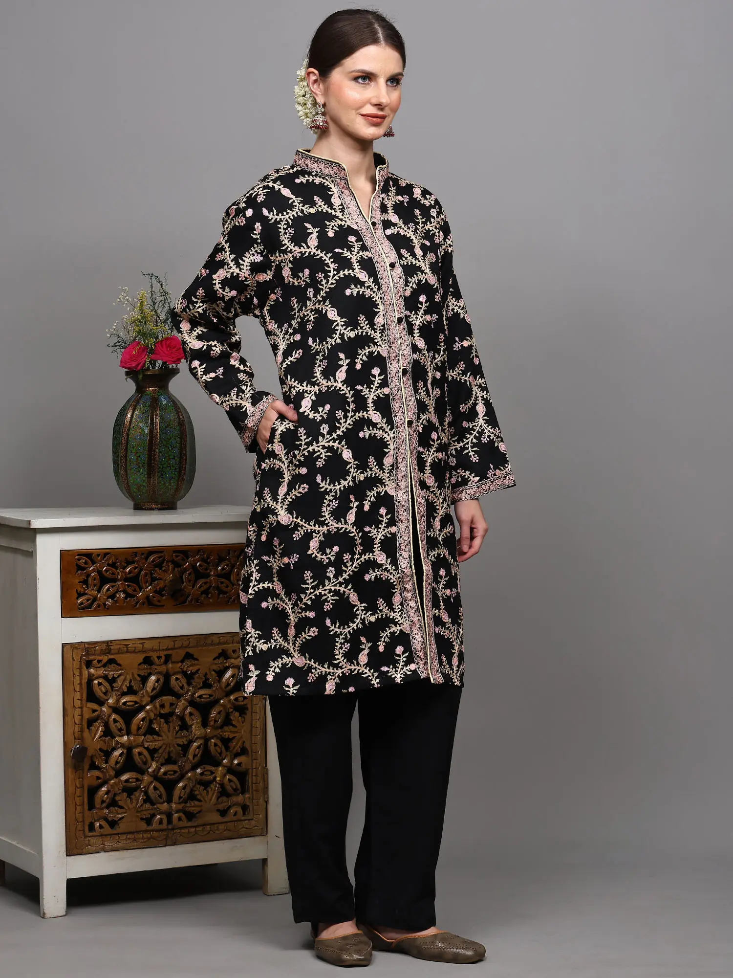 Woolen Charcoal Black with White Detailed Aari Embroidered Long Jacket from Kashmir