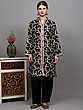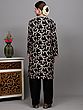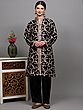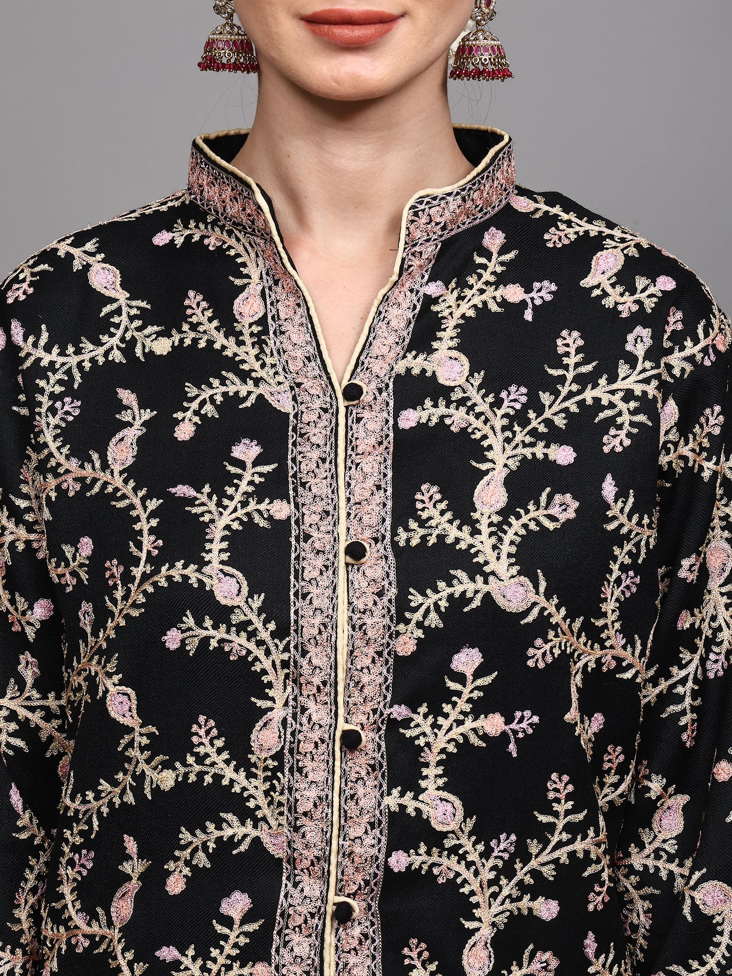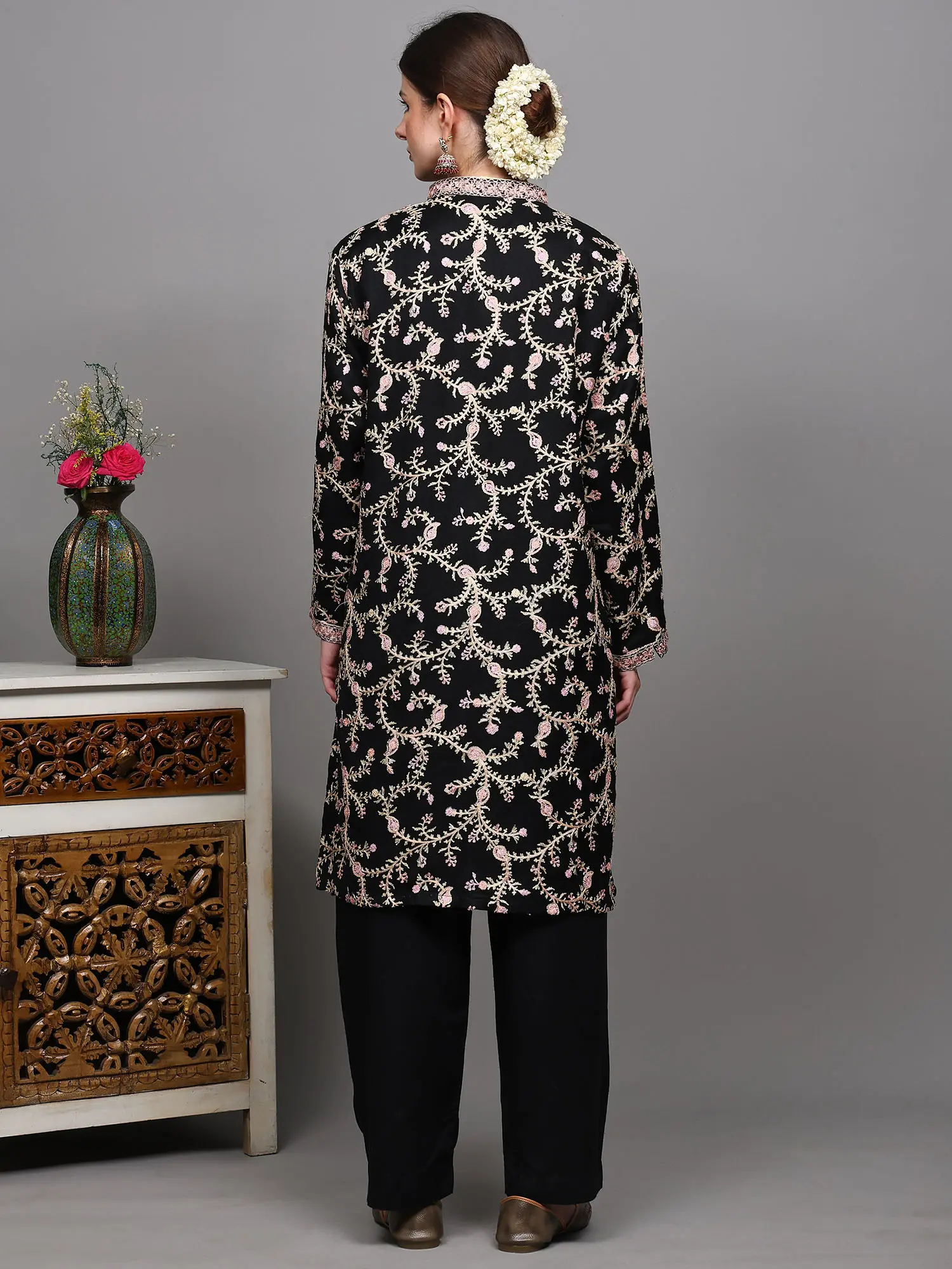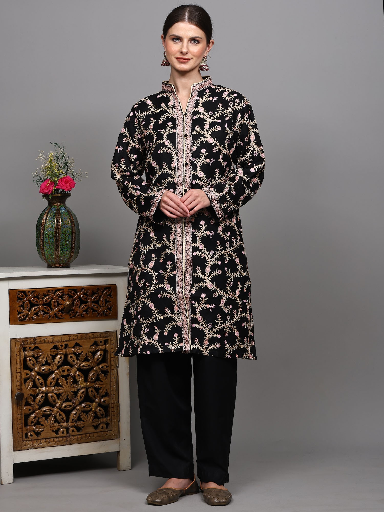 Woolen Charcoal Black with White Detailed Aari Embroidered Long Jacket from Kashmir