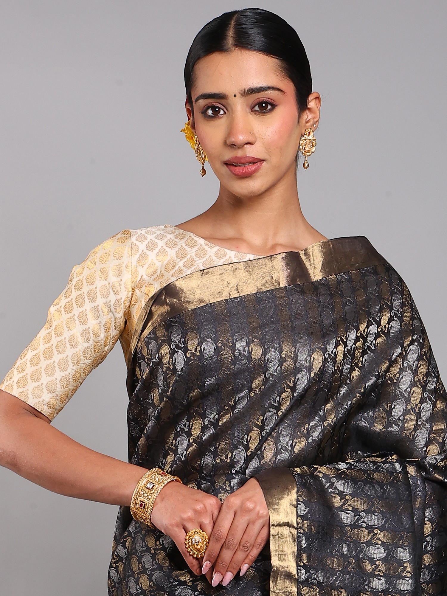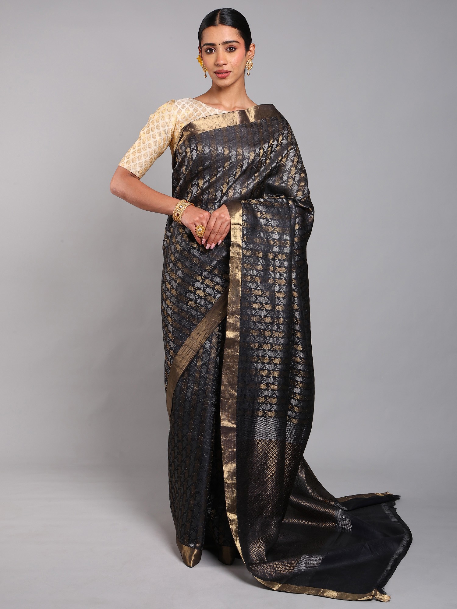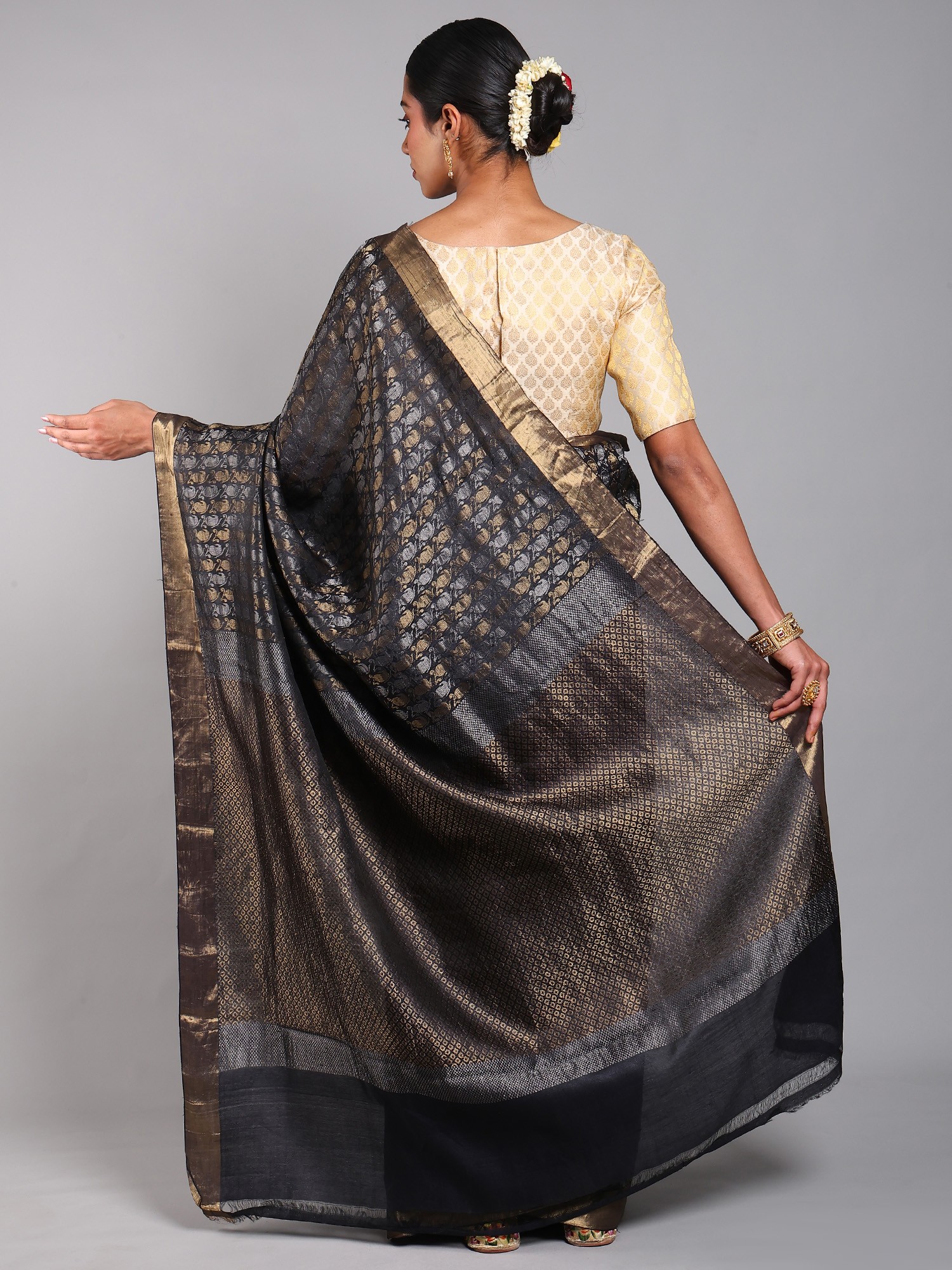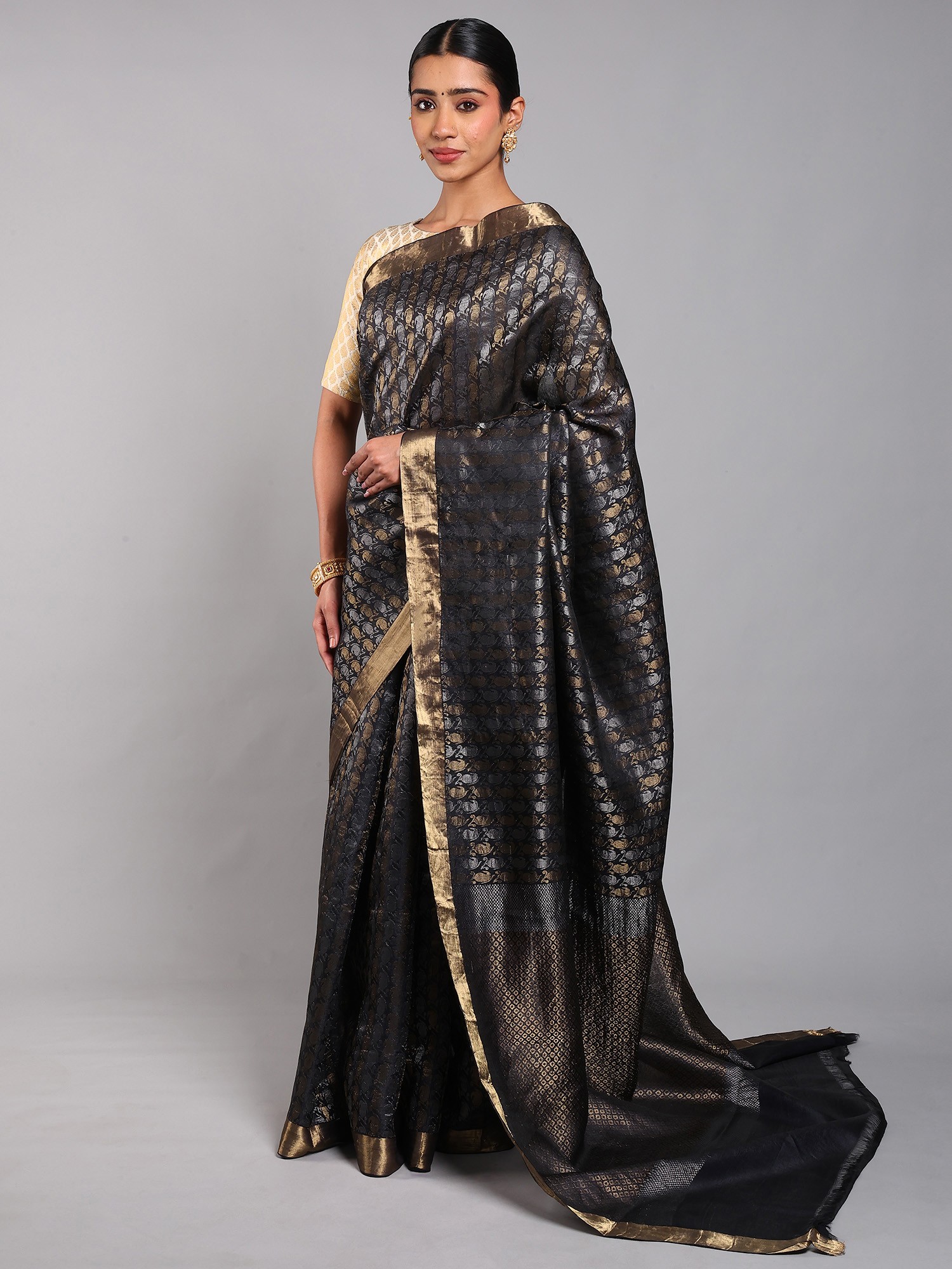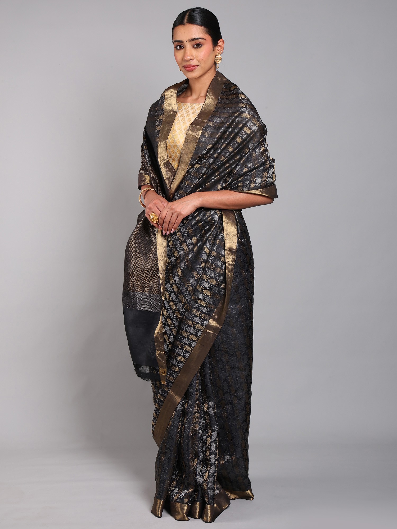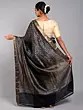 Black Designer Sari with Metallic Thread Embroidered Flowers and Patch Border