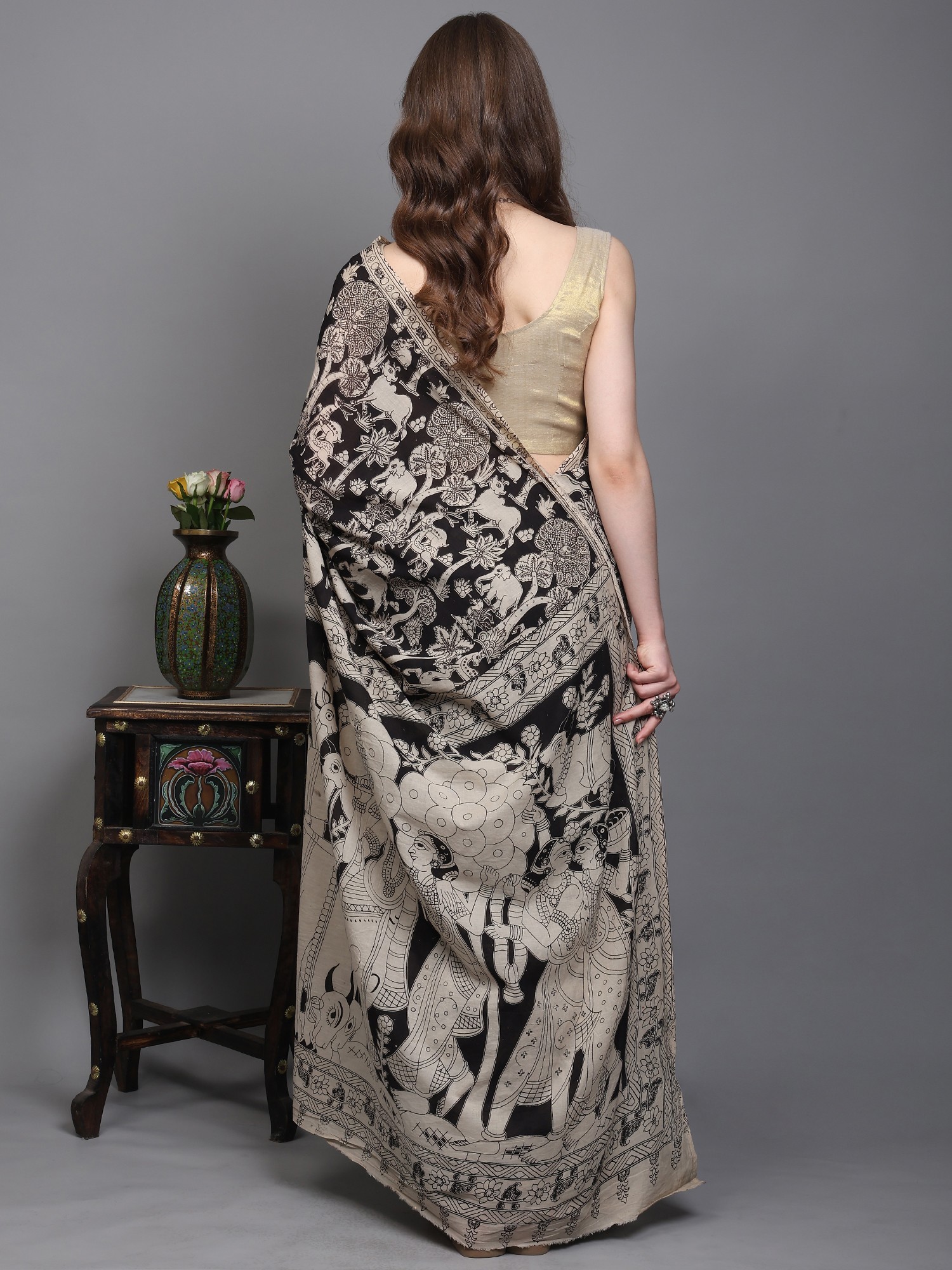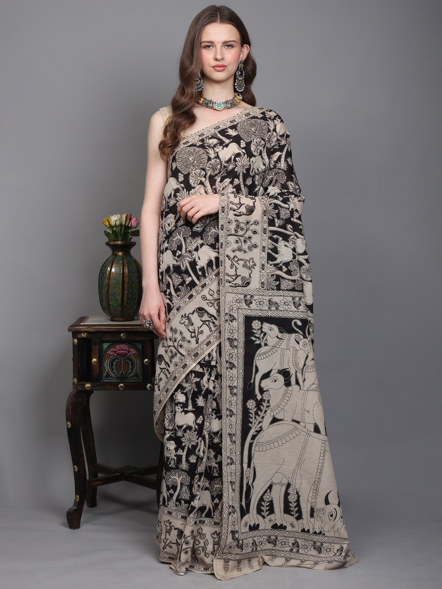 Multicolor Tussar Silk Hand Painted Pen Kalamkari Saree With Designer Pallu