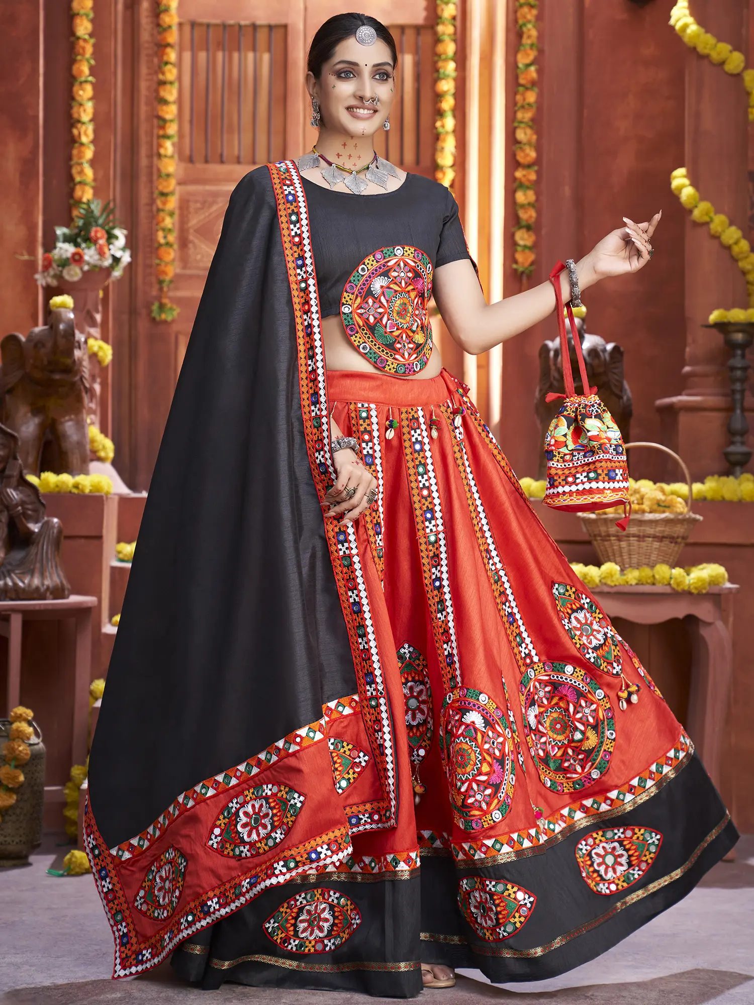 Pirate-Black Lehenga Choli from Gujarat with Embroidered Long Patch in Multicolor Thread and Mirrors