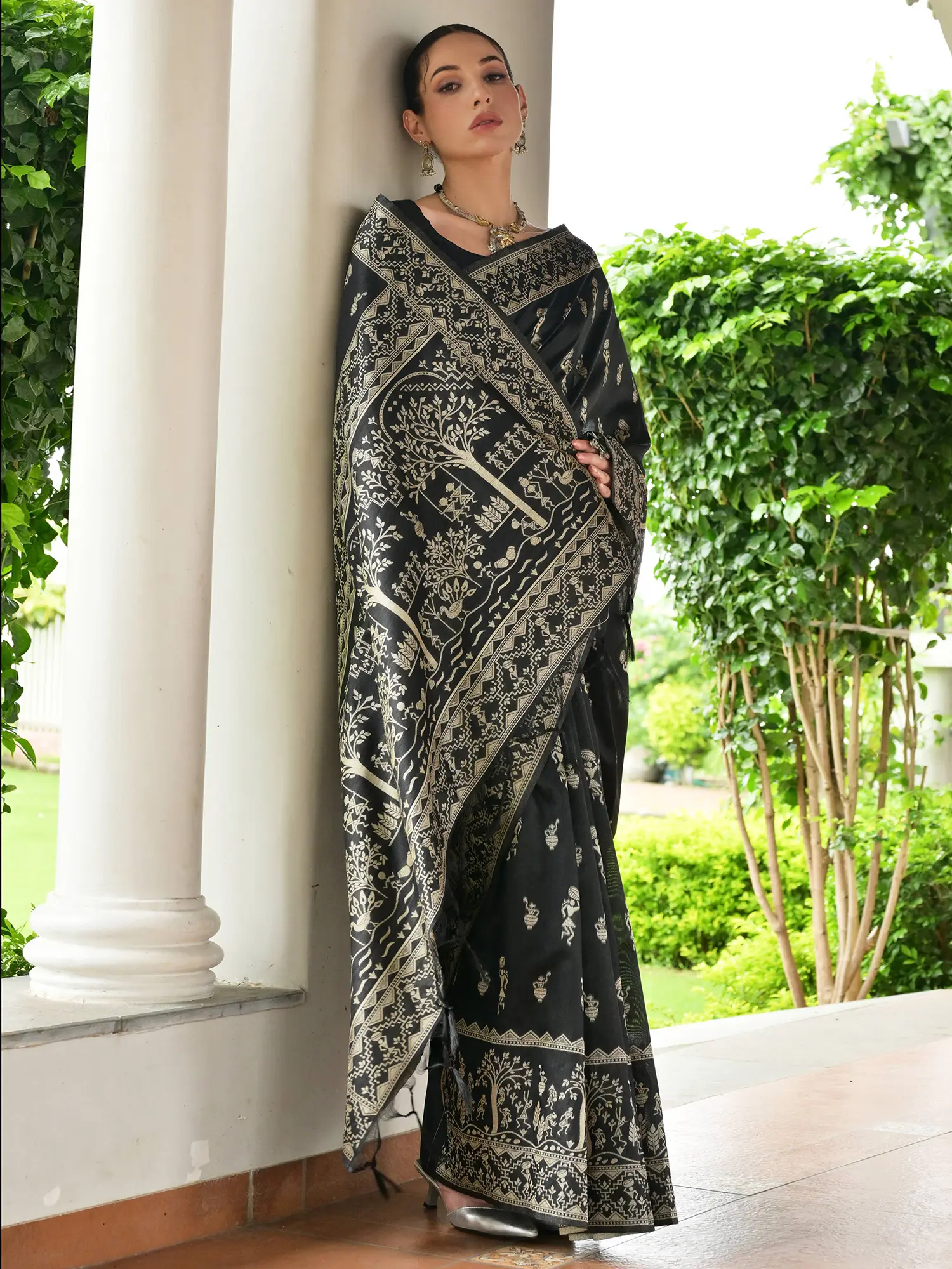 Designed for festive wear, this saree is the epitome of ethnic charm and refined style. Whether you are attending a wedding, a traditional ceremony, or a grand cultural event, this saree promises to make a memorable statement. Pair it with traditional gold jewelry and complementary accessories to complete a look that is both classic and contemporary. The versatility of the black base allows for a wide range of jewelry choices, enabling you to personalize your ensemble and express your unique sense of style. Embrace the spirit of celebration with this magnificent woven wonder, and let its timeless beauty illuminate your special moments.