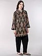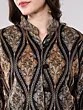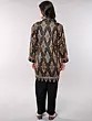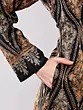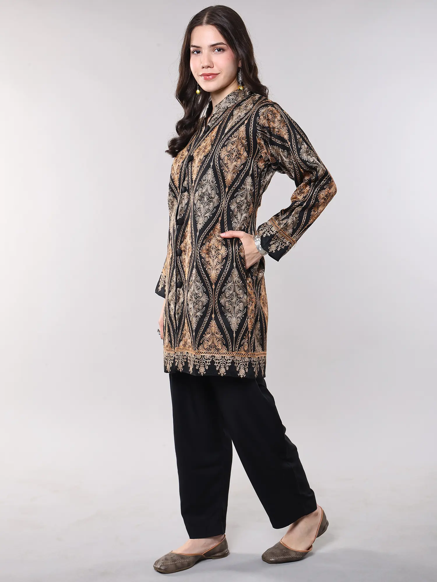 The rich, black-sand hue of the wool provides a dramatic canvas for the elaborate gold-toned embroidery that adorns the entire piece. You’ll notice the sophisticated pattern extends across the collar, front, and cuffs, creating a cohesive and visually stunning aesthetic. The jacket's silhouette is designed for a flattering fit, with a generous bust of 42 inches and a length of 36 inches, offering graceful coverage. The shoulder measurement of 16.5 inches and a sleeve length of 21 inches ensure a comfortable and chic drape.