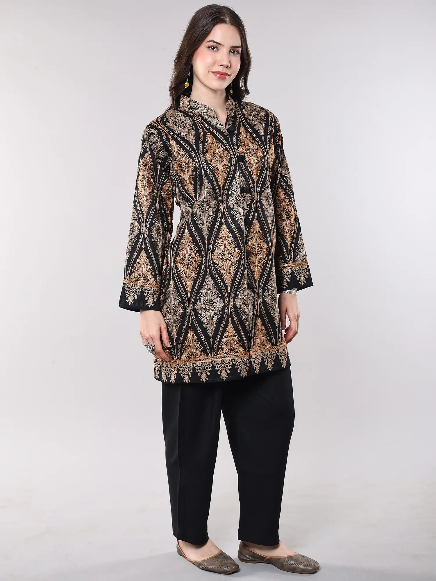Pirate-Black Wool Long Jacket with All-Over Aari Embroidered Maple Vines from Kashmir