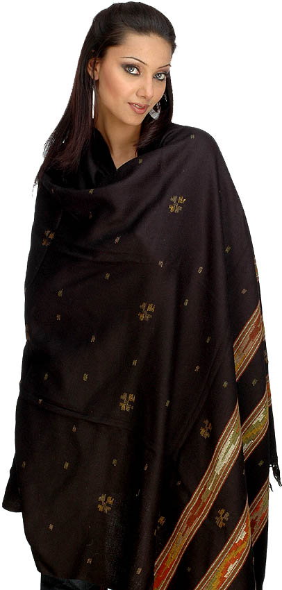 Caviar-Black Plain Shawl from Kullu with Kinnauri Woven Border