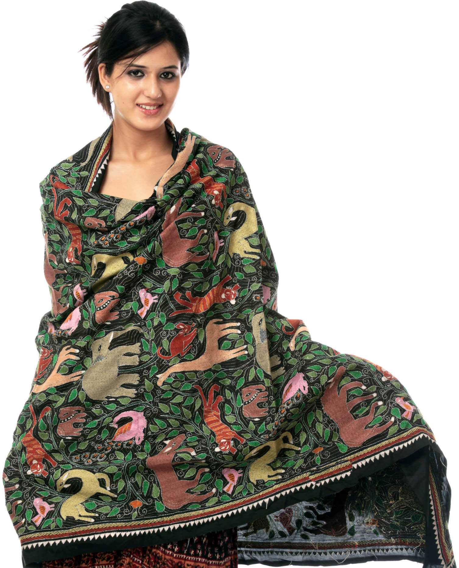 Black Shawl with Kantha Stitch Embroidered Wildlife