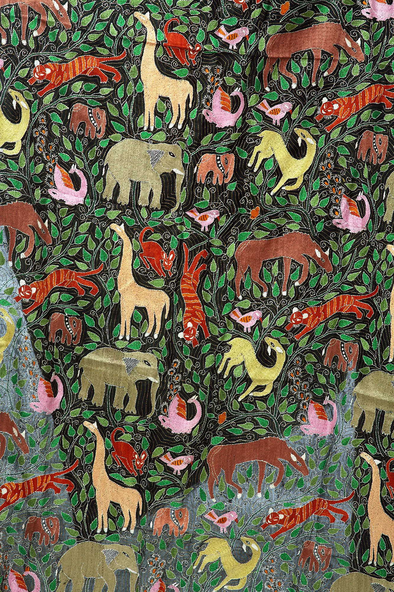 Immerse yourself in the captivating beauty of this exquisite pure silk shawl, a true masterpiece of artisanal craftsmanship. The rich black silk serves as a dramatic canvas for a vibrant and detailed wildlife scene, meticulously brought to life through the traditional art of Kantha stitch embroidery. This shawl is more than an accessory; it's a wearable work of art that tells a story of nature's untamed spirit.