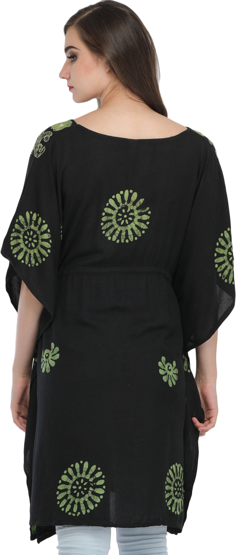 Step into elegance with a black short batik kaftan from Kashmir, delicately adorned with thread embroidery. This exquisite garment combines the rich tradition of Kashmiri batik with intricate embroidery, creating a timeless and sophisticated piece.