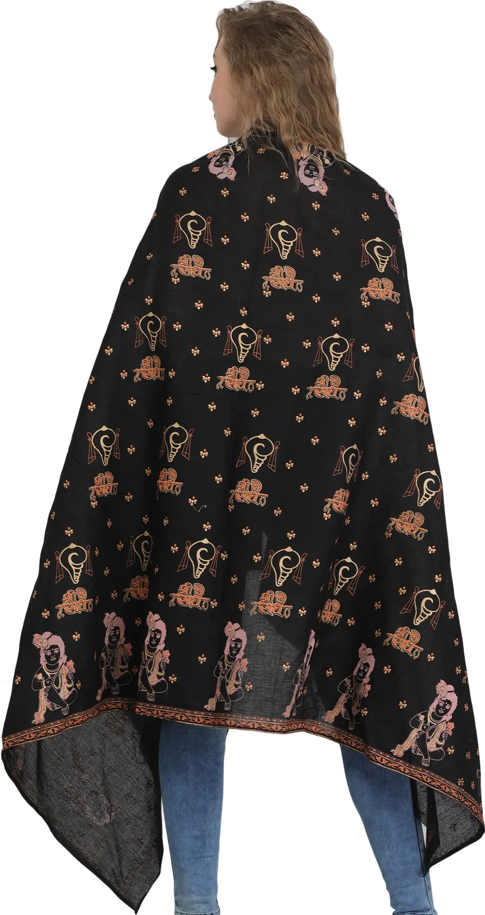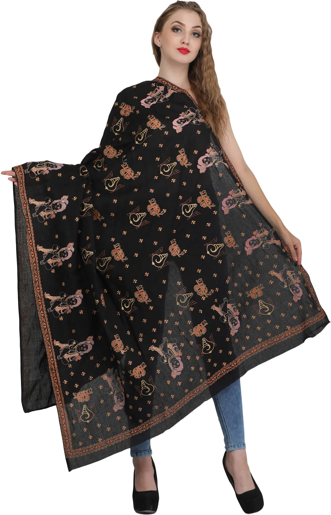 Black Kashmiri Stole with Aari Embroidered Flowers by Hand