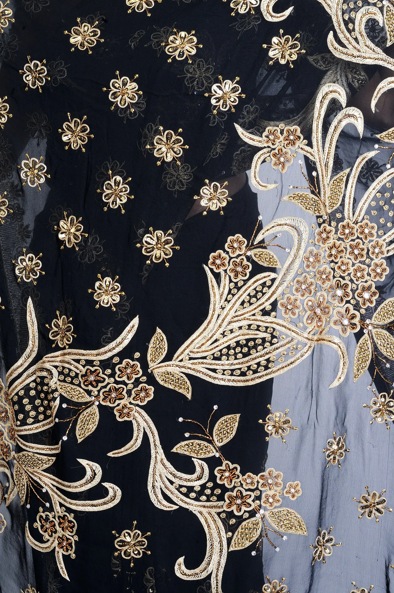 Step into a realm of timeless sophistication with this exquisite black chiffon sari, a masterpiece designed for your most cherished moments. Crafted from the finest chiffon, this sari drapes beautifully, offering a delicate and airy feel that moves with ethereal grace. The deep black canvas serves as a dramatic backdrop for the intricate artistry that defines this piece, making it an unforgettable choice for weddings, galas, and any occasion where you wish to make a grand statement.