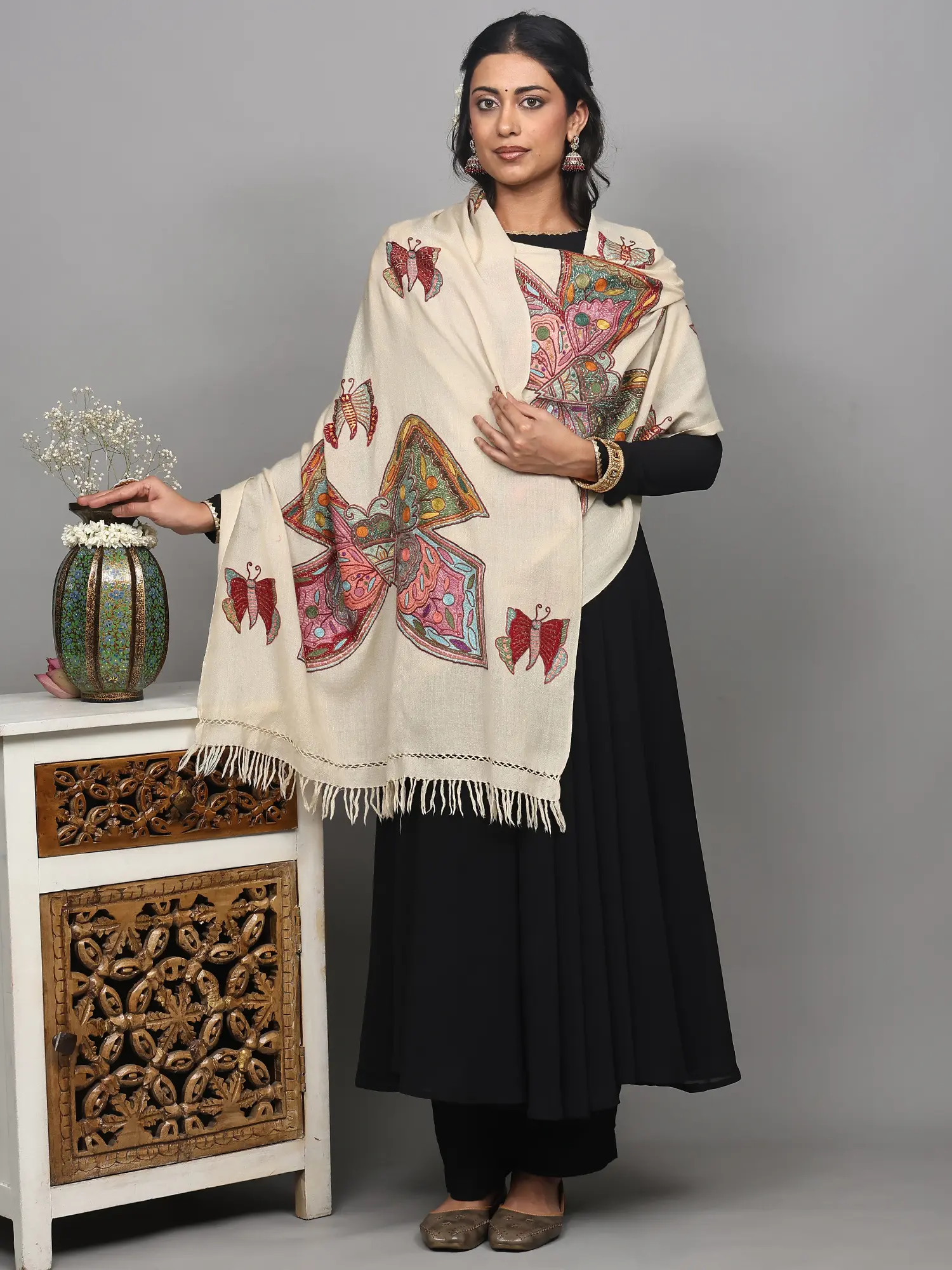 The soul of this stole lies in its captivating Aari hand embroidery. This intricate and time-honored technique, passed down through generations of Kashmiri artisans, brings to life a whimsical tableau of fluttering butterflies. Each butterfly is a masterpiece in miniature, meticulously rendered with a dazzling array of colorful threads. The delicate wings are detailed with tiny stitches, creating a rich tapestry of textures and hues. From vibrant blues and radiant pinks to sunny yellows and emerald greens, the color palette is a feast for the eyes, evoking the joyous flutter of these winged wonders in a blooming meadow. The central motif, a large, gloriously detailed butterfly, acts as the heart of the design, radiating its beauty outwards to the smaller, equally enchanting butterflies scattered across the expanse of the stole.