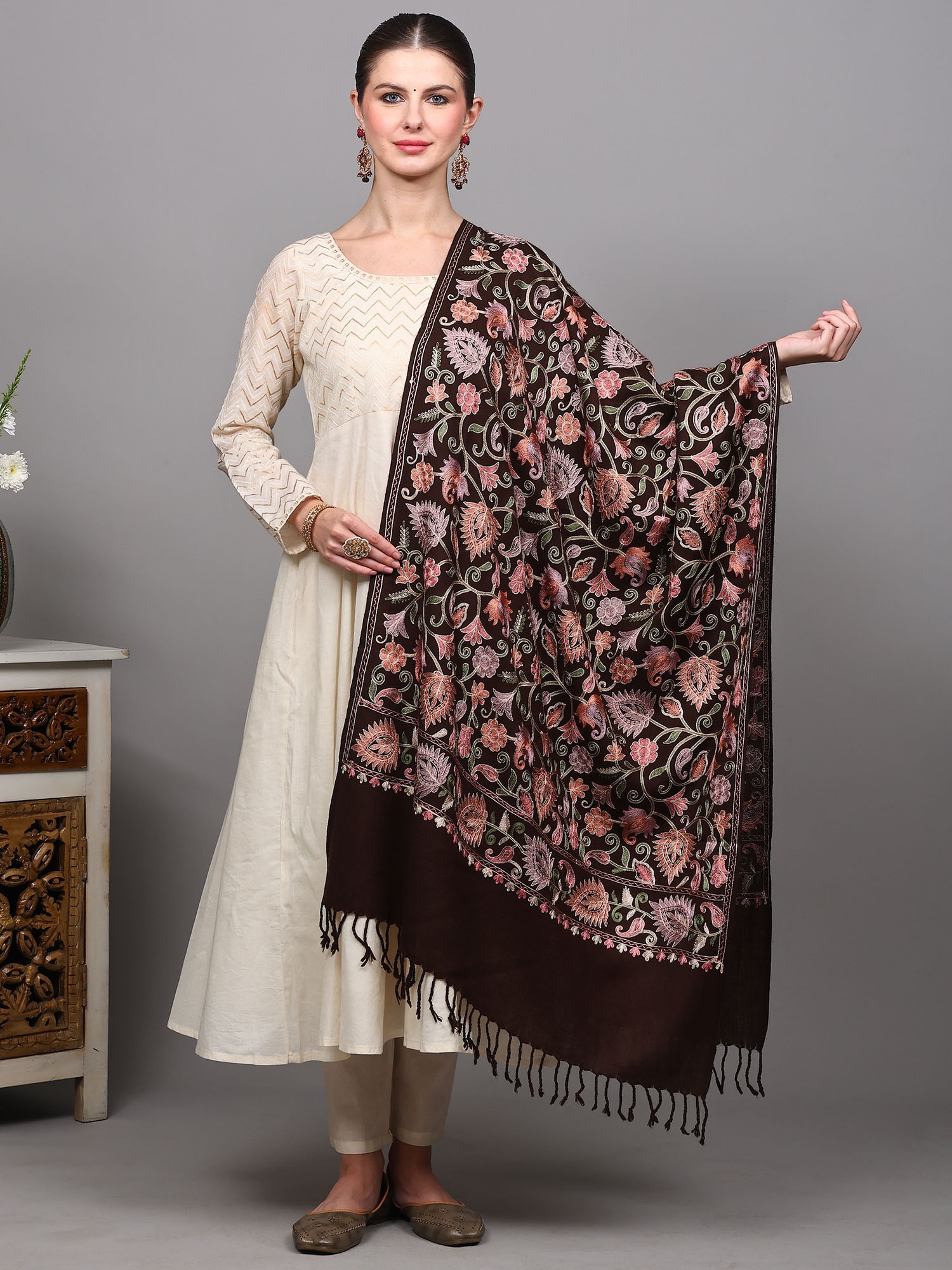 Signal-Brown Stole with Chain Stitch Embroidered Floral Vine