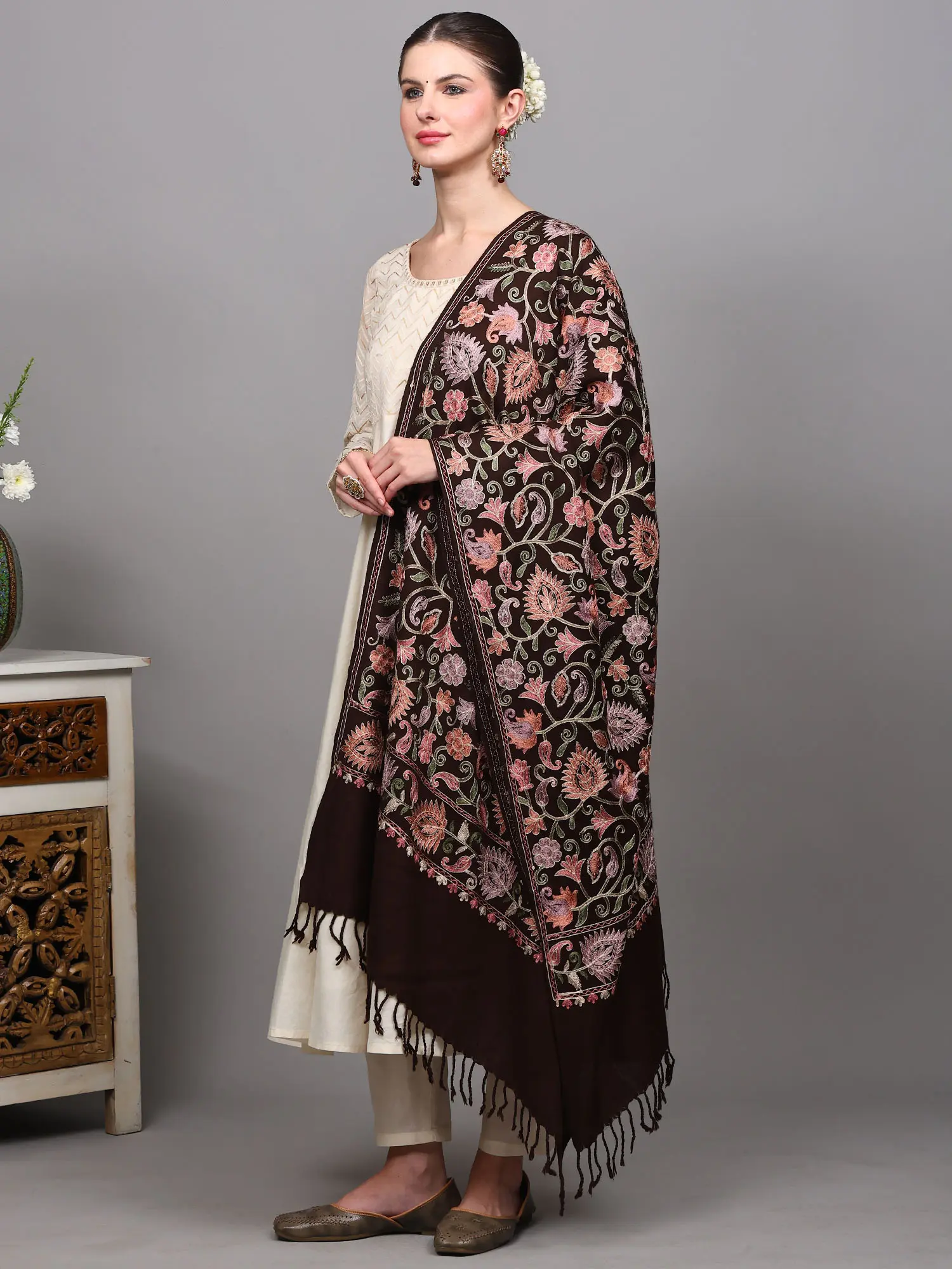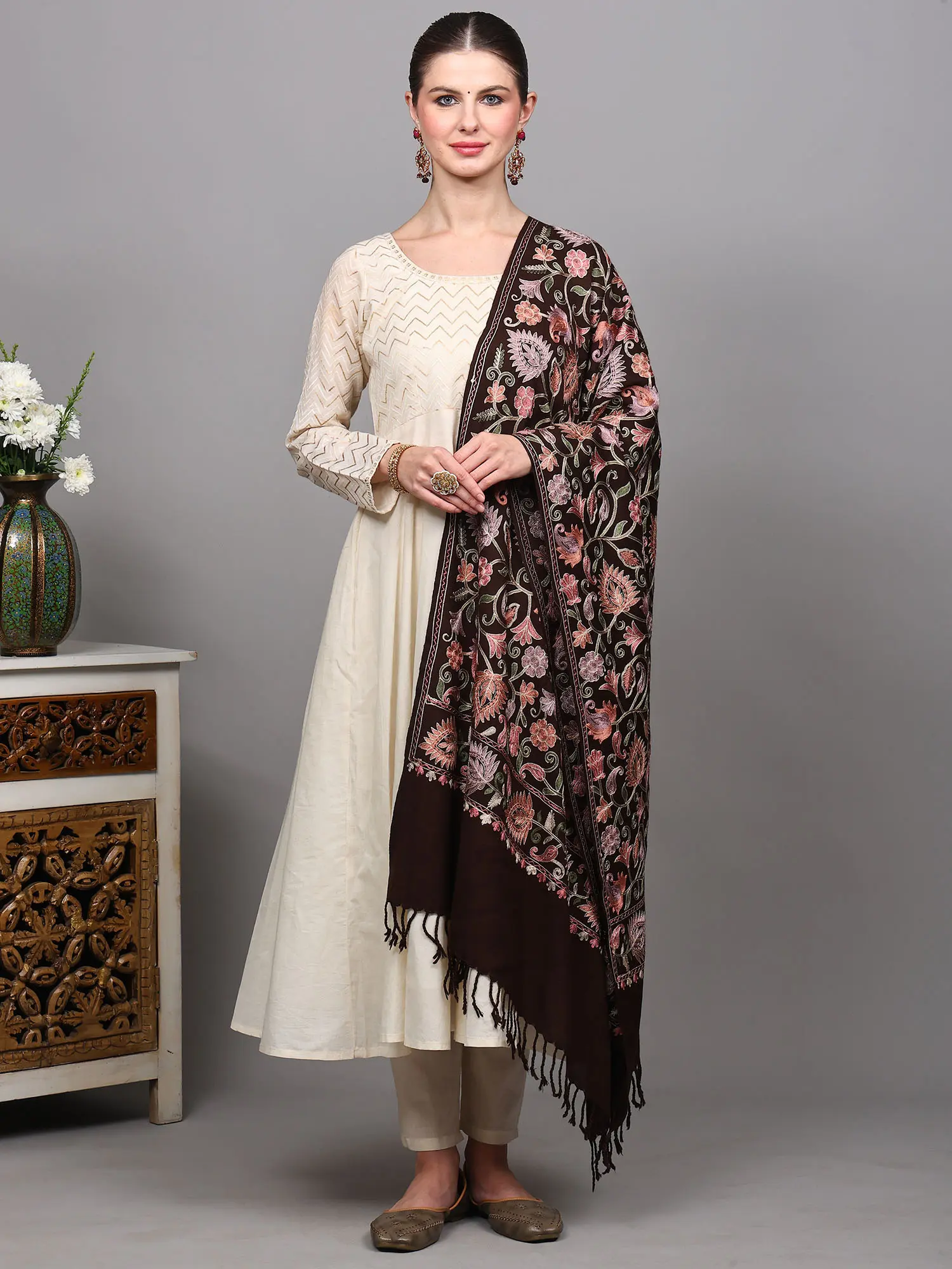 Amritsar Wool Stole featuring Chain Stitch Floral Jaal Embroidery