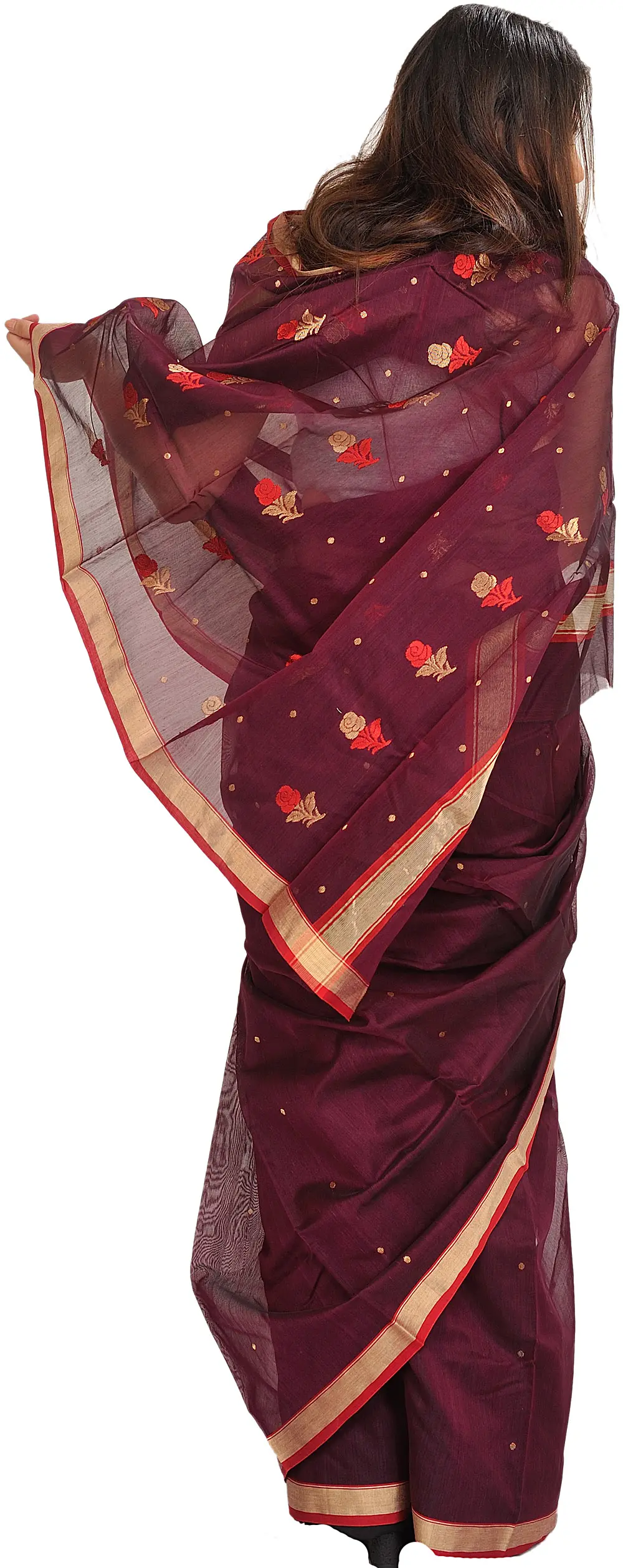 This Blackberry-Wine Chanderi Saree, adorned with exquisite zari-woven roses and a gleaming golden border harmoniously marries traditional Indian motifs, featuring delicate butis on the body alongside European fragrant roses gracing the pallu. The play of red and golden stripes on the pallu adds a mesmerizing dimension. Crafted from luxurious cotton silk, its touch is as sumptuous as its appearance. Draped in this saree, you'll radiate a blend of heritage and elegance, capturing the essence of cultural fusion. Perfect for celebrations, it's a symphony of artistry and comfort, making every step a graceful dance.