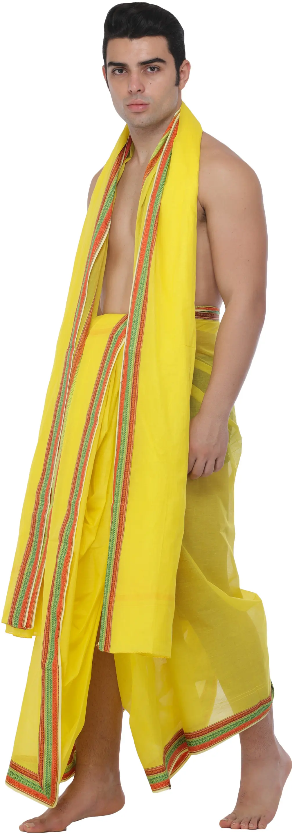Dhoti and Angavastram Set with Wide Golden Border (Ready to Wear)