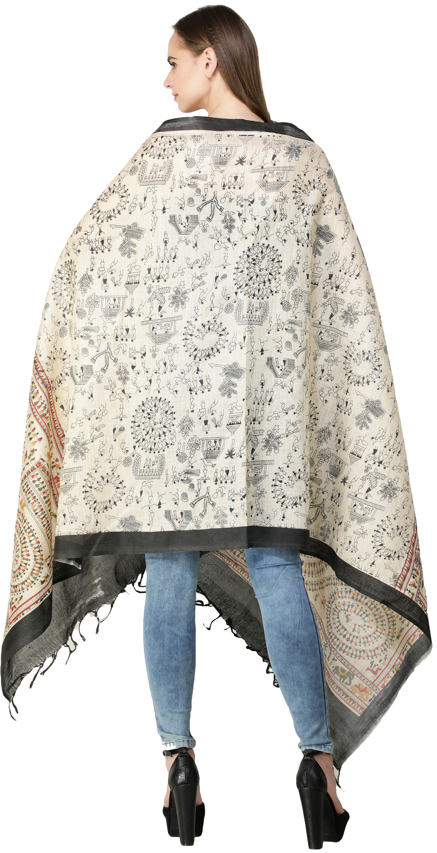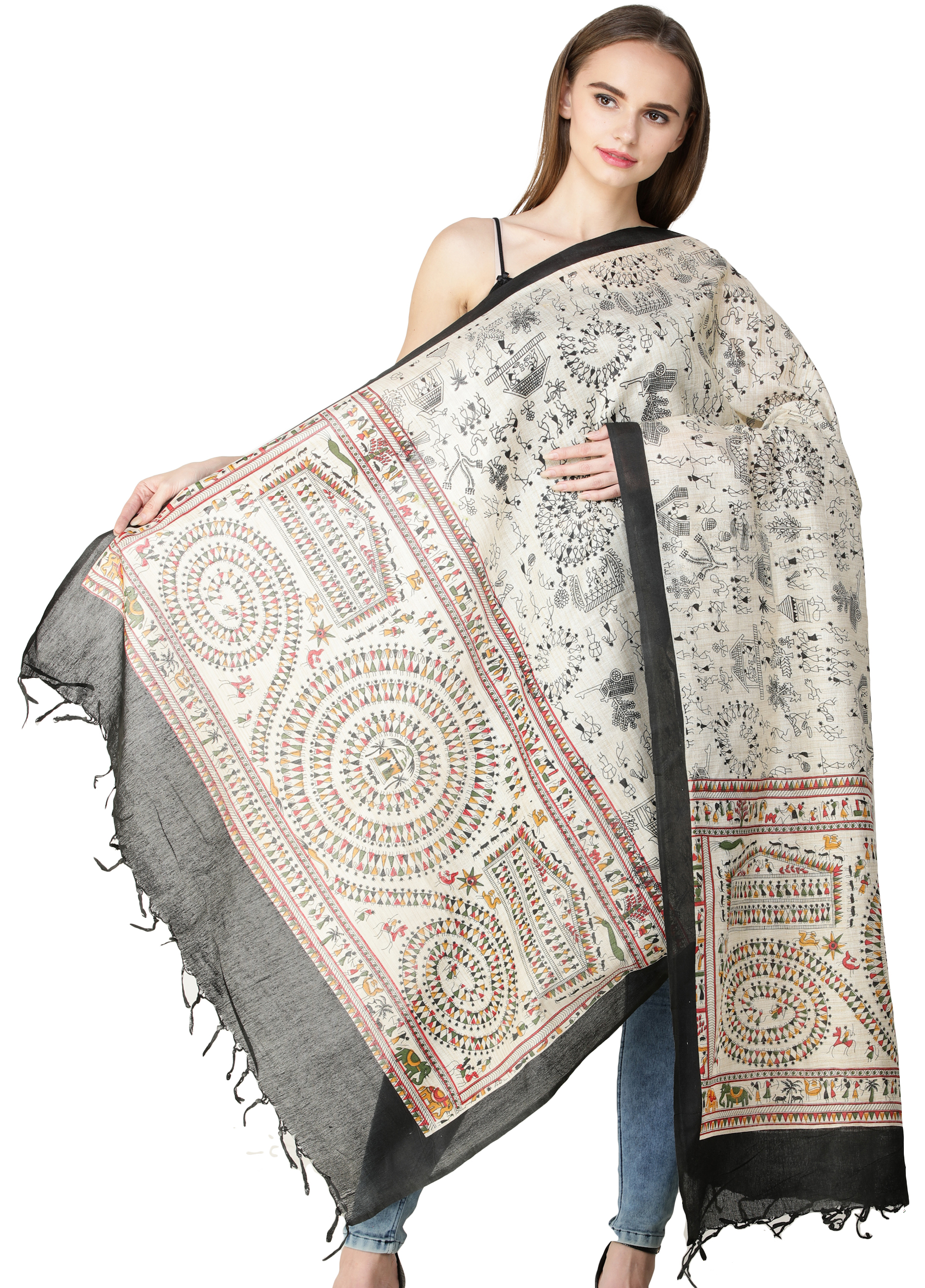 Art Silk Dupatta with Printed Folk Figures Inspired by Warli Art