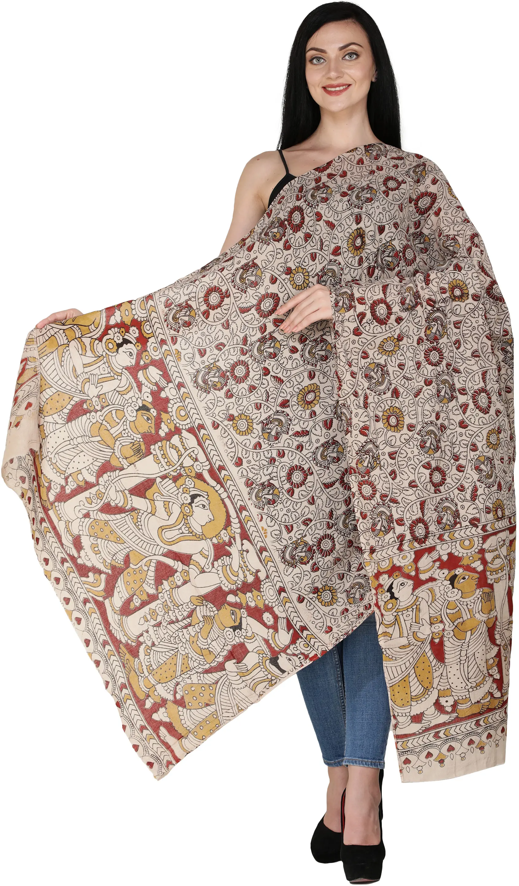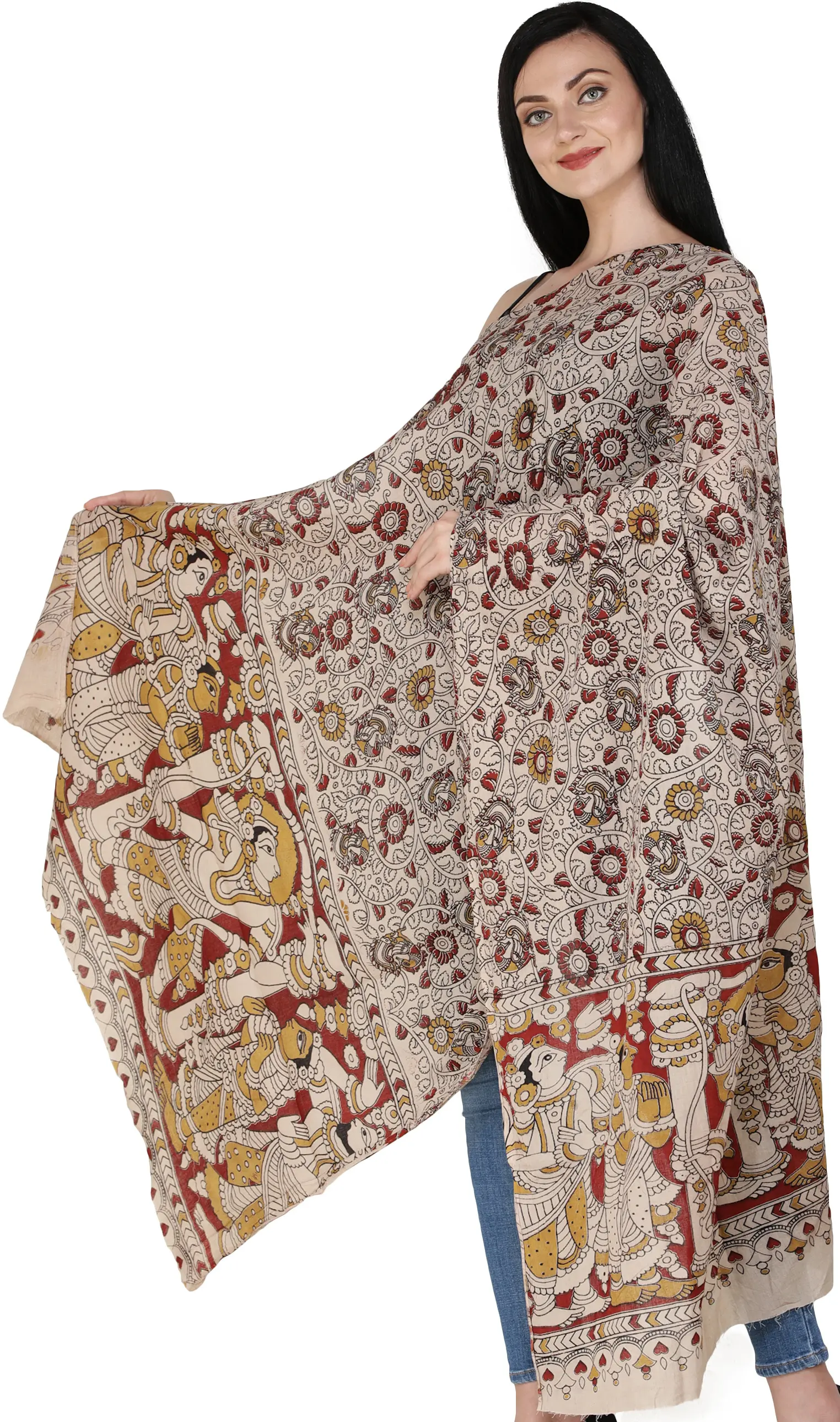 Pistachio-Shell Kalamkari Dupatta with Pen Art Hand-Painted Kathakali Dancing Ladies from Telangana