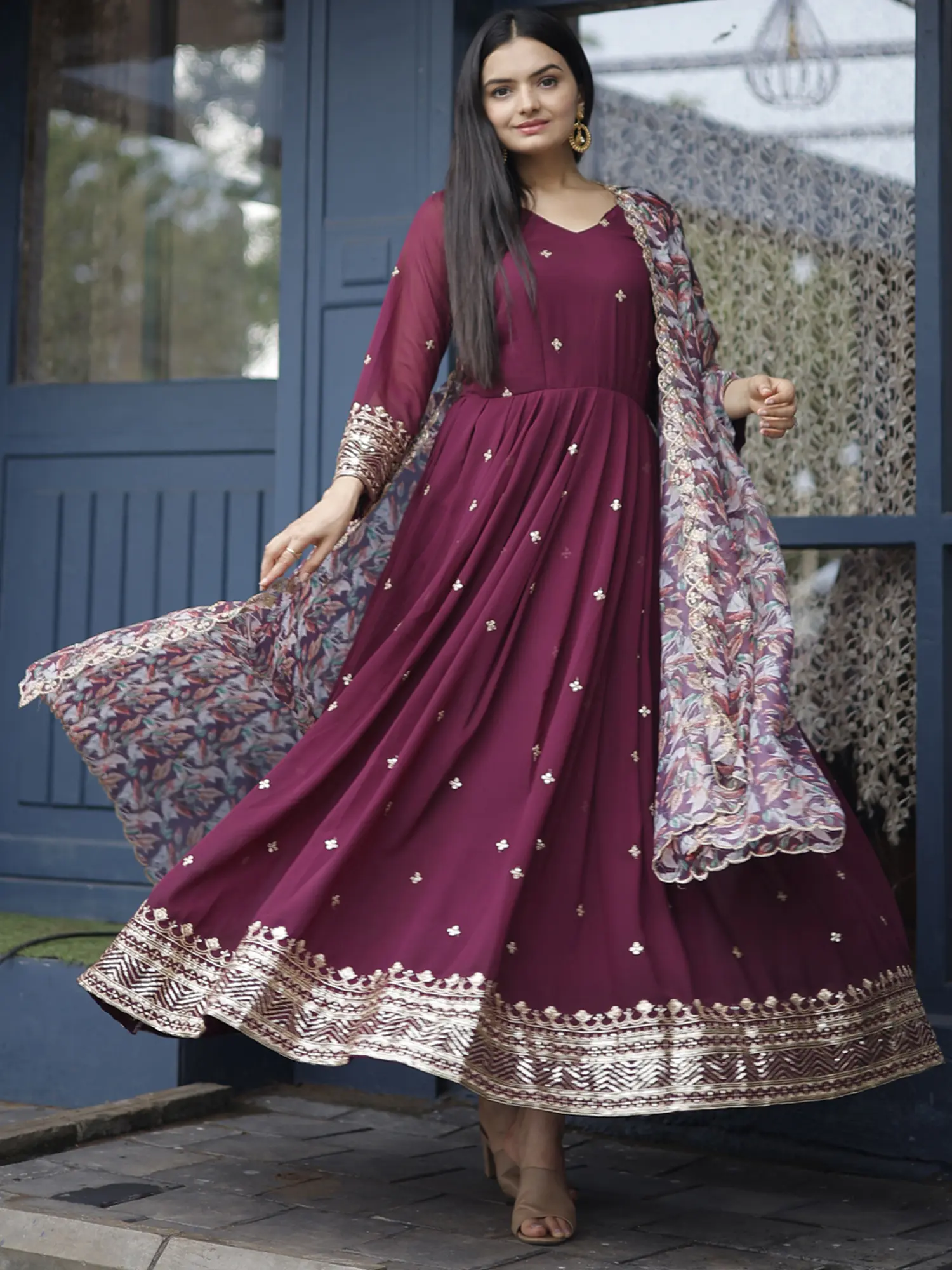 Kalidar suits, also known as Anarkali, are classic suits that can be tailored to contemporary fashions. This Blooming Georgette Wine Suit with Embroidered Zari Sequins-Work is an Anarkali Suit with a beautiful wine color and a simple design on the border and sleeves. The torso of the suit is embellished with little buttis, giving it a relaxing appearance. This elegant outfit is ideally suited for engagement parties and pre-wedding rituals.