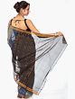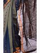 The primary color palette of this saree is a captivating blend of deep blues and soothing grays. Vertical stripes in varying widths of these hues dominate the fabric, creating a dynamic yet harmonious pattern. Interspersed within the blue stripes are delicate, abstract motifs in darker tones, adding depth and intrigue. The interplay of these colors is enhanced by subtle red and yellow accents, particularly noticeable in the border and pallu, which provide a warm contrast and a touch of vibrancy. The pallu, a key feature of any traditional Indian saree, is a striking composition of alternating bands of gray and black, punctuated by thin orange and white stripes, offering a sophisticated finish.