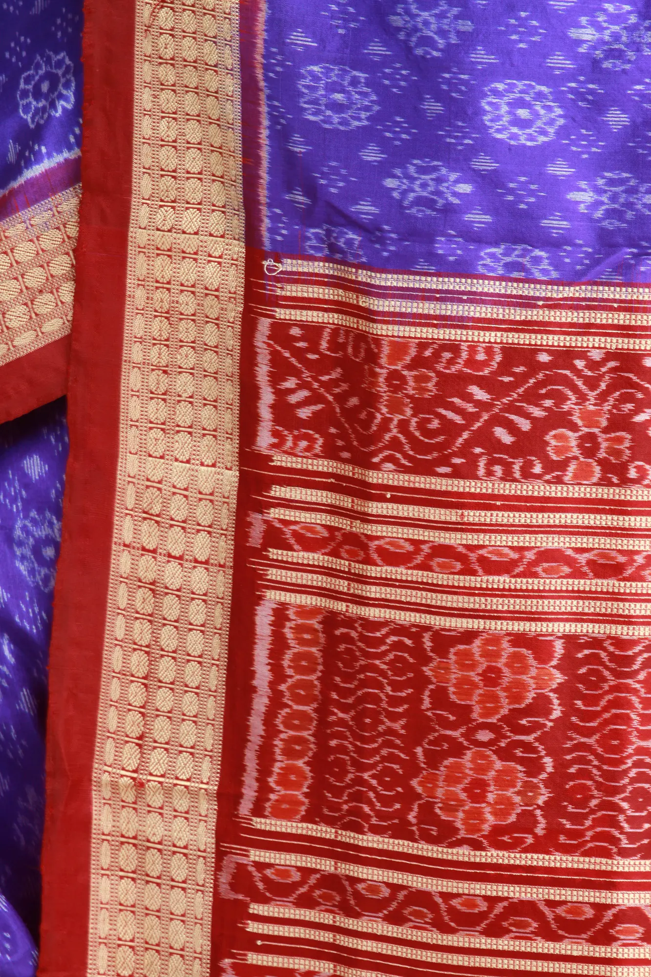 Step into a world of timeless elegance with this exquisite pure silk Sambhalpuri handloom sari, a true testament to the rich cultural heritage of Orissa. The mesmerizing shade of violet forms the canvas for intricate, hand-woven Ikat patterns that resemble delicate flowers scattered across the fabric. Each motif is a whispered story, woven with meticulous precision by skilled artisans who have perfected this ancient art form over generations. The vibrant maroon border, adorned with contrasting geometric Ikat designs, provides a striking counterpoint to the serene purple, creating a symphony of color and texture.
