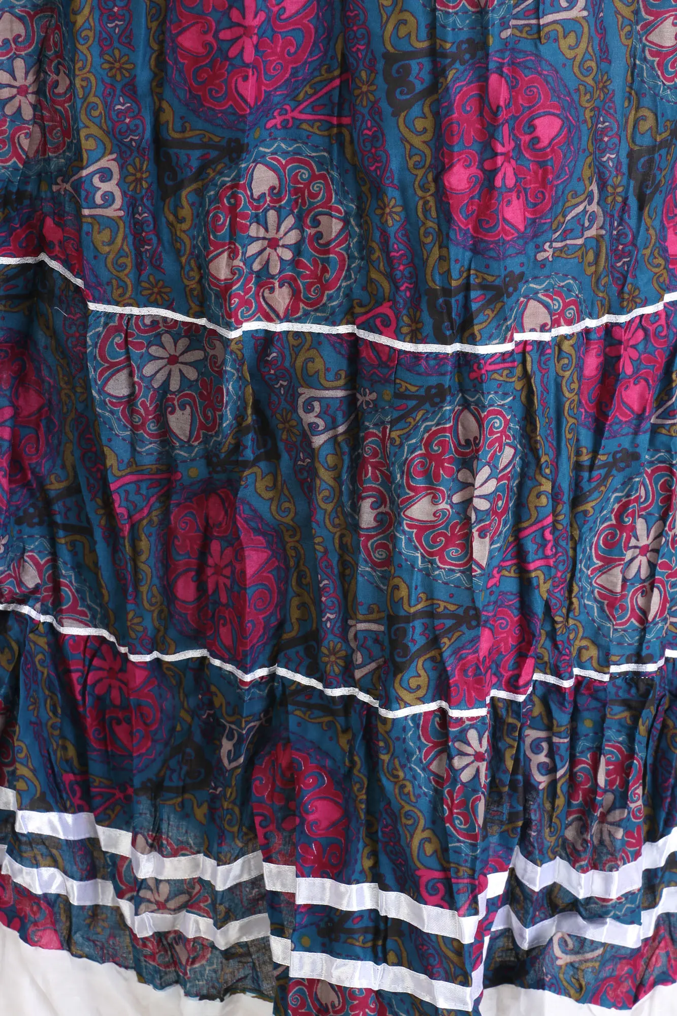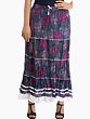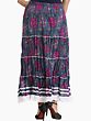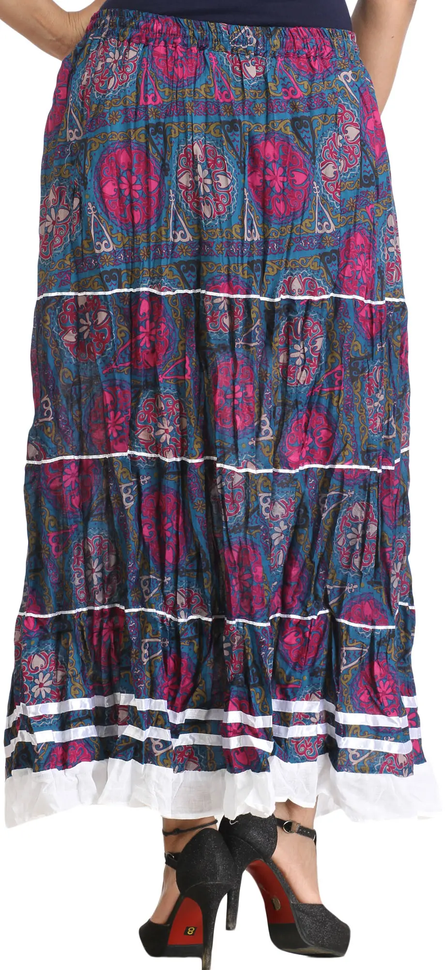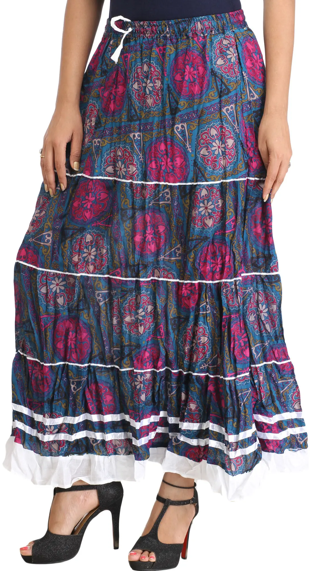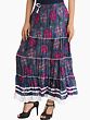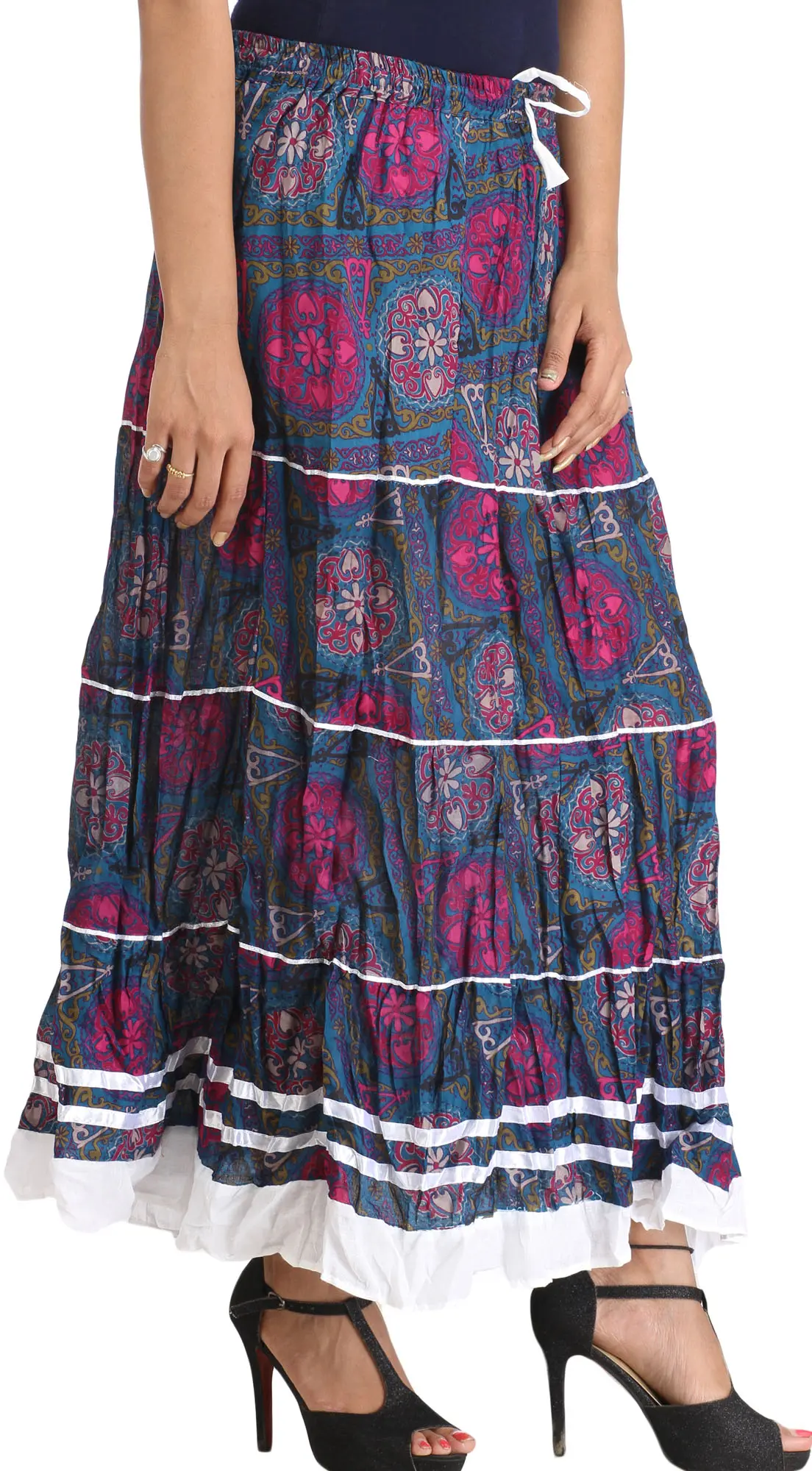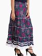 Magic is created in this blue and purple long skirt, with rich floral motifs all over and the use of deep colors. The cotton fabric of the skirt gives it a feathery appeal, which is contrasted by the intricate spread of patterns on its length. The white ribbon is stitched on the skirt to divide it into symmetrical sections and give a contrasting charm to its length and edge.