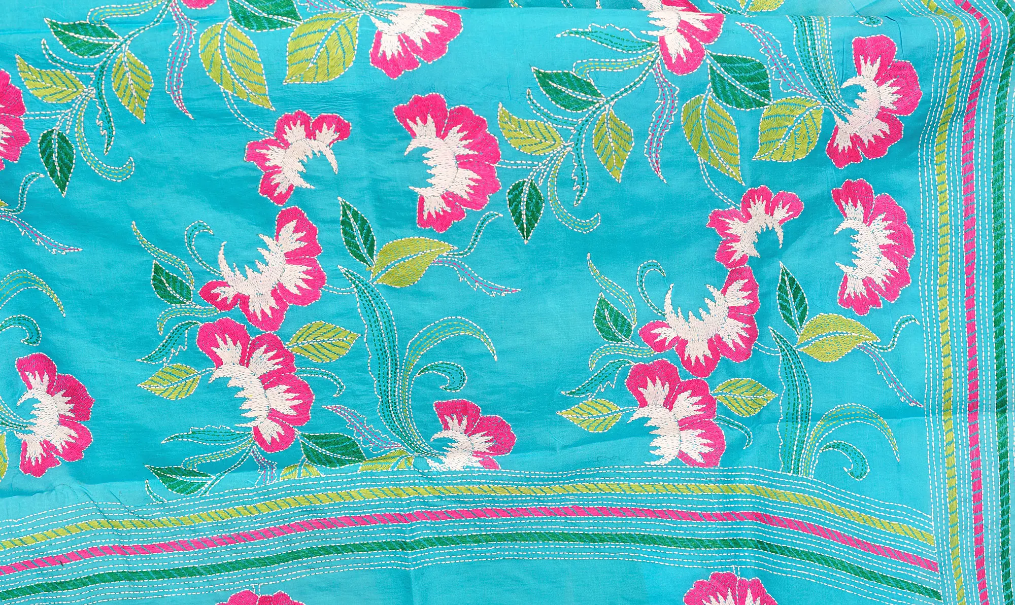 Immerse yourself in the artistry of Bengal with this exquisite pure silk dupatta, a wearable masterpiece brought to you from the vibrant heart of Kolkata. This stunning piece is a testament to the timeless beauty of traditional Kantha embroidery, a craft passed down through generations, imbuing each thread with stories and skill. The serene blue hue of the pure silk serves as the perfect canvas for a breathtaking display of hand-stitched floral motifs.