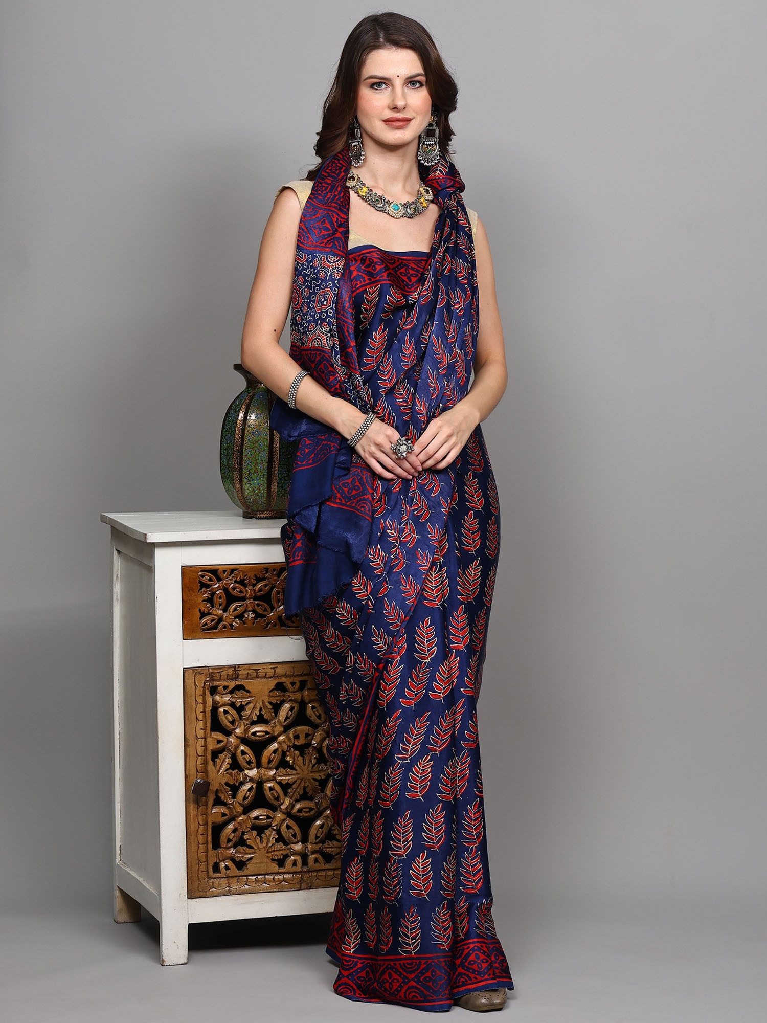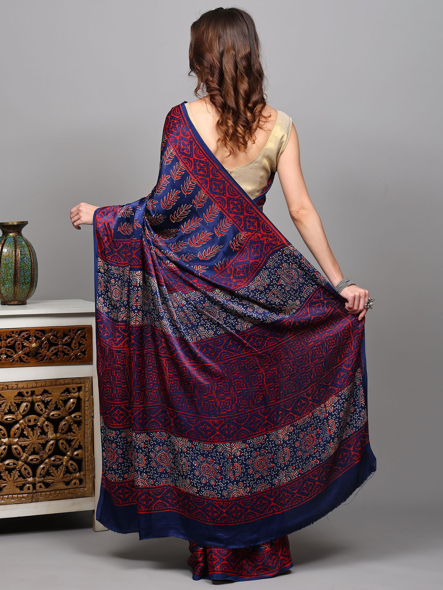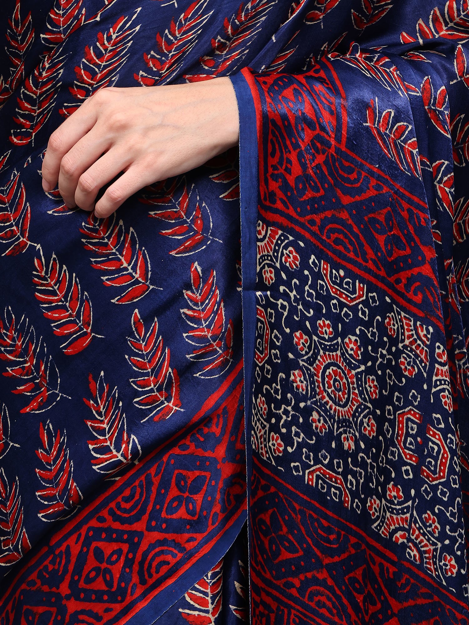 Immerse yourself in the rich heritage of Indian textiles with this exquisite Blue-Depths Saree. Crafted from luxurious modal silk, this garment is a testament to the intricate artistry of block printing, a craft deeply rooted in the cultural landscape of Madhya Pradesh. The deep, captivating blue of the modal silk serves as a canvas for a mesmerizing all-over pattern of stylized floral leaves and geometric motifs. Each design element is meticulously hand-pressed using traditional wooden blocks, a process that imbues the fabric with a unique, organic charm. The interplay of vibrant red and subtle cream within the block prints creates a striking contrast against the dark blue expanse. The floral leaf motifs, rendered in a warm red hue, appear to dance across the fabric, their delicate outlines adding a touch of natural grace. Interspersed with these botanical elements are segments of intricate geometric patterns, featuring small, repeating designs that speak to the meticulous nature of the craft. This thoughtful placement of patterns ensures a visually dynamic and engaging drape, making this saree a true work of wearable art.