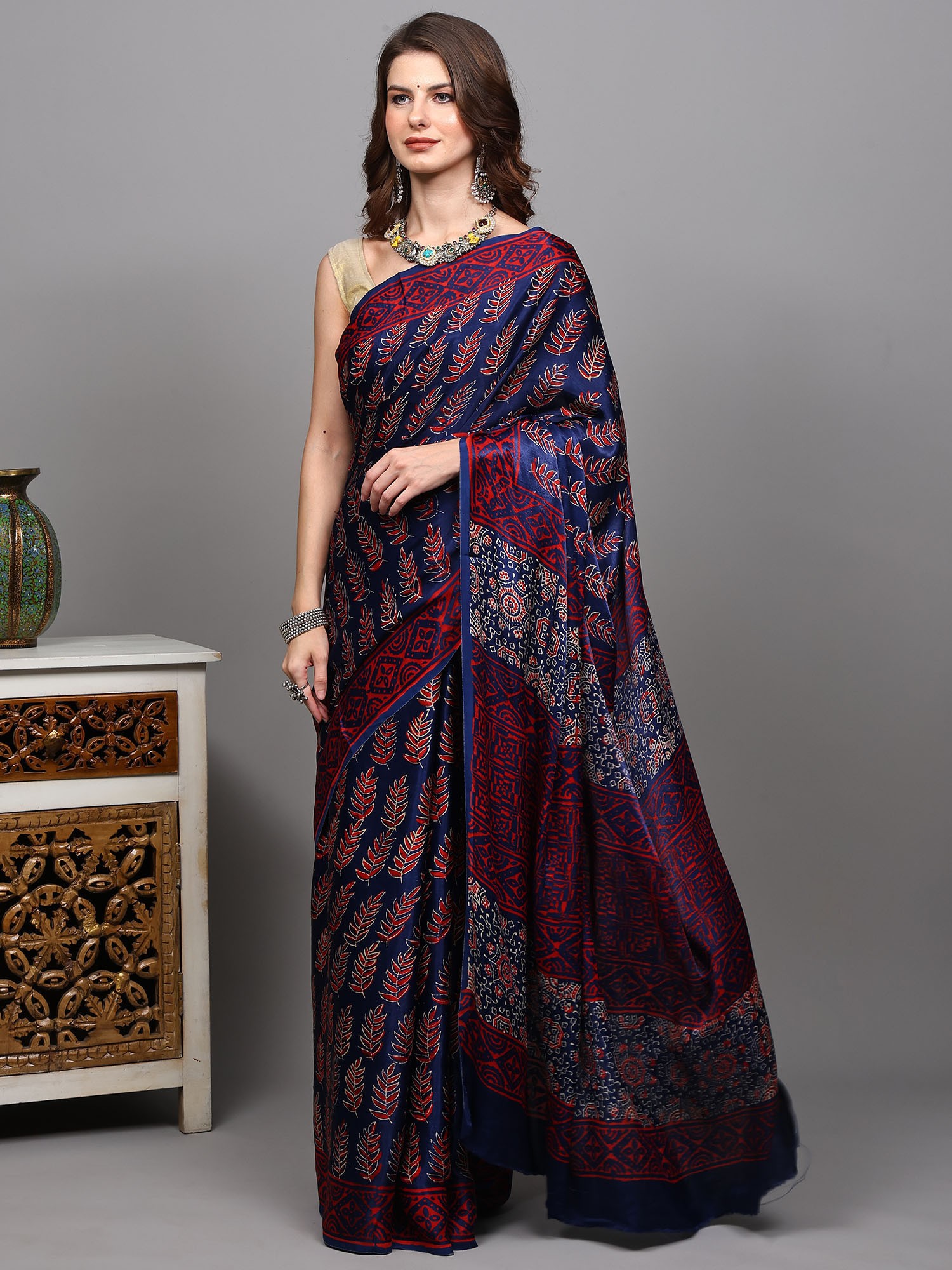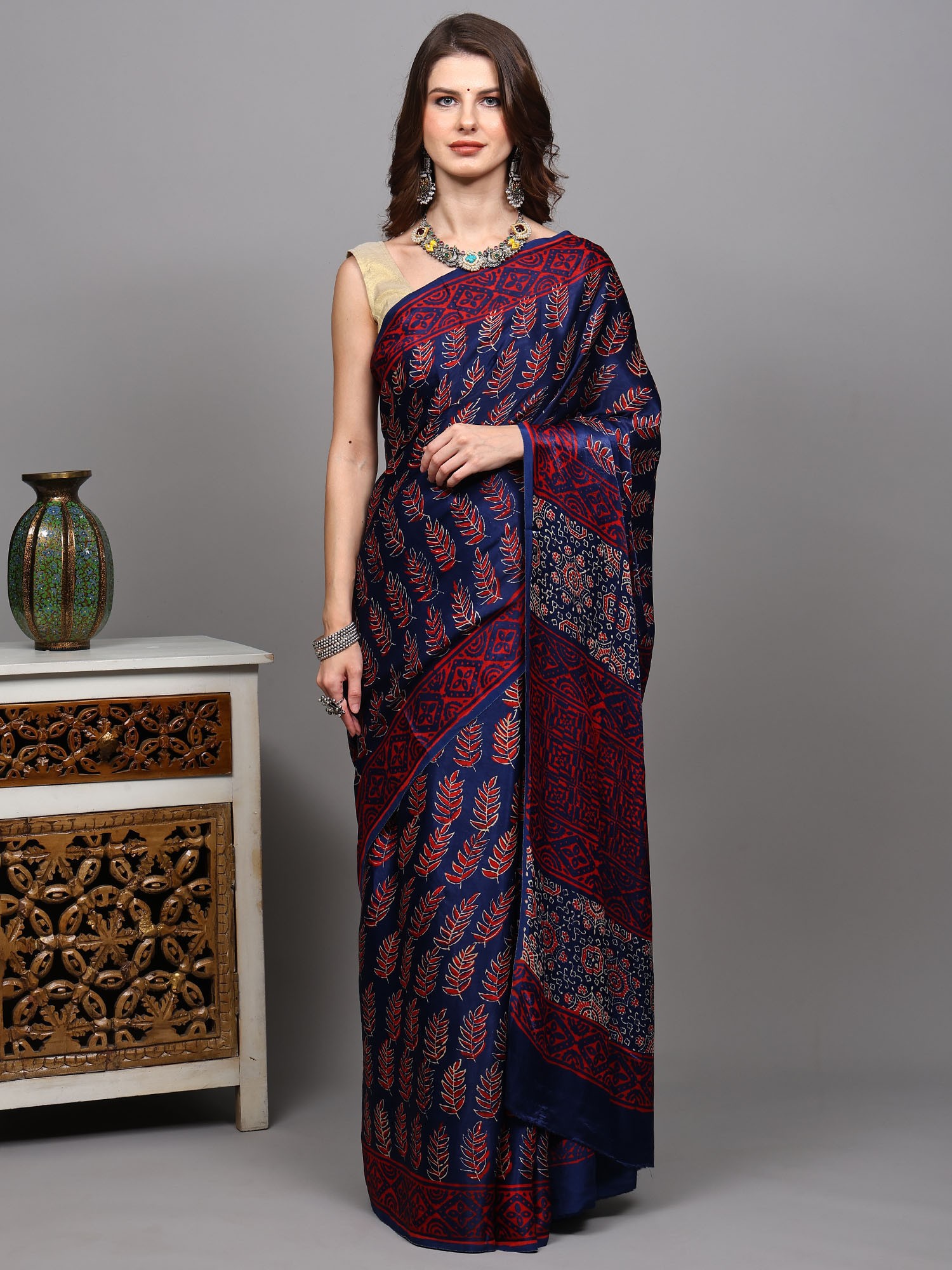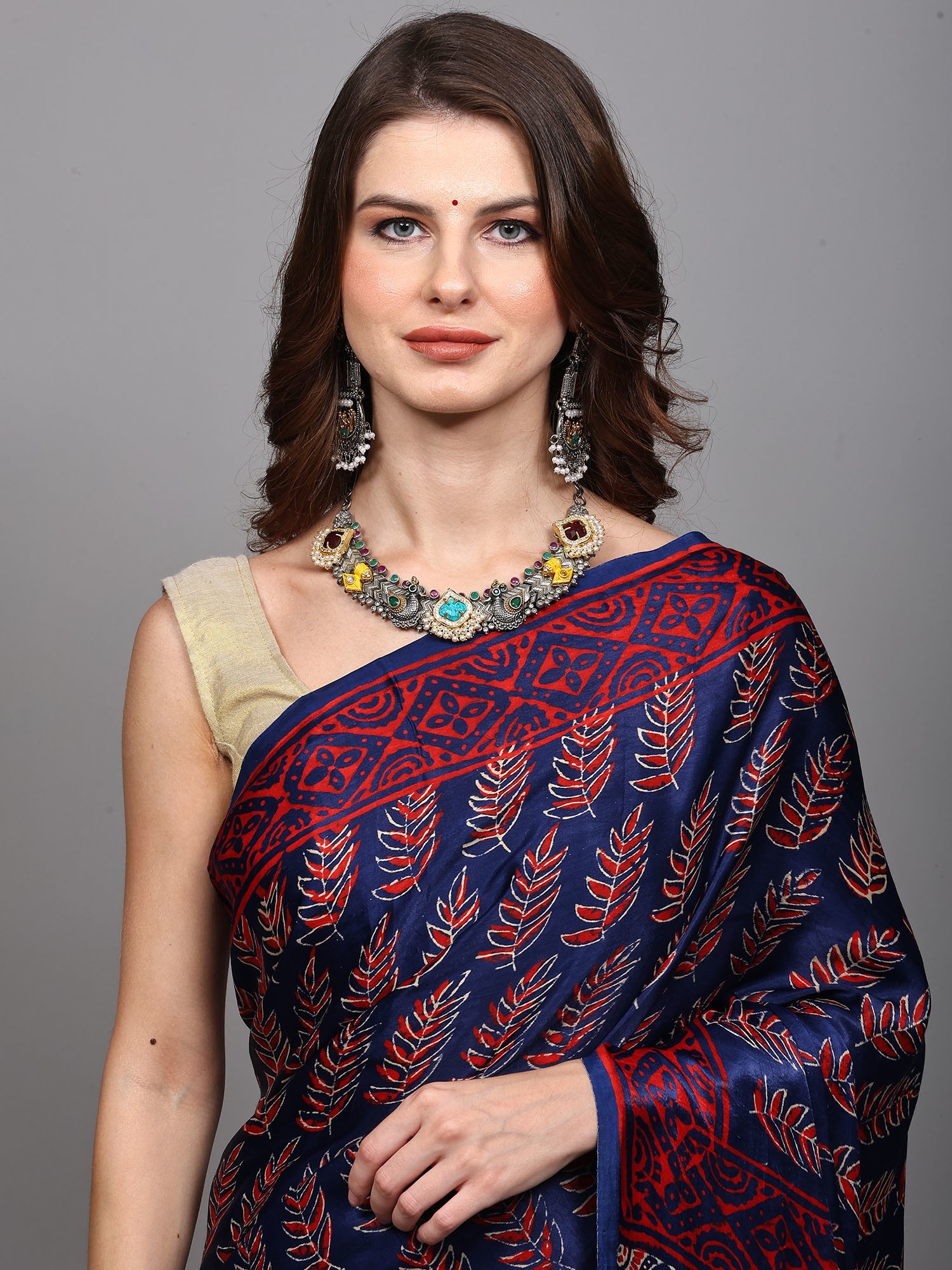 Immerse yourself in the rich heritage of Indian textiles with this exquisite Blue-Depths Saree. Crafted from luxurious modal silk, this garment is a testament to the intricate artistry of block printing, a craft deeply rooted in the cultural landscape of Madhya Pradesh. The deep, captivating blue of the modal silk serves as a canvas for a mesmerizing all-over pattern of stylized floral leaves and geometric motifs. Each design element is meticulously hand-pressed using traditional wooden blocks, a process that imbues the fabric with a unique, organic charm. The interplay of vibrant red and subtle cream within the block prints creates a striking contrast against the dark blue expanse. The floral leaf motifs, rendered in a warm red hue, appear to dance across the fabric, their delicate outlines adding a touch of natural grace. Interspersed with these botanical elements are segments of intricate geometric patterns, featuring small, repeating designs that speak to the meticulous nature of the craft. This thoughtful placement of patterns ensures a visually dynamic and engaging drape, making this saree a true work of wearable art.