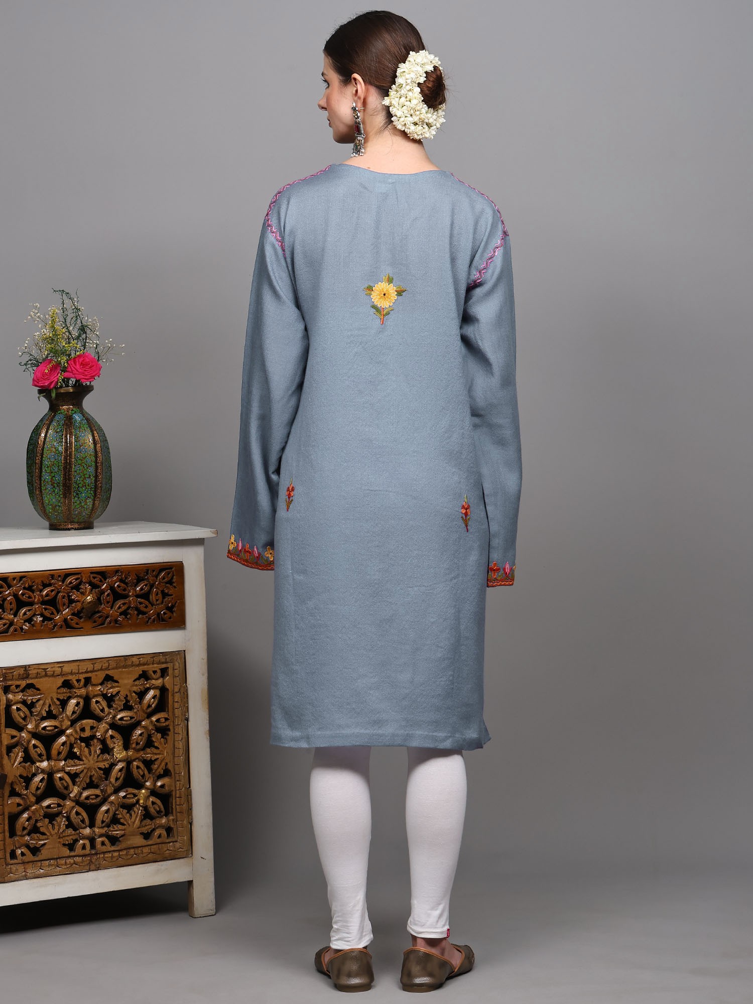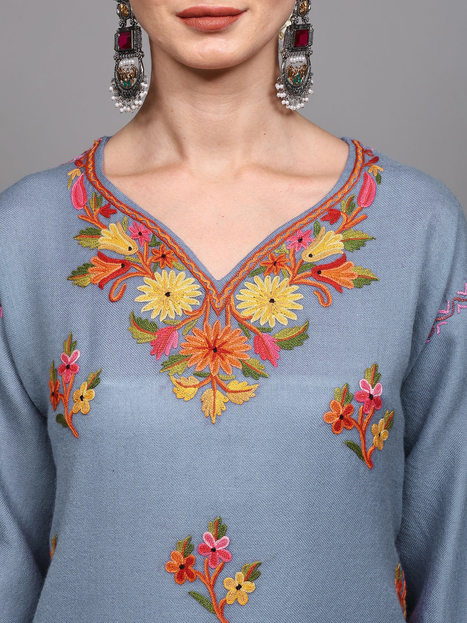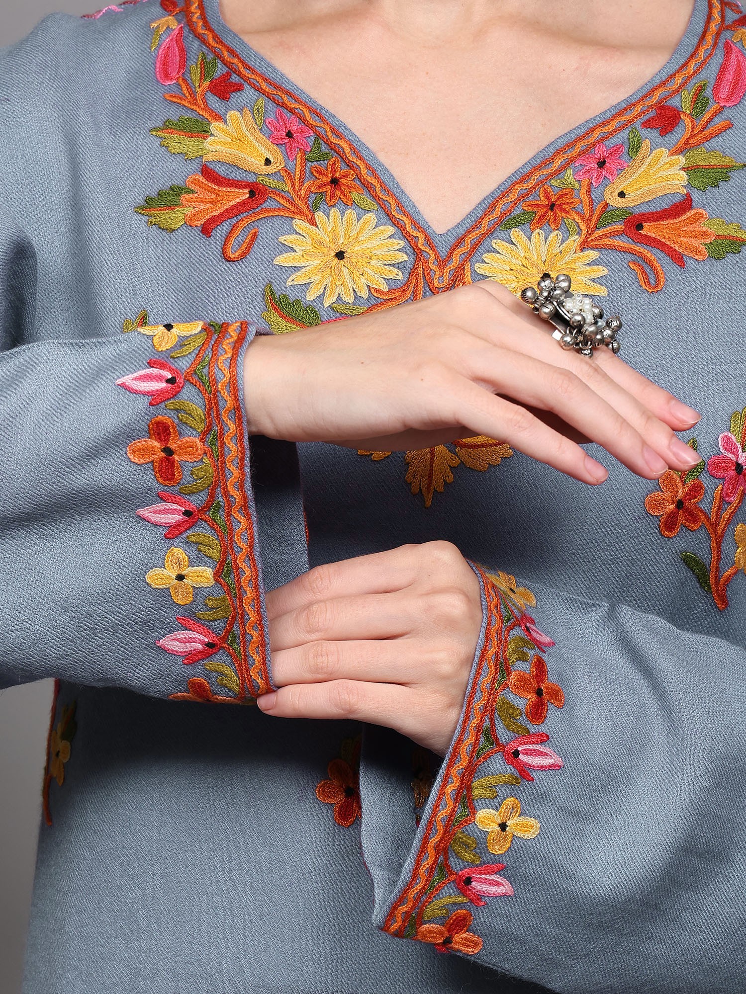 Pure Wool Phiran from Kashmir with Aari Embroidered Paisleys and Side Pockets