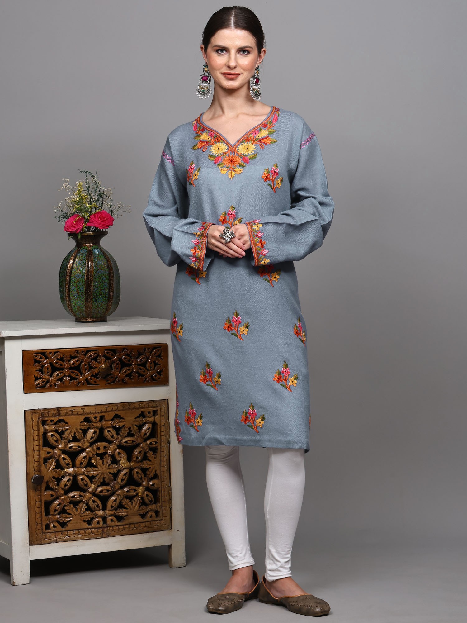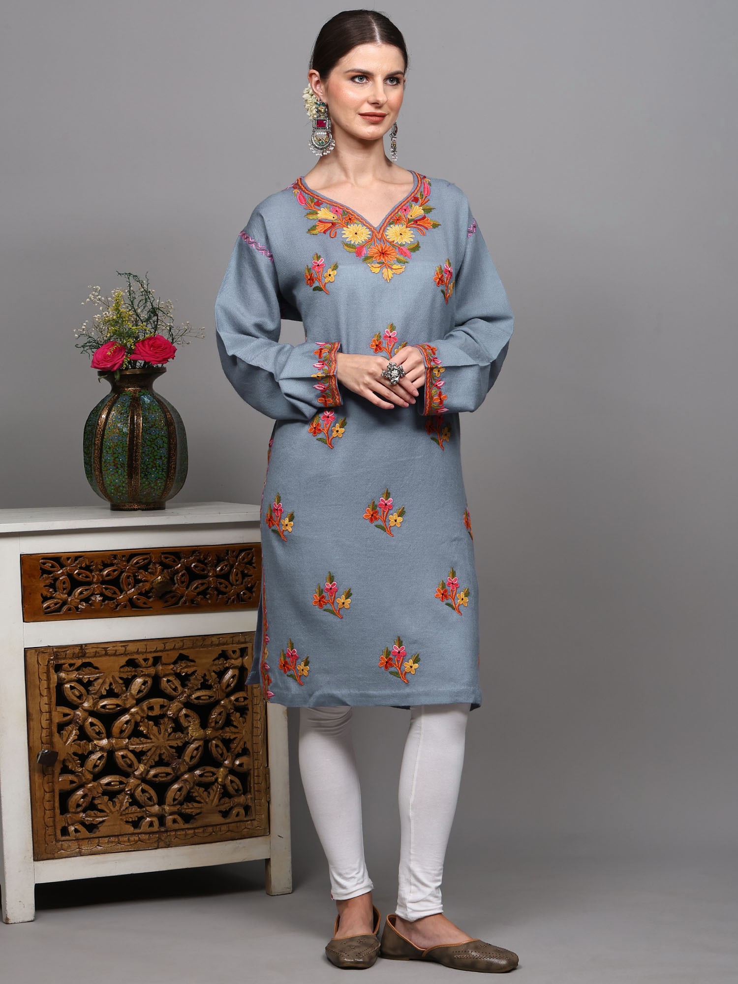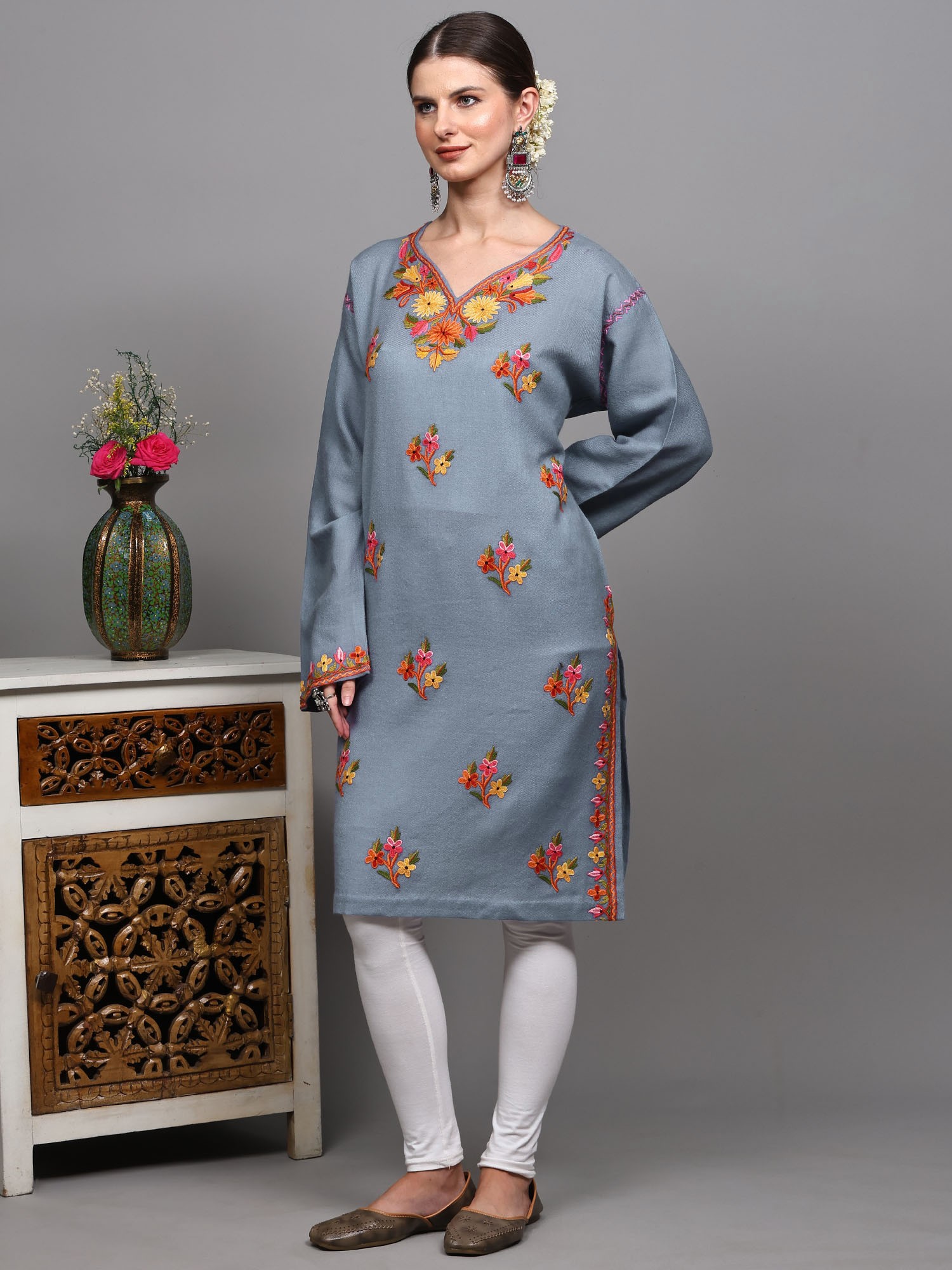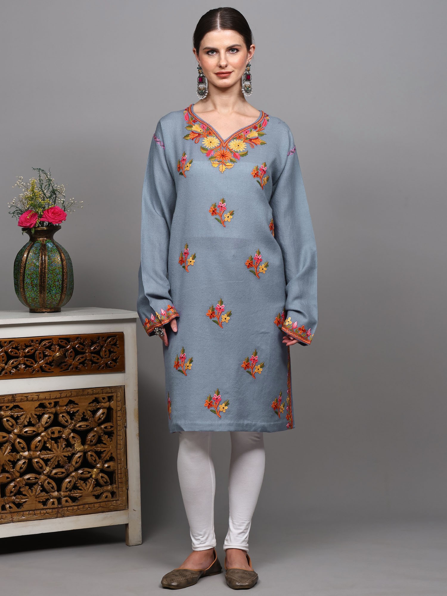 Pure Wool Phiran from Kashmir with Aari Embroidered Paisleys and Side Pockets