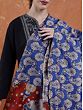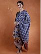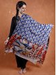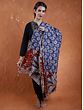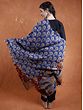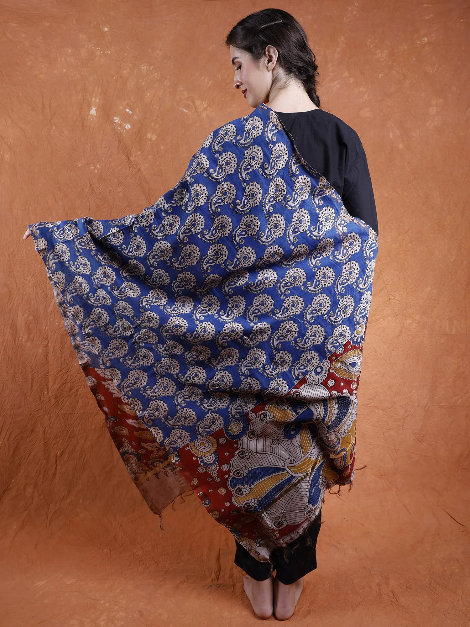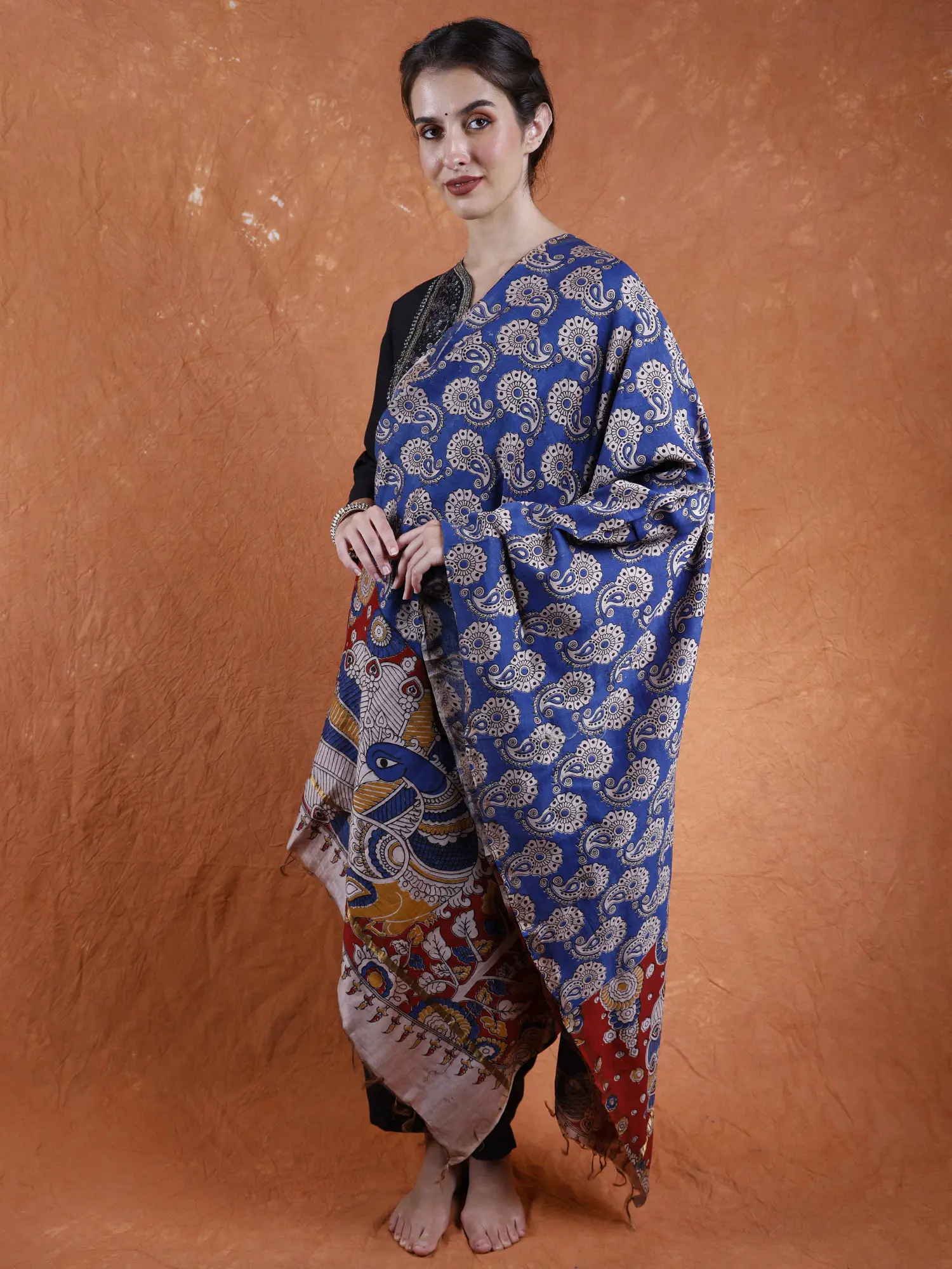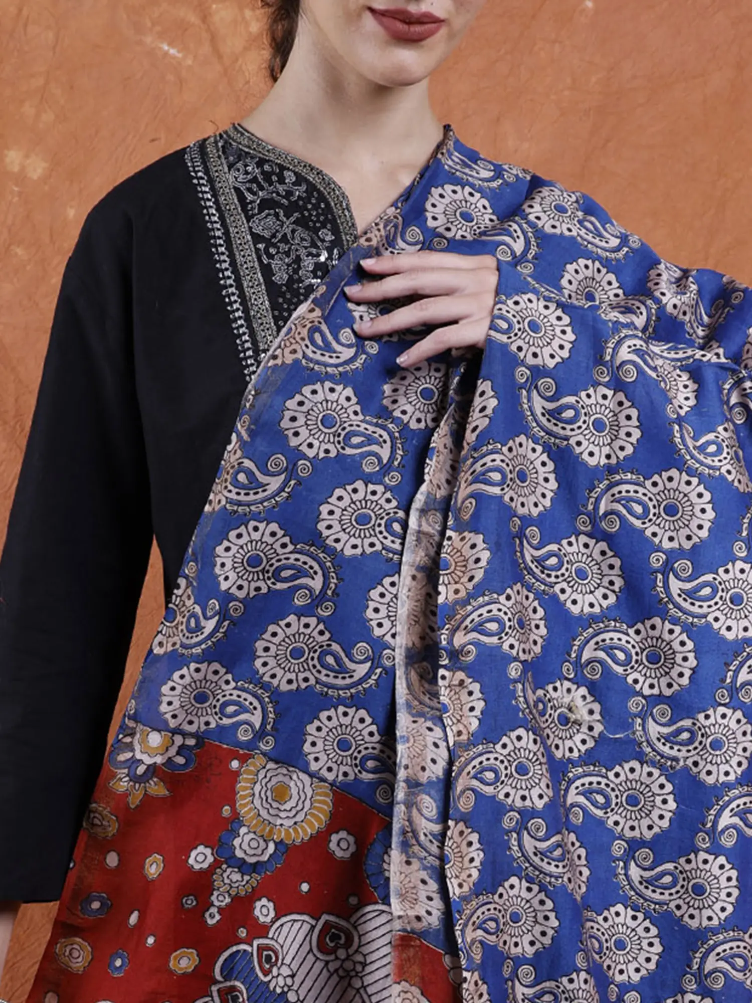 Black-Ink Floral Printed Kalamkari Dupatta from Telangana with Zari Woven Border and Dancing Apsaras