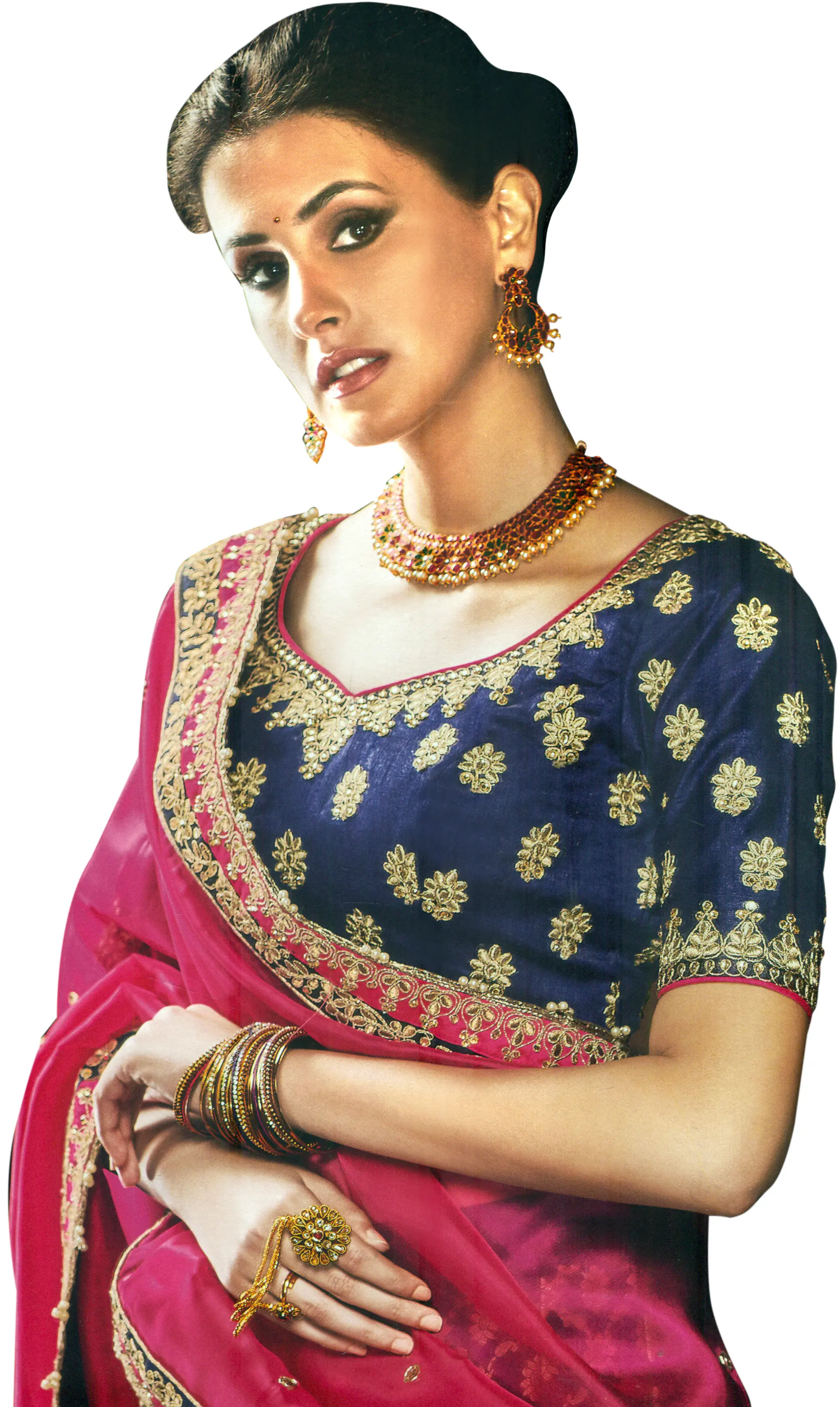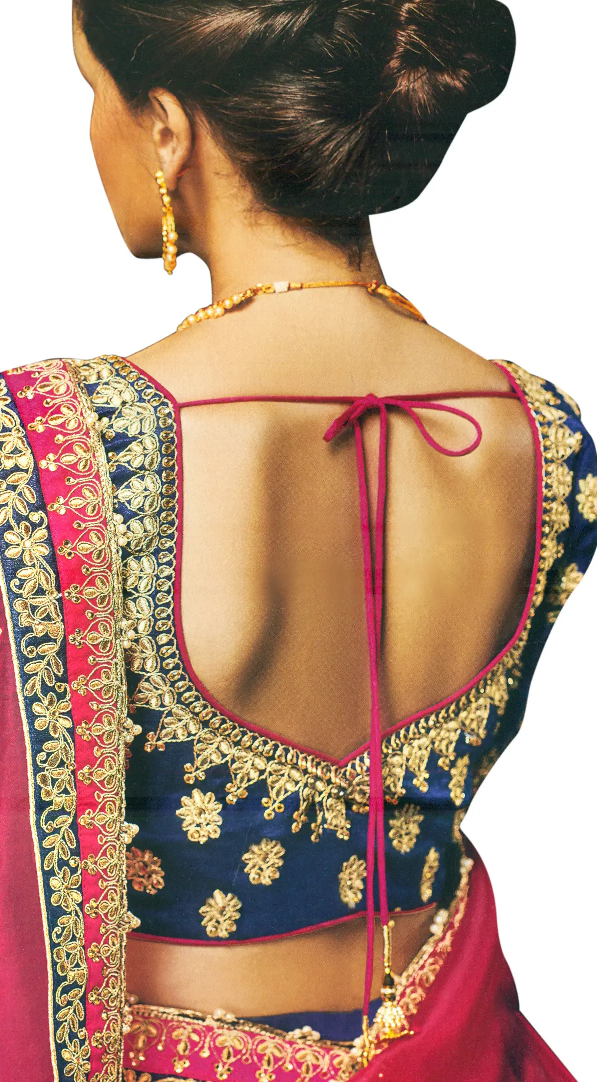 The ample pleats alone would make this a statement addition to your wardrobe or even trousseau. Ample brocade-work graces its gorgeous length, filled in with a definitive variety of motifs - gold tendrils with paisleys against the dark blue of the foundation, an infusion of petals in gorgeous bridal pinks and oranges, and panels of lilies and lotuses in matching colours all the way down to the hem. The choli has similar gold motifs in matching dark blue. The signature pink dupatta complements the base colour of the lehenga. It is so long it reaches the hem of the skirt, while the translucent silk it is made from is dyed a colour no woman or bride could go wrong with.