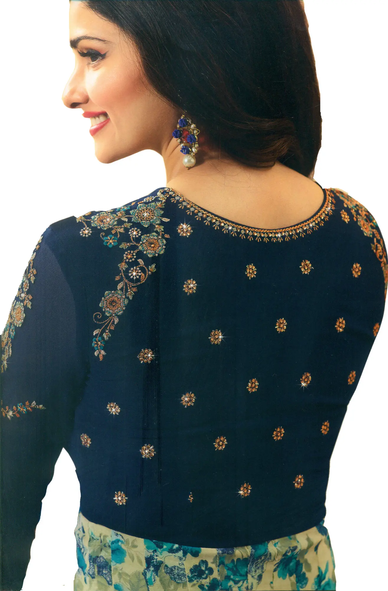 The contrasting lower half of the Anarkali is a breathtaking canvas of a serene, pale base adorned with vibrant, printed florals. The blossoms, rendered in striking shades of sapphire blue and emerald green, appear to bloom with life against the subtle background. Each pleat of the flowing skirt unfurls a new dimension of this captivating print, creating a dynamic and visually engaging silhouette. This interplay of color and pattern evokes a sense of natural beauty and youthful vibrancy, ensuring you stand out in any gathering. The full-length sleeves, fashioned from sheer georgette, offer a delicate and airy feel, adding a touch of ethereal grace. The same georgette is used for the accompanying dupatta, which drapes effortlessly, enhancing the overall elegance of the outfit. The rich fabric promises a graceful flow, allowing you to move with poise and confidence. The deep blue border, a subtle yet impactful design element, frames the hem of the skirt and sleeves, providing a grounding contrast and a polished finish to this magnificent creation. This Anarkali suit is more than just clothing; it's an expression of artistry and a celebration of enduring style, perfect for any special occasion or festive celebration.