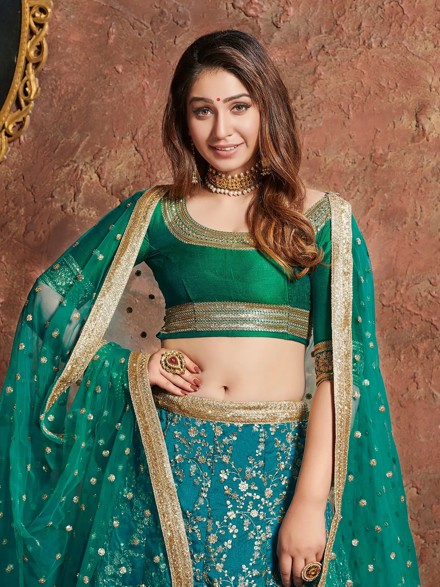 Every stitch and embellishment on this lehenga choli speaks of meticulous attention to detail and a commitment to quality. The art silk fabric provides a lustrous sheen and a comfortable drape, ensuring you feel as good as you look. The combination of zari, sequins, and dori embroidery is a testament to skilled artistry, creating a rich texture and depth that elevates the entire piece. The striking contrast between the emerald green choli and dupatta against the teal lehenga creates a visually stunning effect, making this an unforgettable choice for wedding ceremonies, receptions, or any celebratory event where you wish to make a memorable impression. This lehenga choli is an ode to traditional Indian ethnic wear, designed to make you feel like royalty on your most special days.