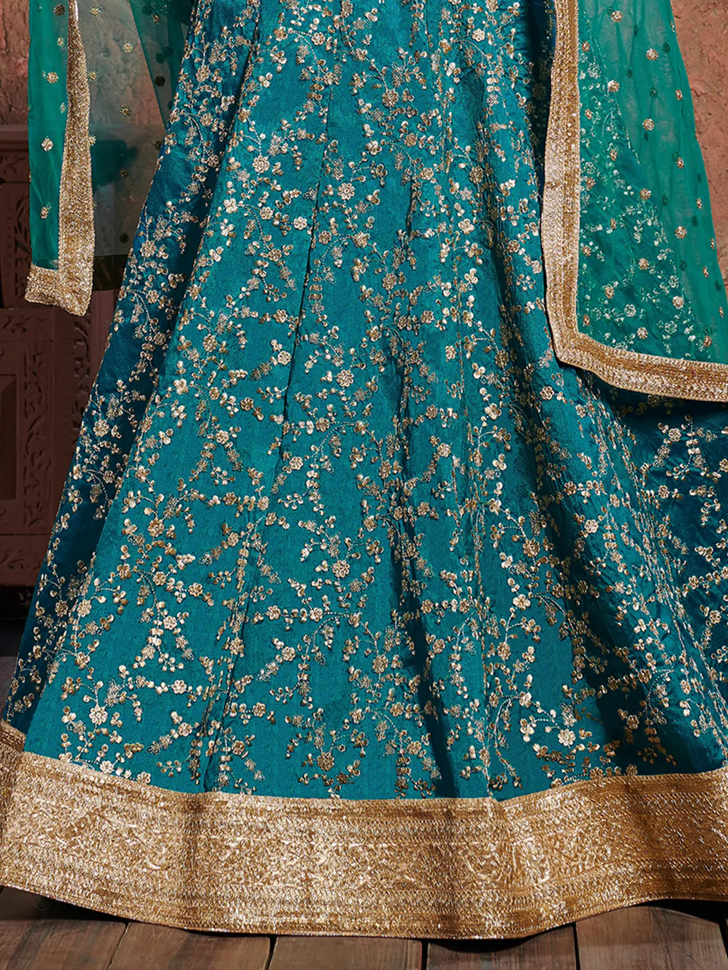 Teal Taffeta Silk Beautiful Floral Zari Embroidery Lehenga Choli with Beige Sheer Dupatta
