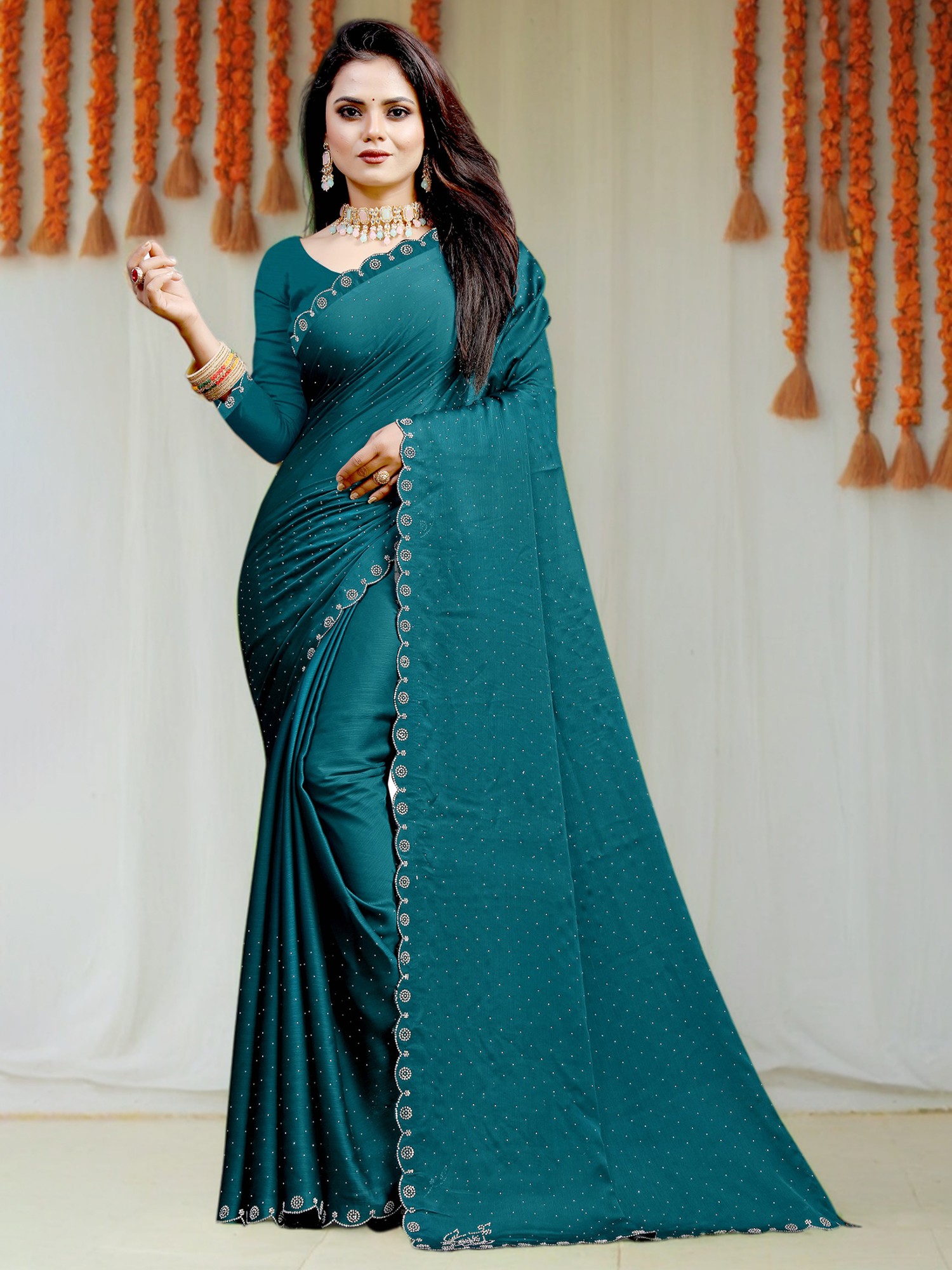 Step into the spotlight with this mesmerizing saree, designed to make a lasting impression. The luxurious fabric drapes beautifully, creating a flattering silhouette that will have you feeling confident and glamorous. The rich color exudes sophistication, ensuring you stand out in any crowd.