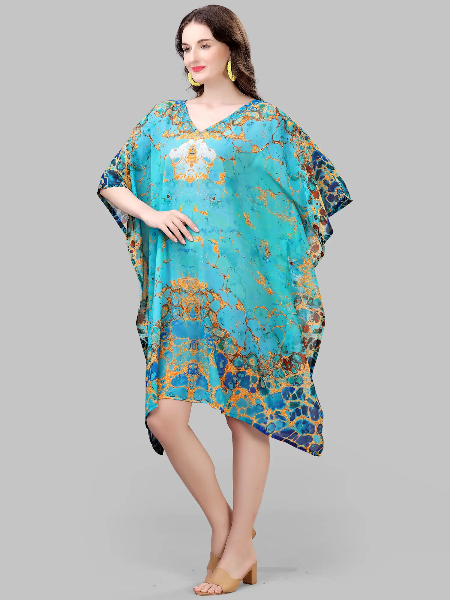 Aegean-Blue Cotton Chakra Pattern Printed Short Kaftan