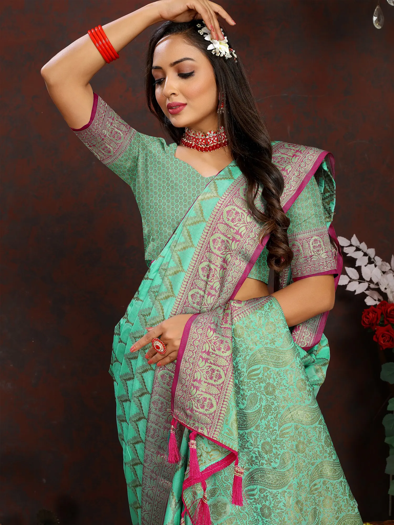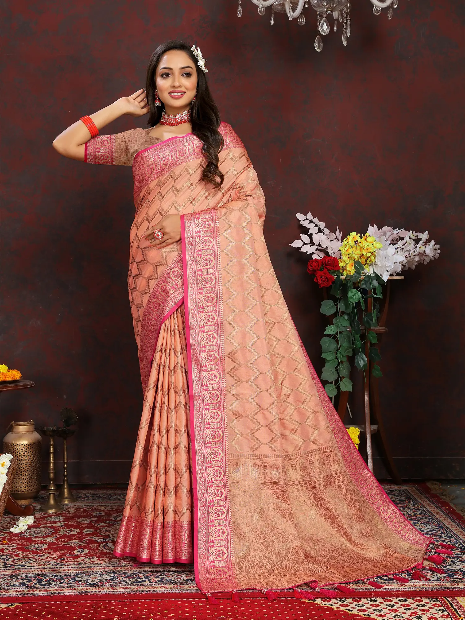 The allure of this saree extends beyond its captivating central pattern. The broad borders are adorned with a rich tapestry of traditional motifs, showcasing the intricate artistry of Banaras. Delicate floral designs and intricate geometric patterns are woven with precision, framing the saree with a regal charm. Adding a final flourish of elegance, the pallu is embellished with meticulously crafted tassels in a matching pink hue. These delicate additions not only enhance the drape of the saree but also add a playful, festive touch that catches the light with every movement.