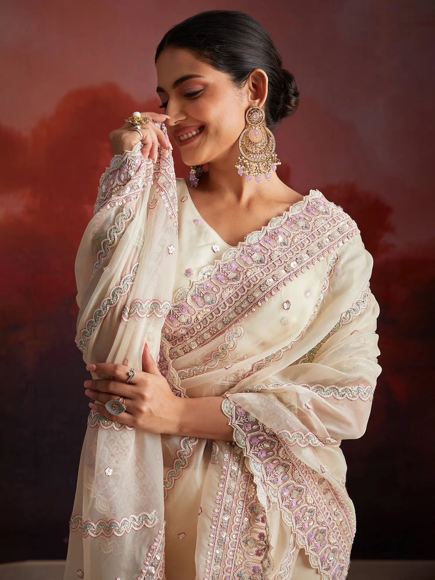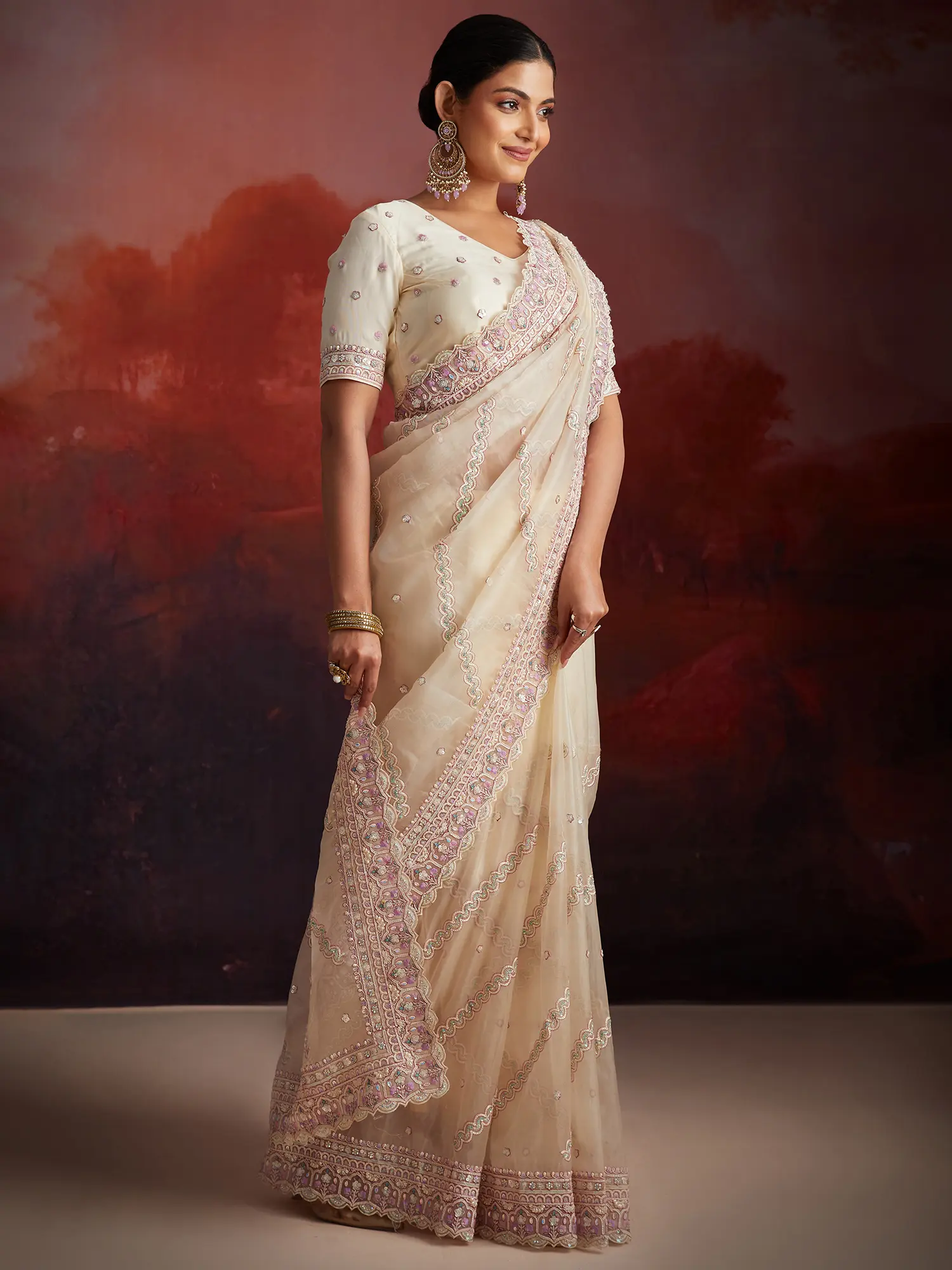 The subtle yet striking bone hue of this saree provides a perfect backdrop for the intricate detailing. This neutral shade allows the embellishments to truly shine, while also offering a versatile base that pairs effortlessly with a variety of jewelry and accessories. The careful selection of materials and the masterful execution of the design culminate in a garment that speaks volumes of quality and taste. Embrace the allure of this exquisitely crafted saree and let your inner radiance bloom.