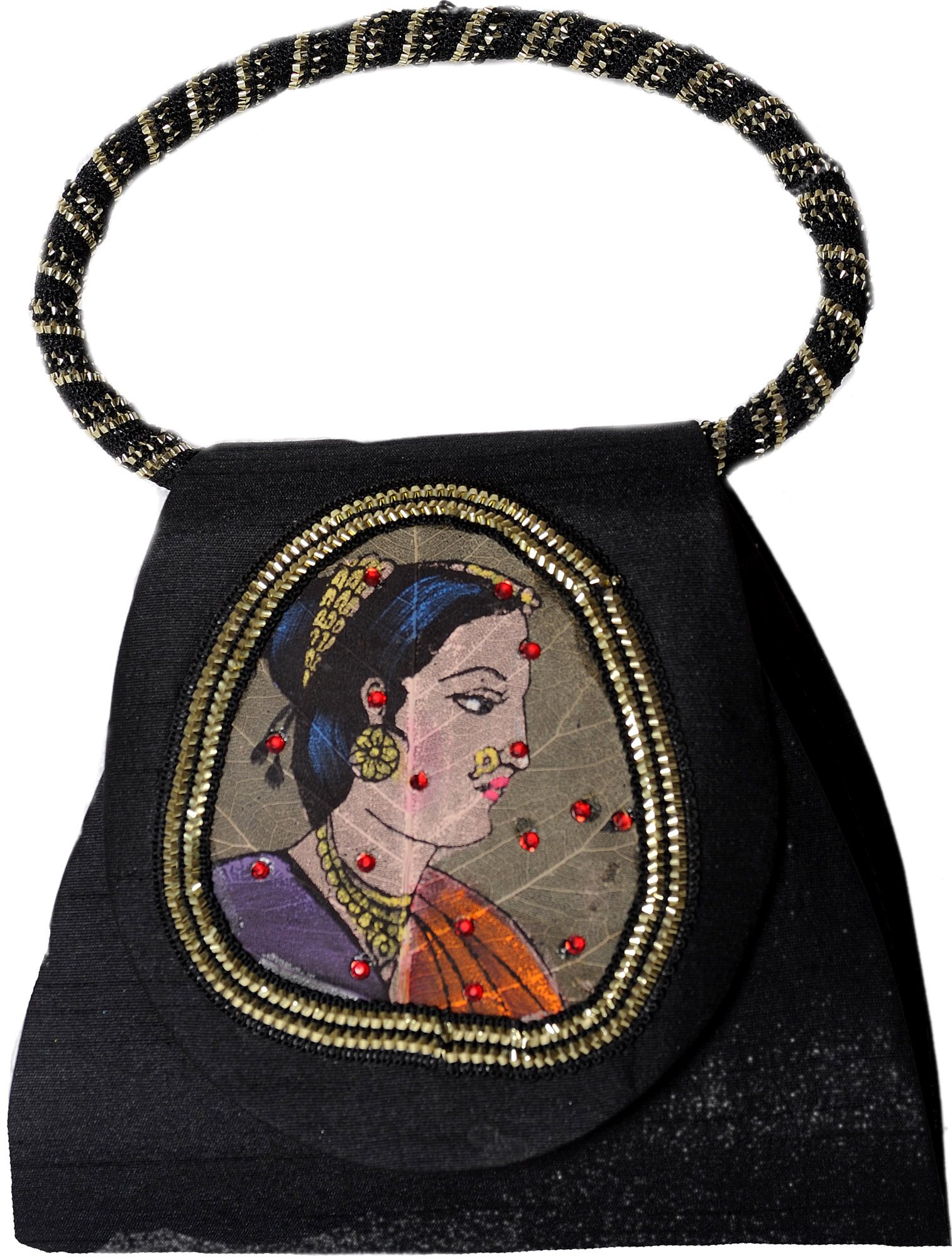 This bracelet bag transformed into wearable-converge. The canvas of this accessory comes alive with meticulous beadwork, forming a tapestry of colors and textures. Adoring it, a painted lady figure graces a fig leaf, a symbol of grace and natural beauty. The bracelet bag becomes a poetic expression, carrying the essence of craftsmanship. Each bead tells a story, and the lady on the fig leaf is a muse of sophistication.