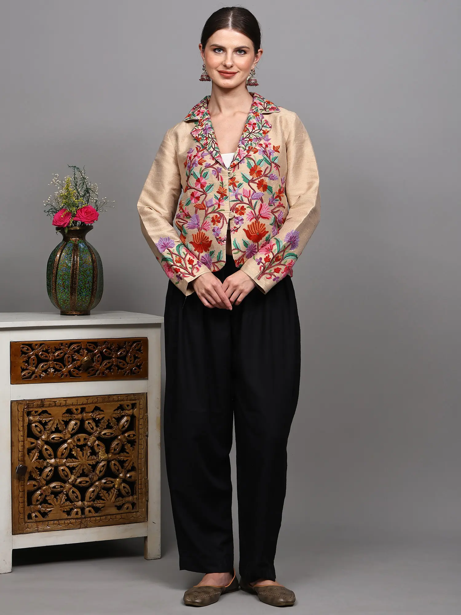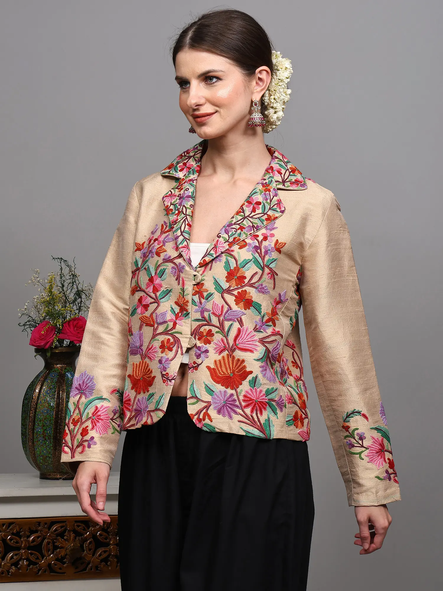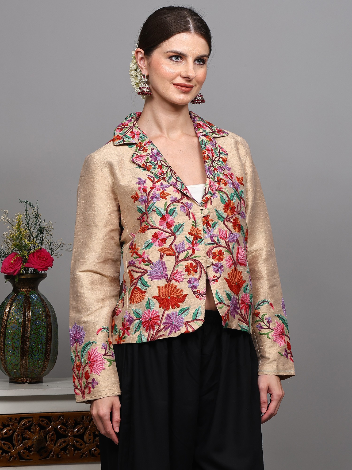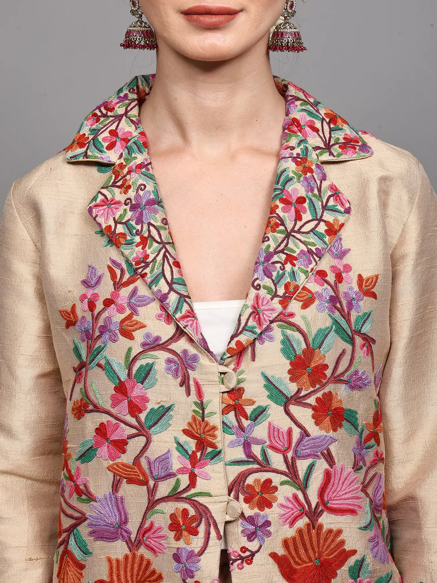 Aari Embroidered Long Jacket From Kashmir with Floral Vine Patterns