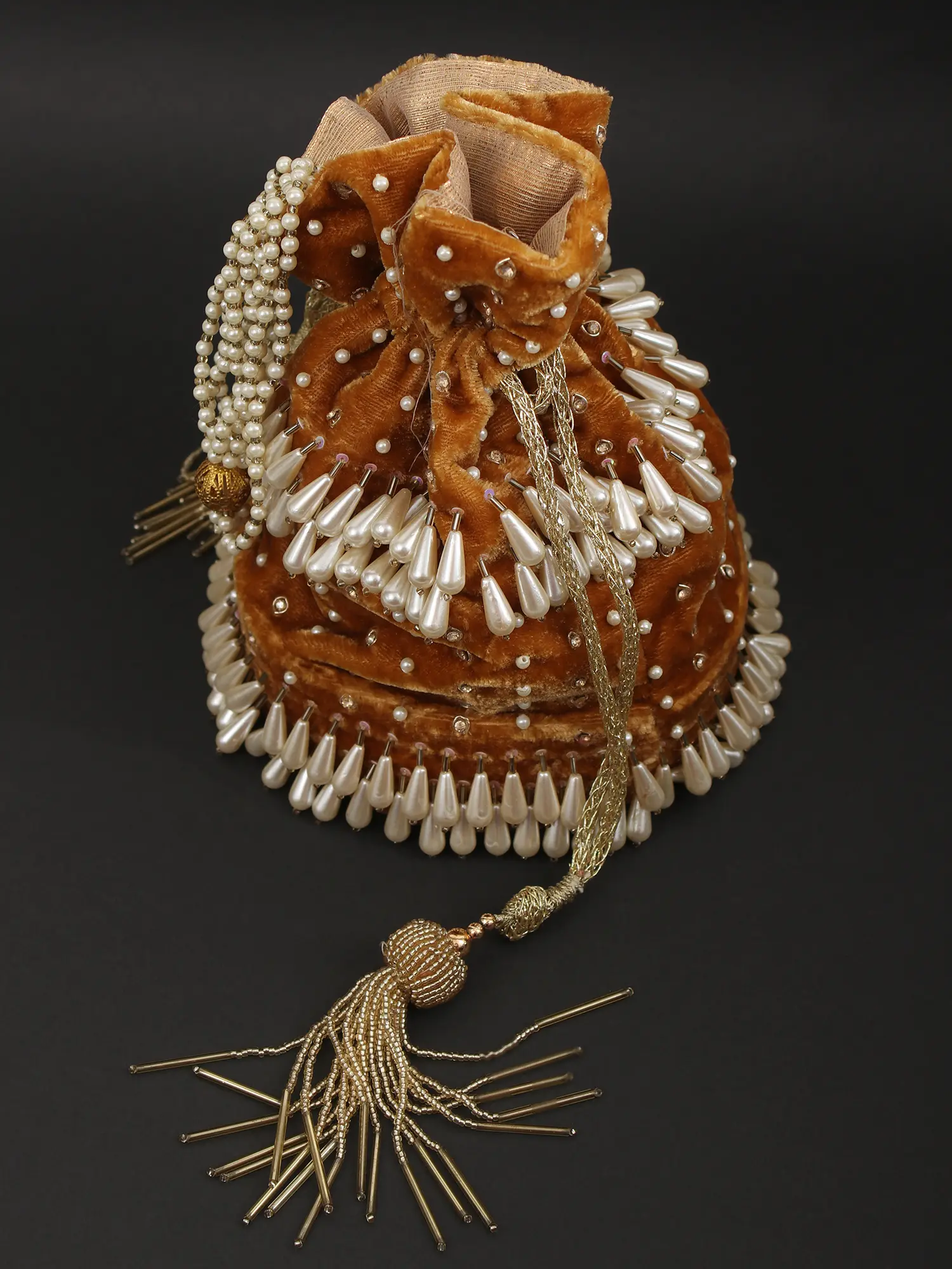 This Potli Bag is a mesmerising blend of tradition and contemporary finesse. Crafted from sumptuous velvet, it whispers tales of opulence and grace. Adorned with Beads embroidery, delicate Faux Pearls, and the melodious charm of Ghungroo Bells, this potli bag becomes a symphony of sophistication and splendour.