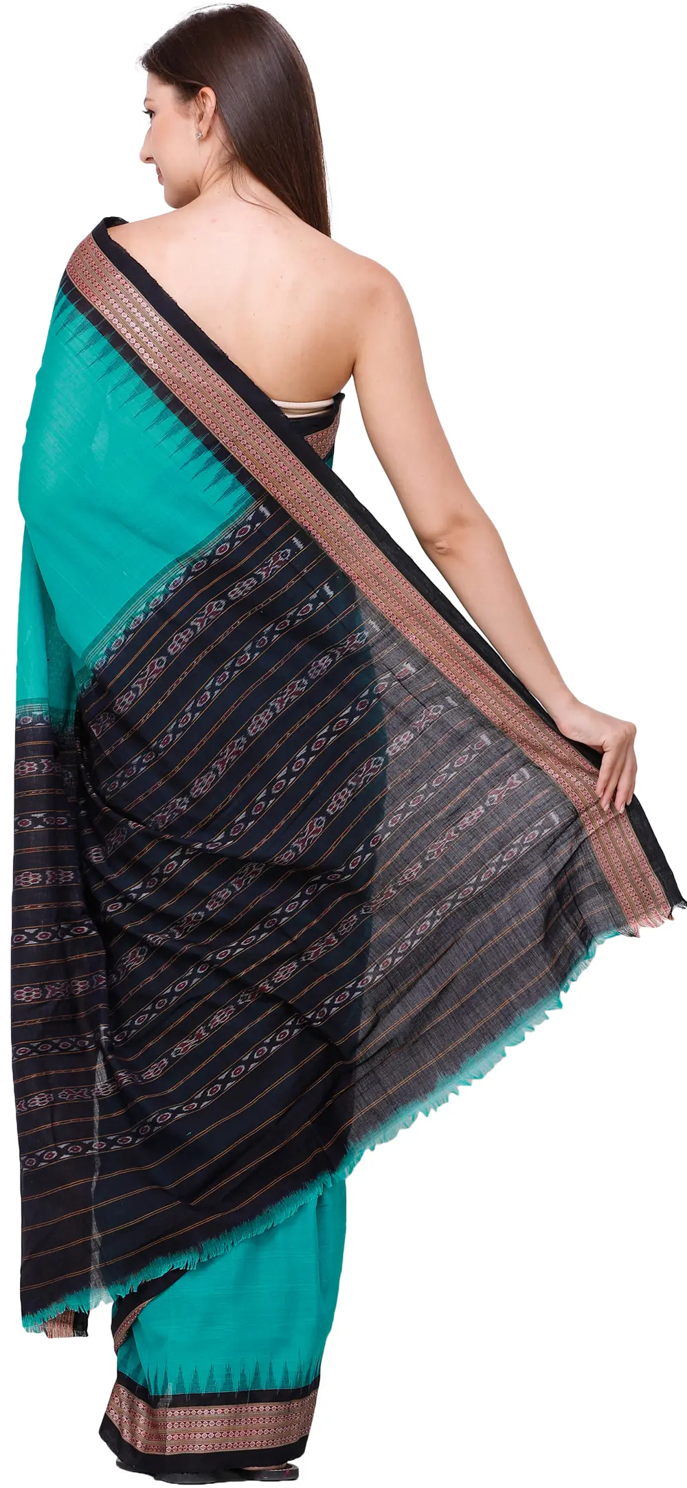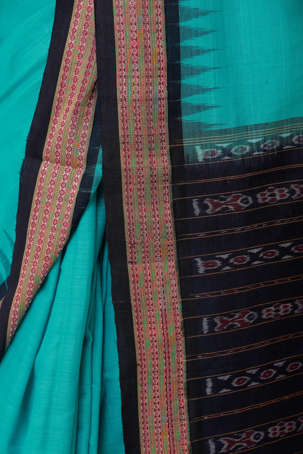 Bright-Aqua Handloom Sari from Sambhalpur with Temple Border and Ikat Weave on Pallu