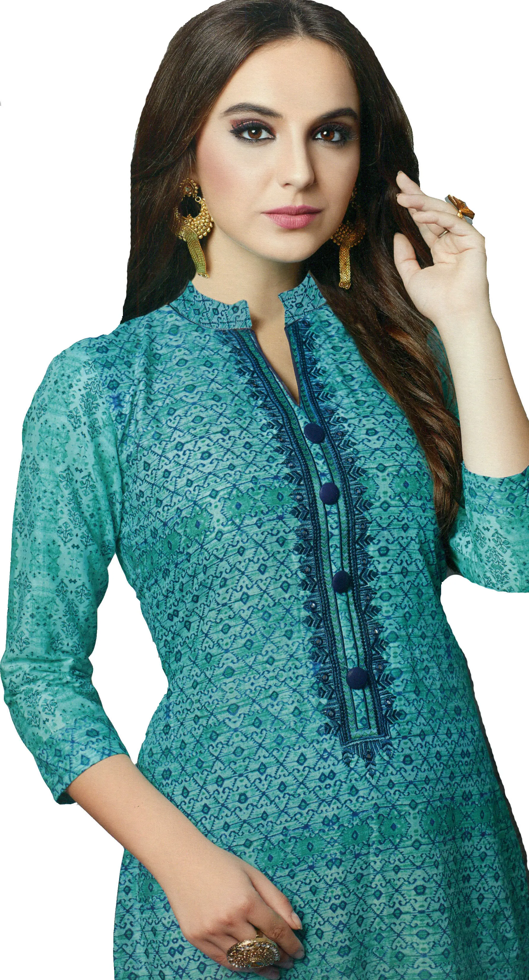 Bright-Aqua Long Printed Palazzo Salwar Kameez Suit with Embroidery on Neck and Mirrors