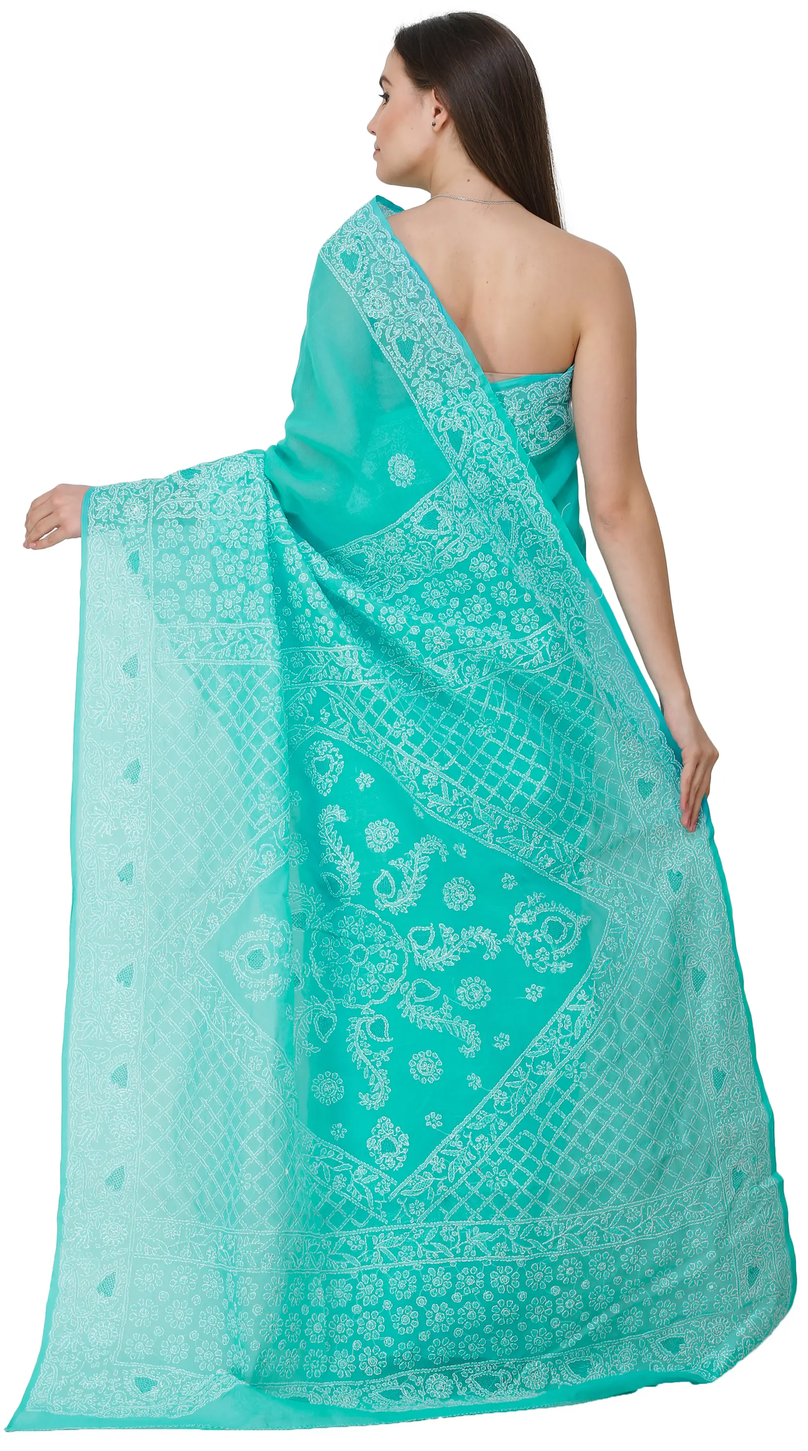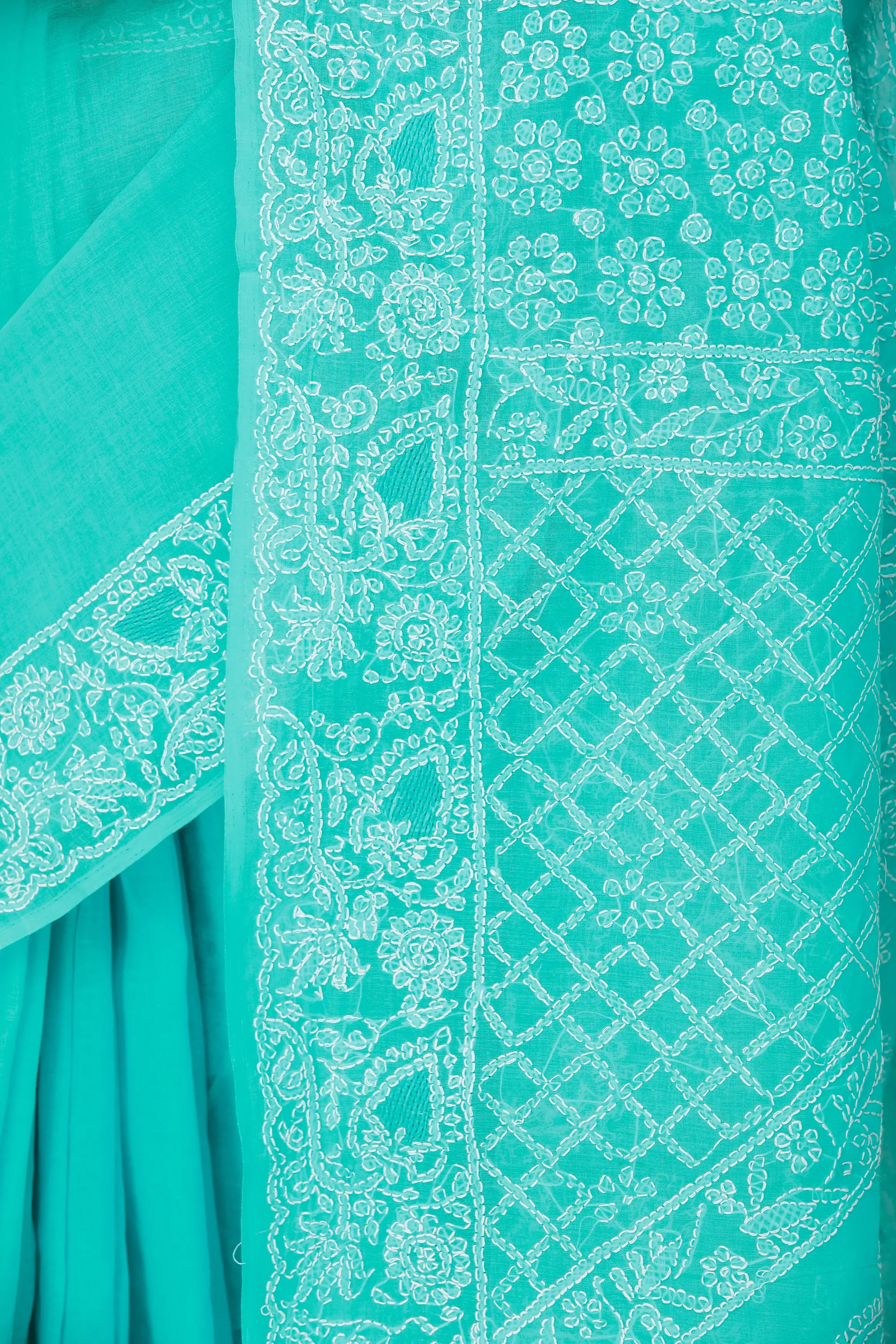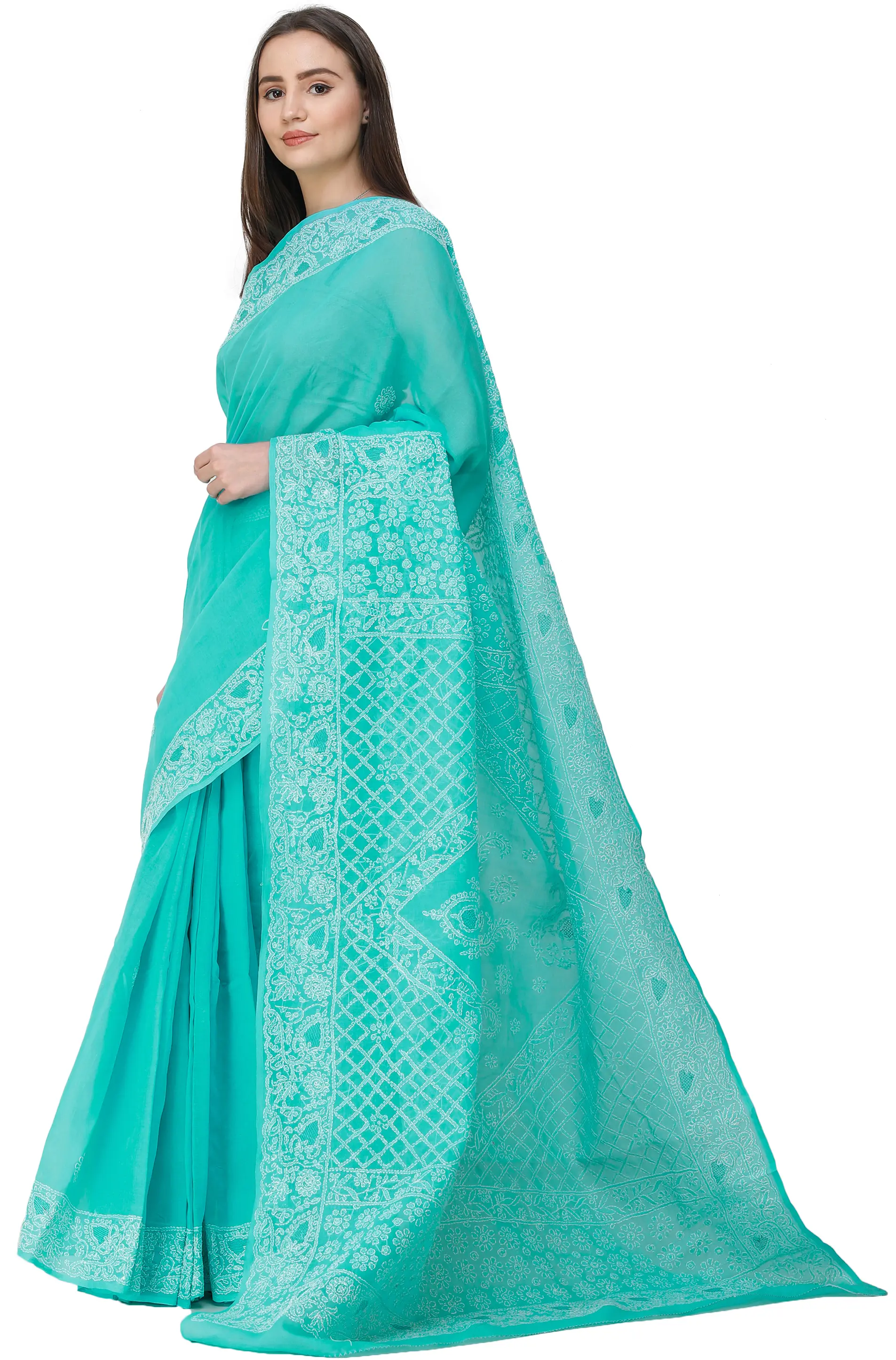 Elevate your elegance with the Bright-Aqua Saree from Lucknow, a soothing yet captivating piece that's perfect for those days when minimal style takes center stage. The charming blue hue of this sari exudes tranquility, while the classic Chikan hand-embroidered Jaal adds a touch of timeless grace.