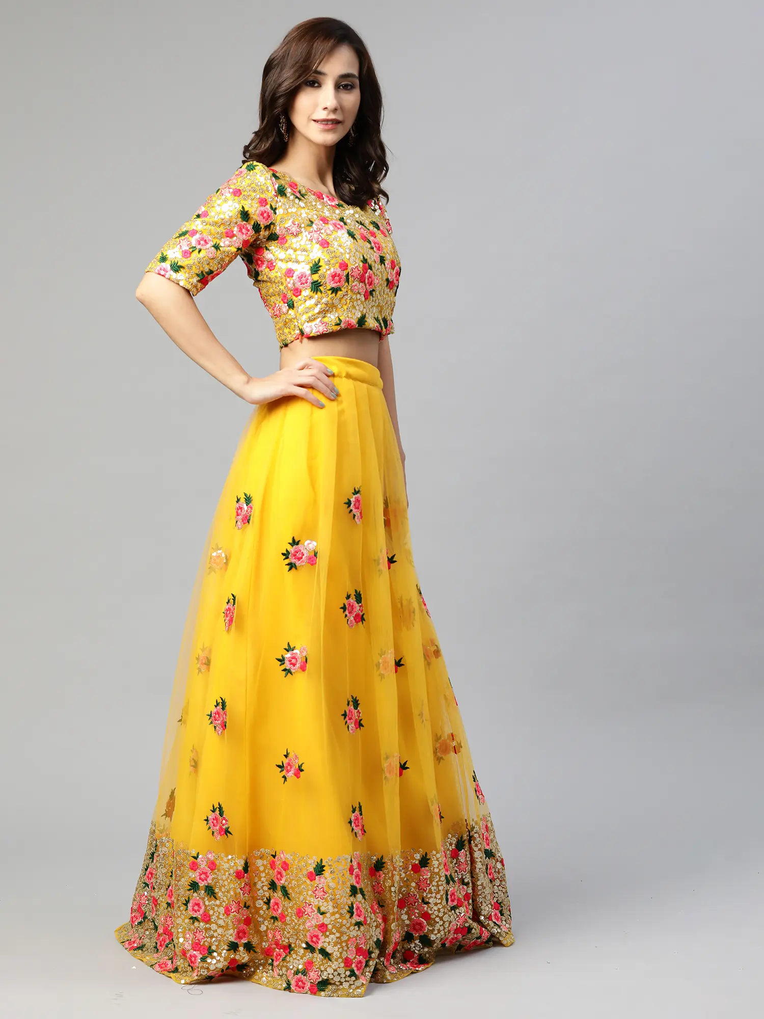 Embrace the spirit of festivity with this exquisite bright yellow lehenga choli, a masterpiece designed to make you shine at any wedding or special occasion. Crafted from delicate net fabric, this ensemble exudes an ethereal charm, promising to turn heads with its captivating design and opulent embellishments. The vibrant yellow hue evokes joy and celebration, making it the perfect choice for auspicious gatherings.