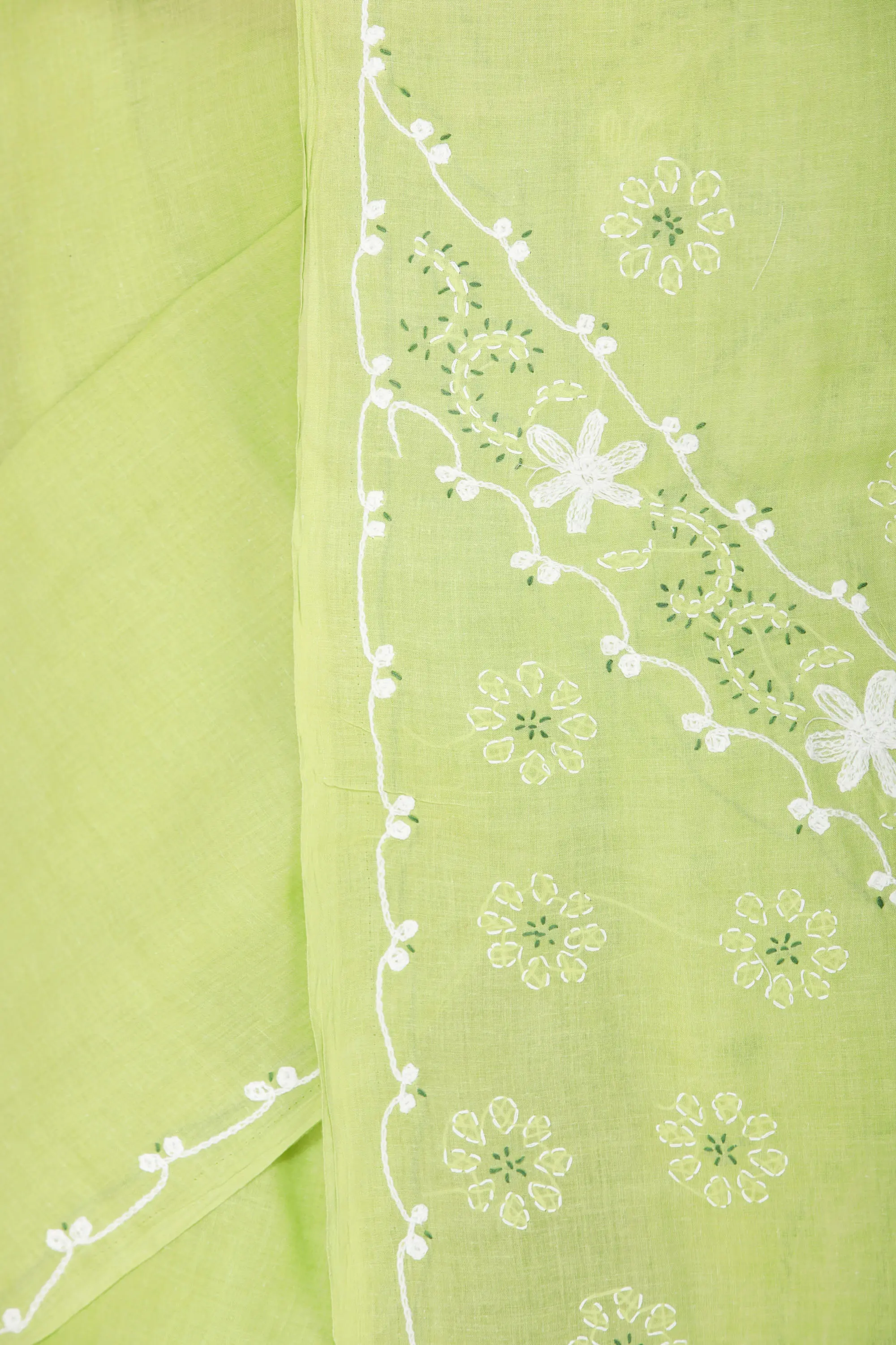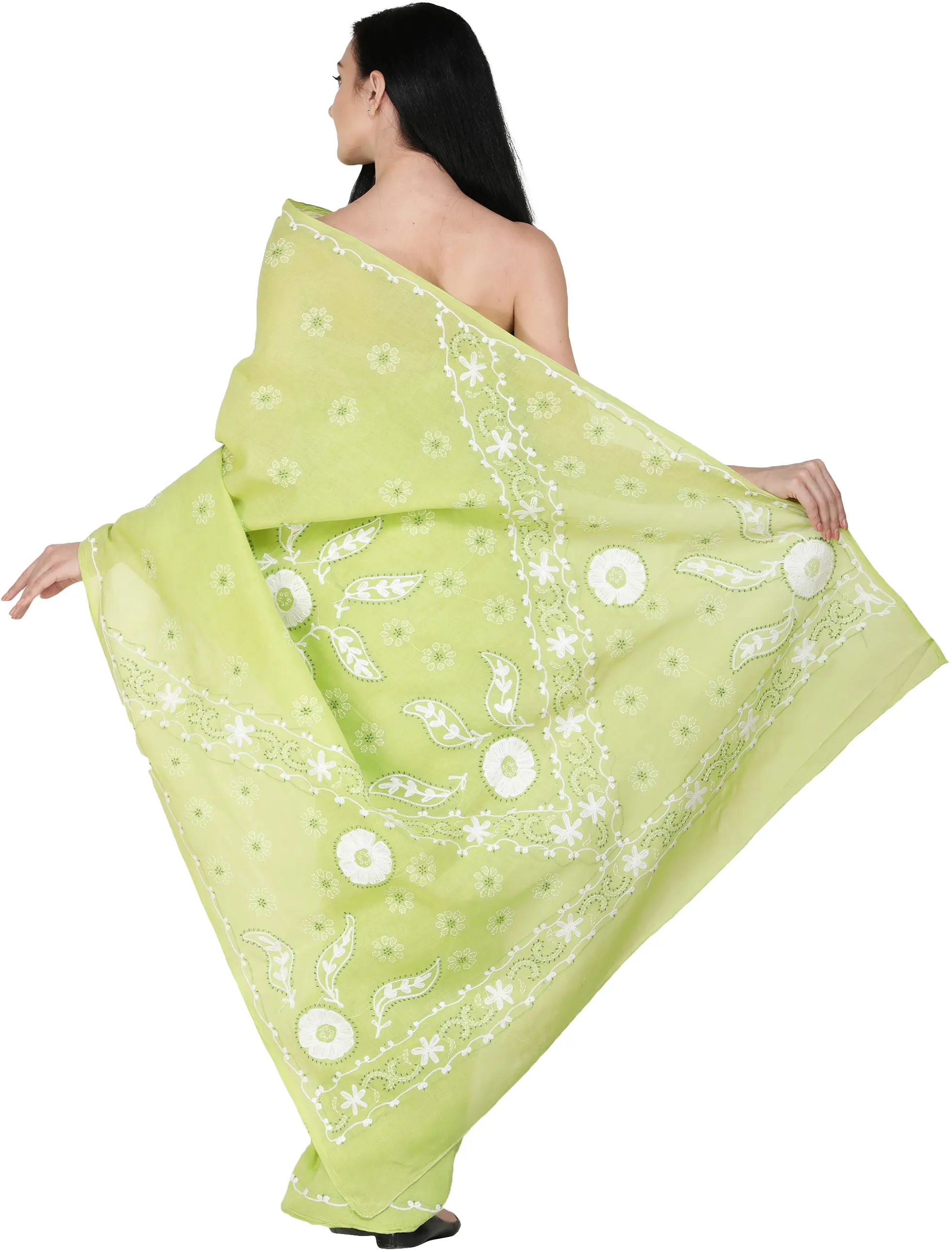 Step into a world of delicate artistry and vibrant charm with this exquisite Lukhnavi Chikan saree. Crafted from pure, breathable cotton, this garment offers unparalleled comfort and a gracefully flowing drape, making it an ideal choice for any occasion. The refreshing bright lime green hue evokes a sense of natural beauty and contemporary style, while the intricate hand embroidery adds a touch of timeless sophistication.