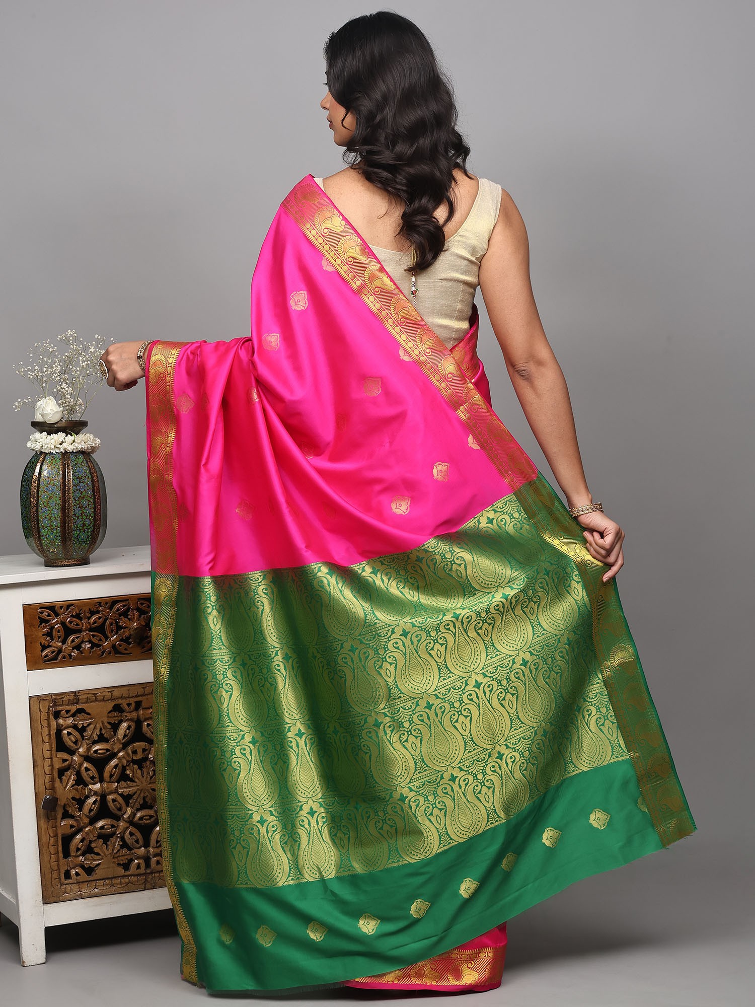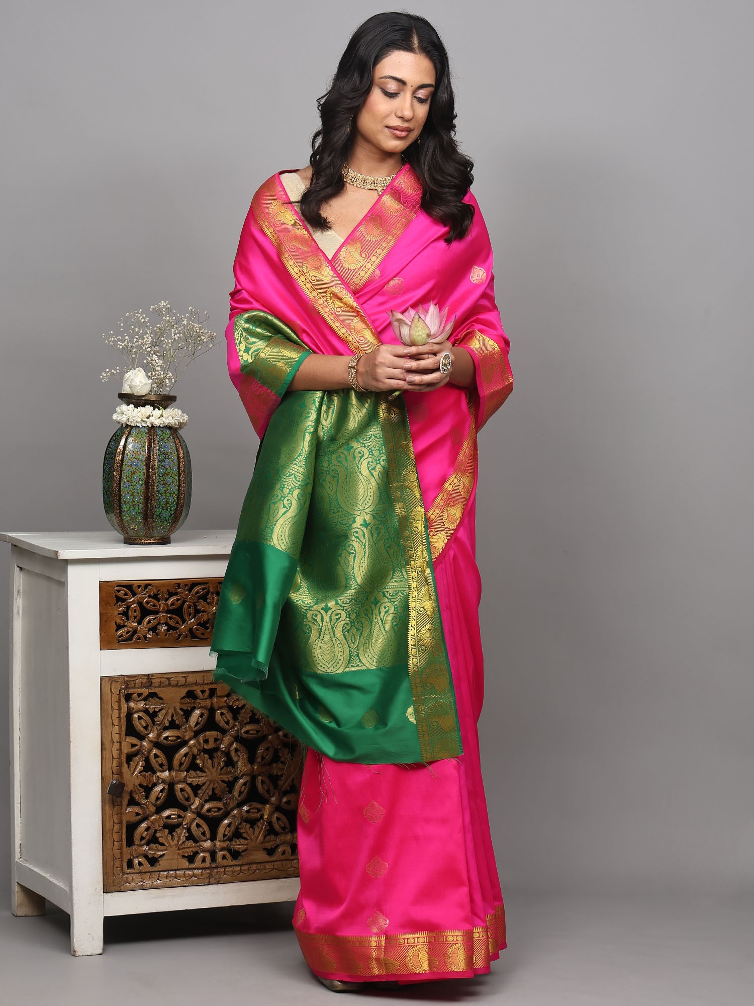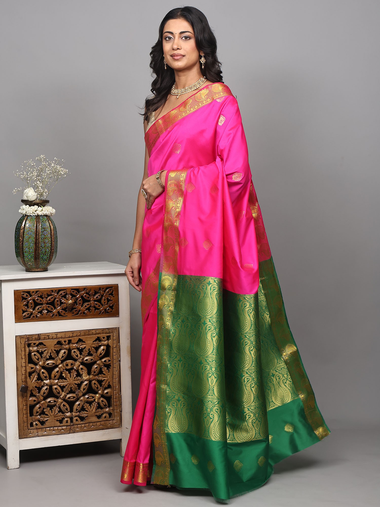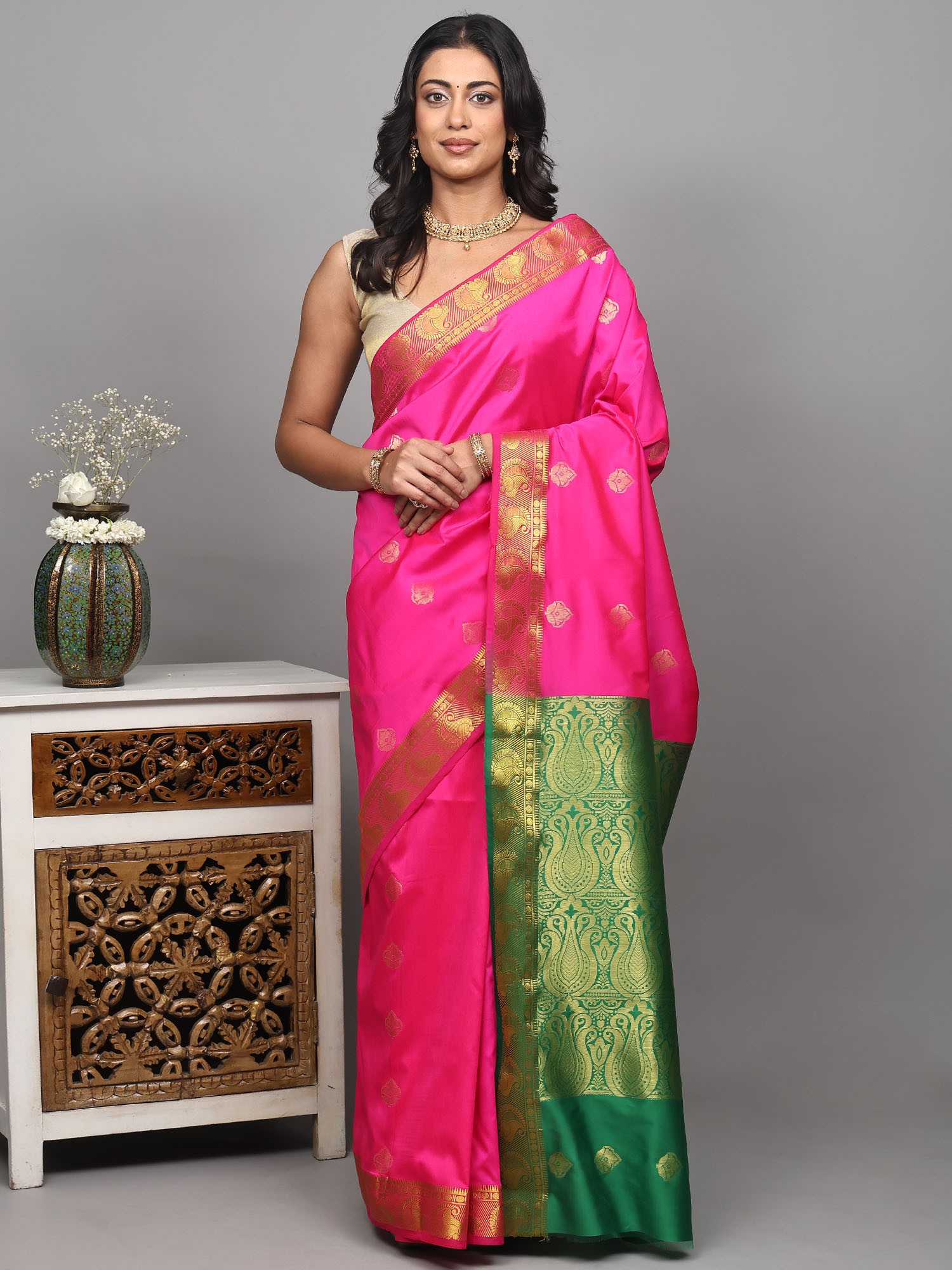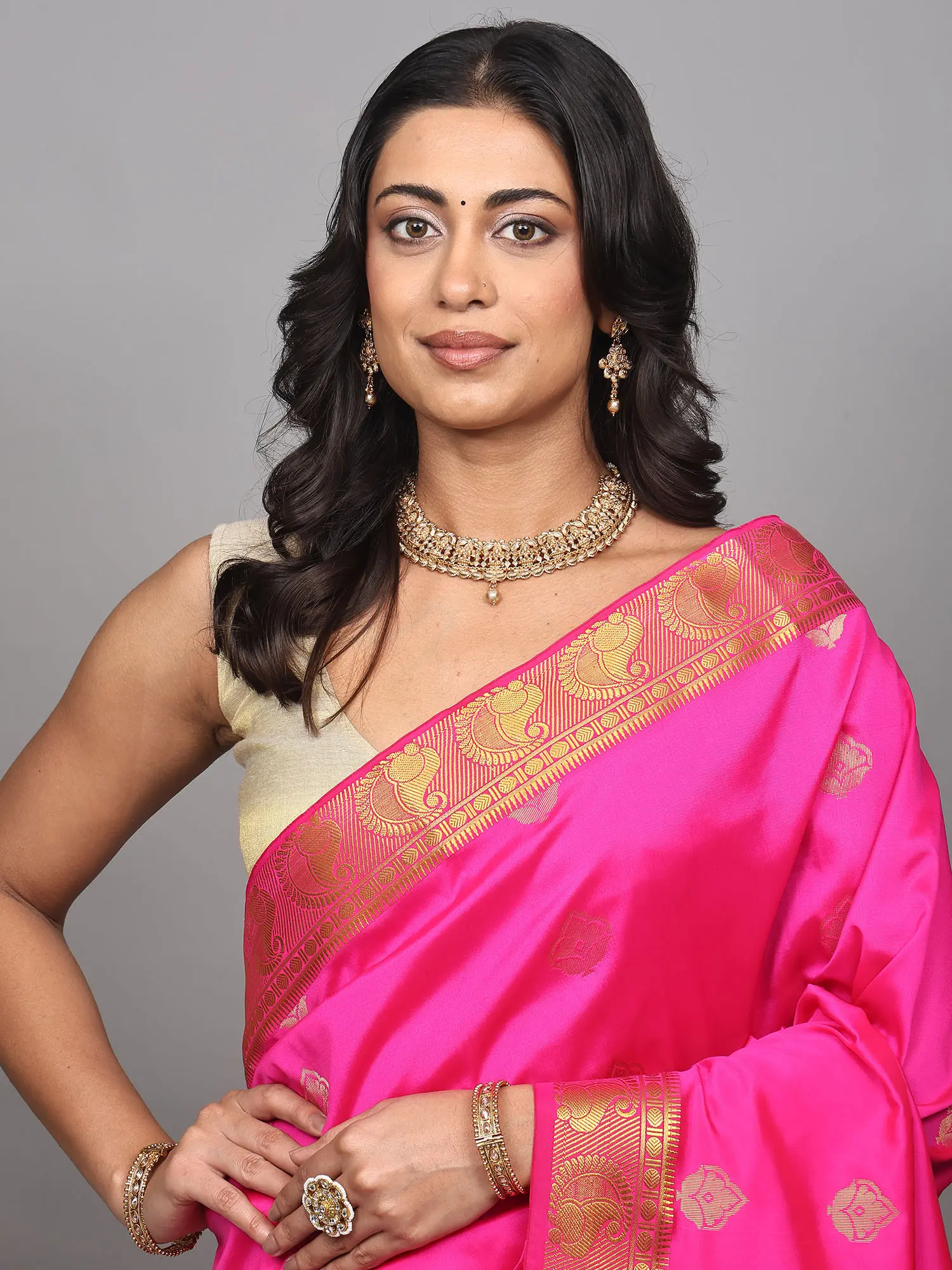 Lilac-Rose Banarasi Saree with Golden Thread Woven Paisleys and Wide Border