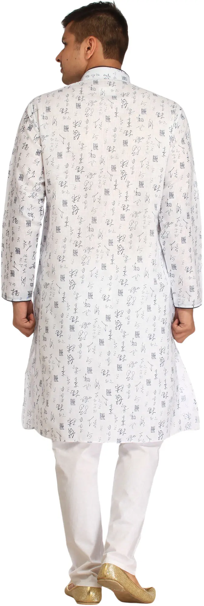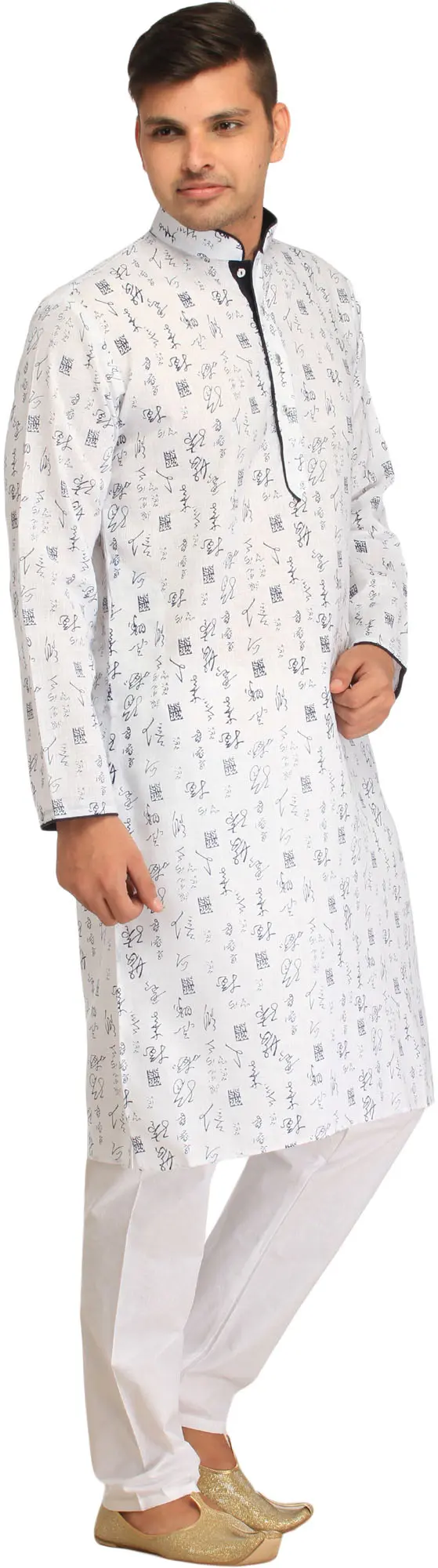Featuring magnificent calligraphic designs, this bright-white casual kurta pajama set will take you into an era of classic beauty. Crafted from pure cotton, this suit provides unparalleled comfort while radiating classy charm. The beautiful calligraphy gives an artistic touch, representing the marriage of tradition and contemporary. This set seamlessly integrates comfort and sophistication, making it ideal for informal events, celebrations, and even a night out. Enjoy the breathable and skin-friendly fabric as it wraps you in elegance.
